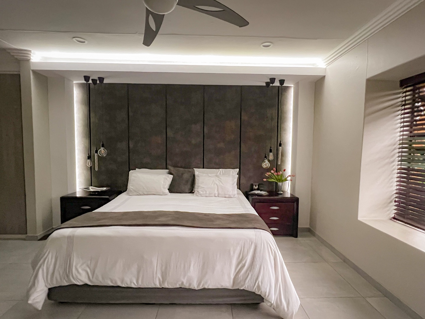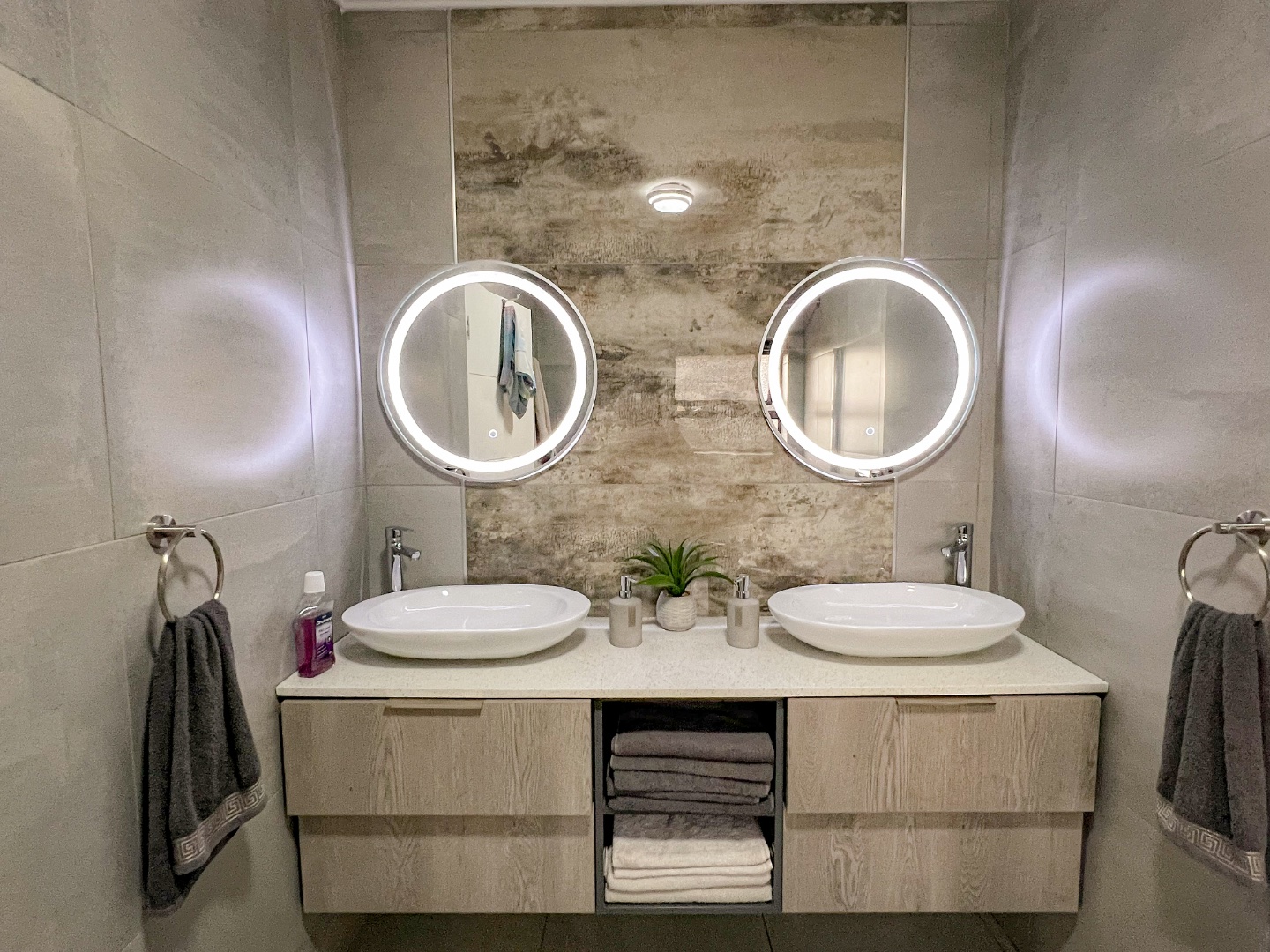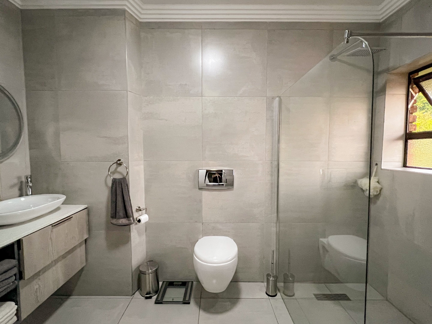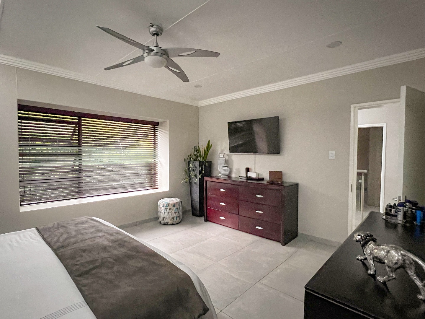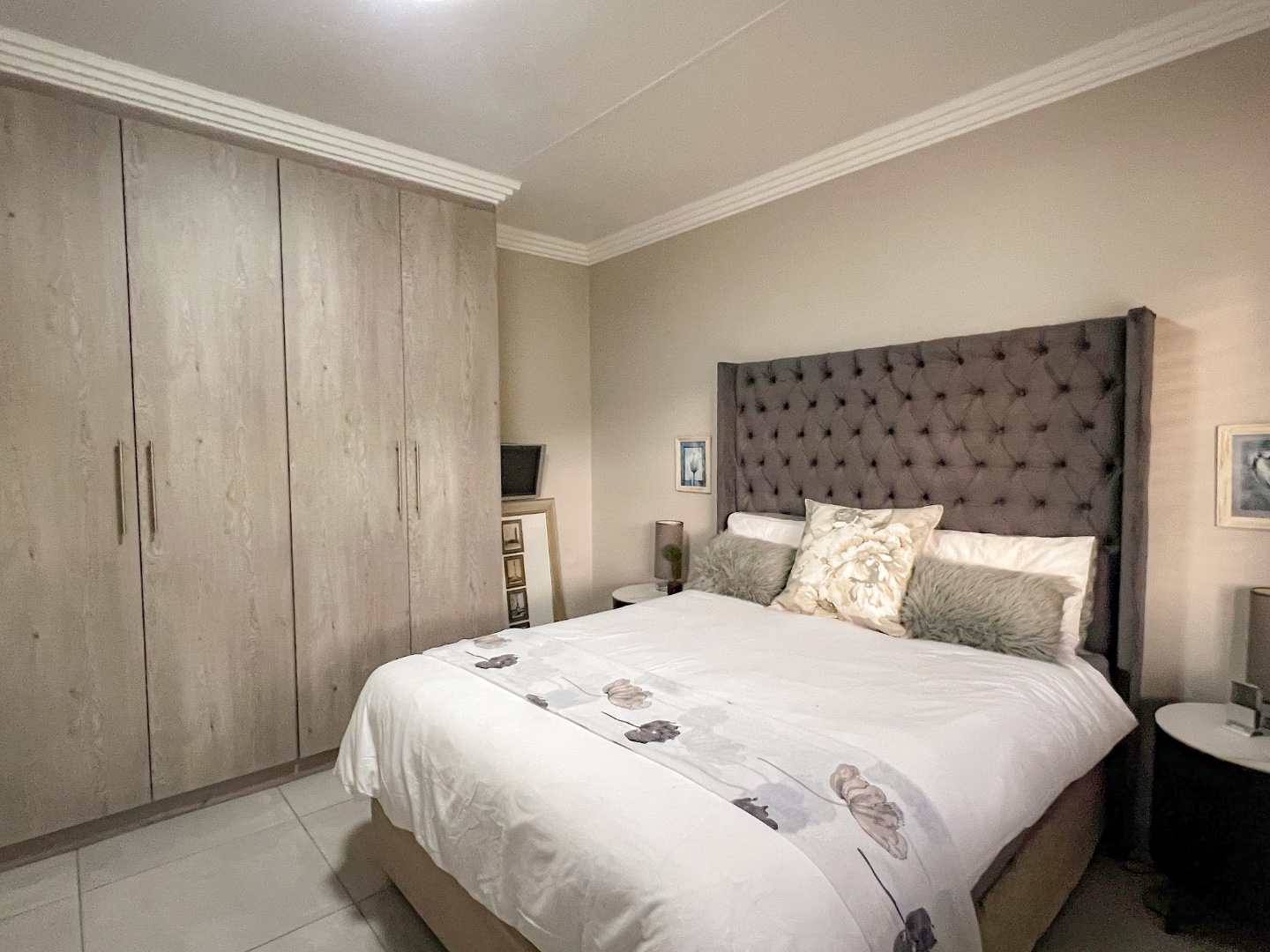 The home comprises three spacious bedrooms and three beautifully appointed bathrooms, ensuring comfort and privacy for family living or guests. The main bedroom is a private sanctuary, featuring a walk-in wardrobe and a stylish en-suite bathroom with a large walk-in shower and elegant double basins.