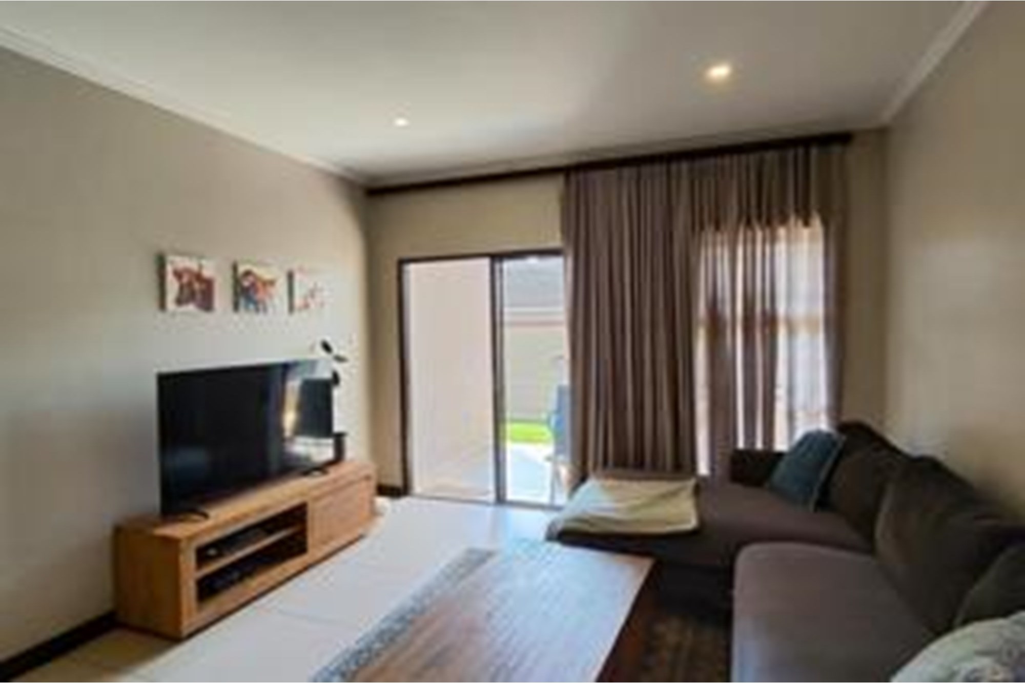 The spacious lounge and dining area flow seamlessly out to a private patio with built-in braai, creating the perfect indoor-outdoor setting for relaxing evenings or hosting friends and family.