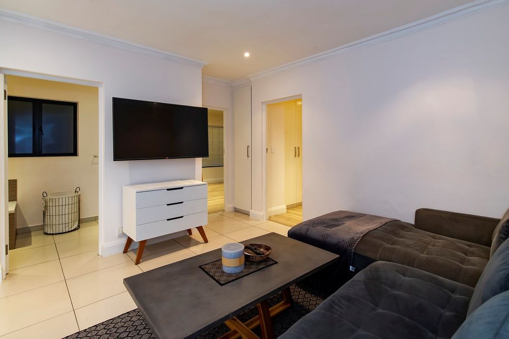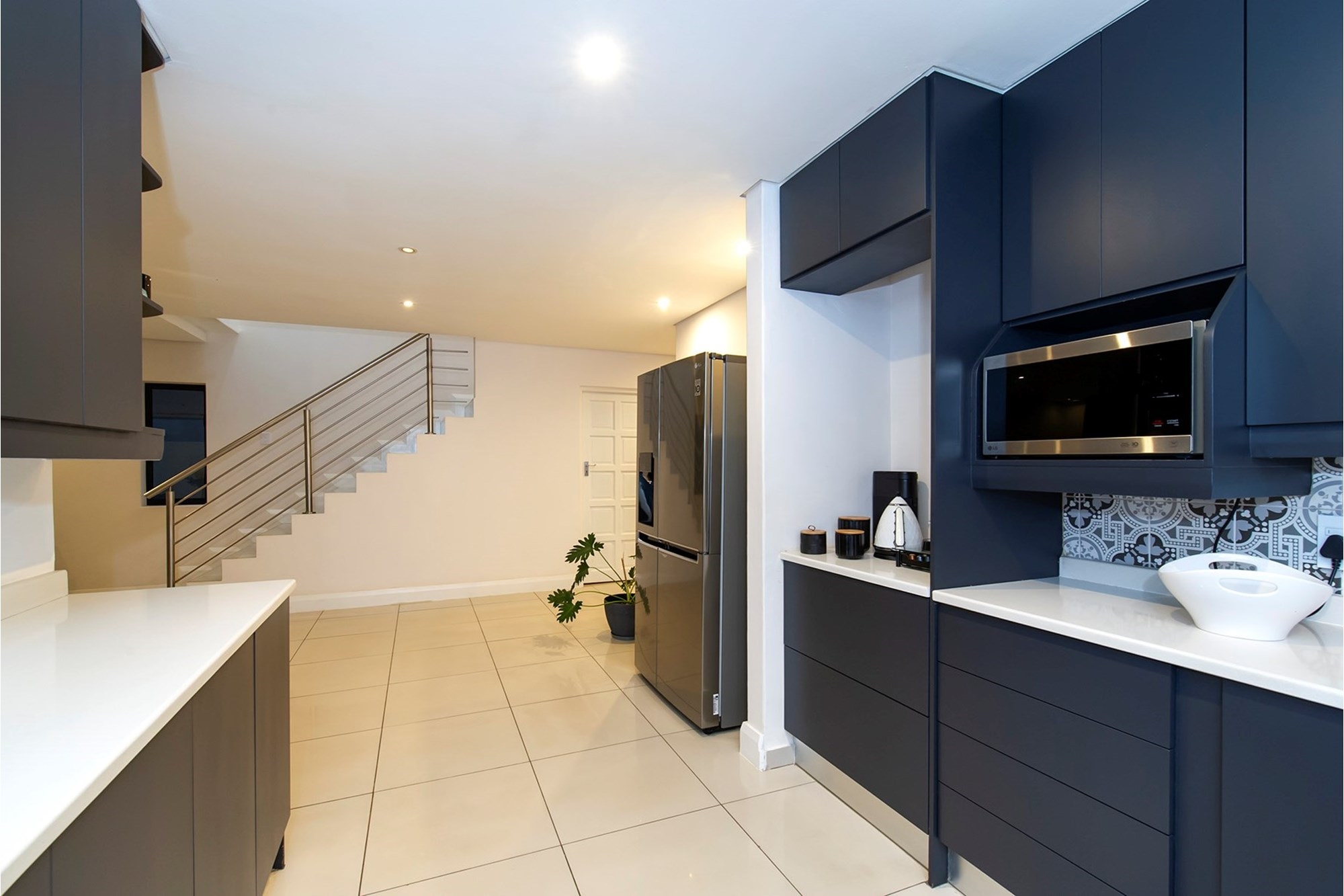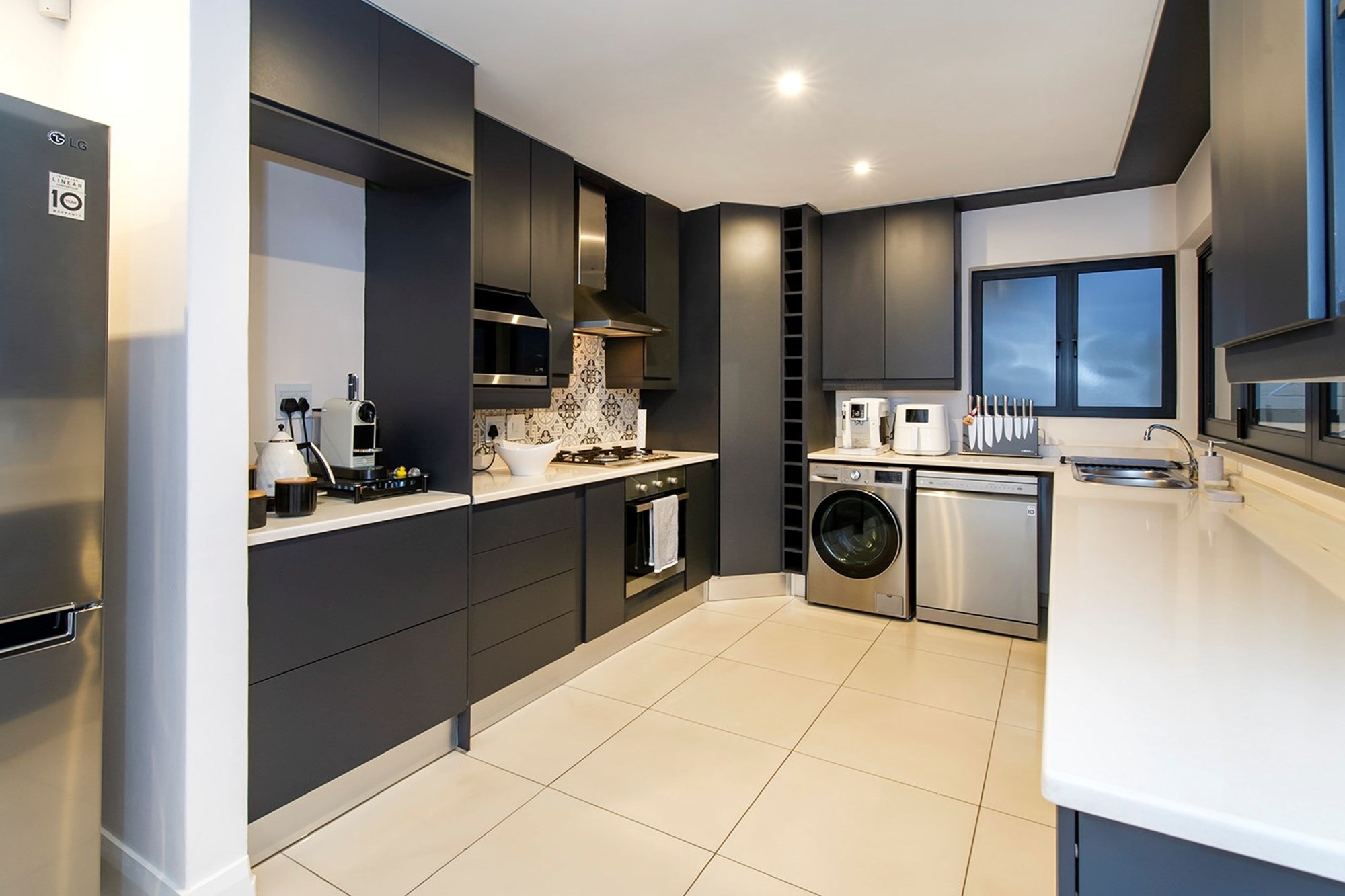 This stunning home features sleek tiled flooring throughout and a fully renovated, designer kitchen fitted with Caesarstone countertops, AEG gas hob, gas stove, and space for two under-counter appliances, ideal for the discerning cook.
