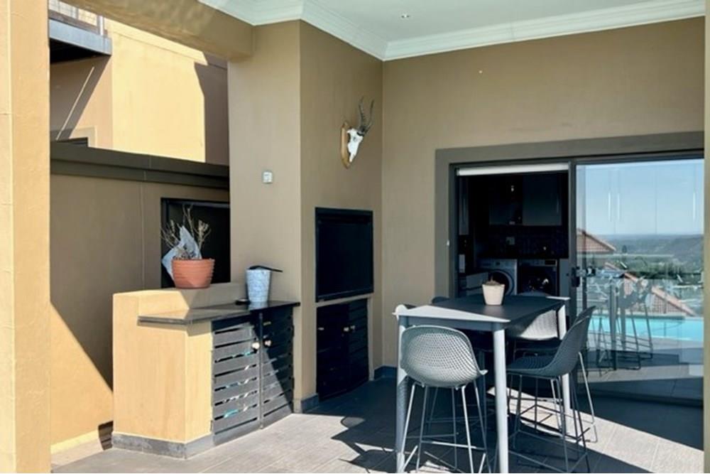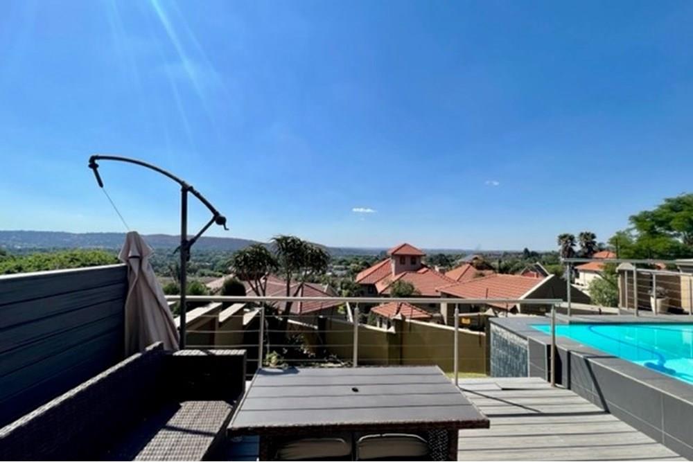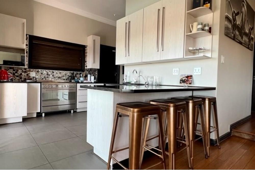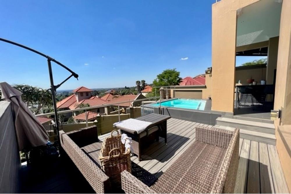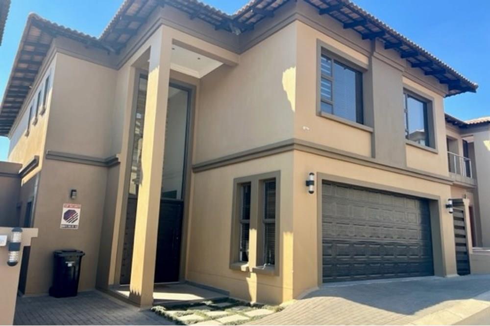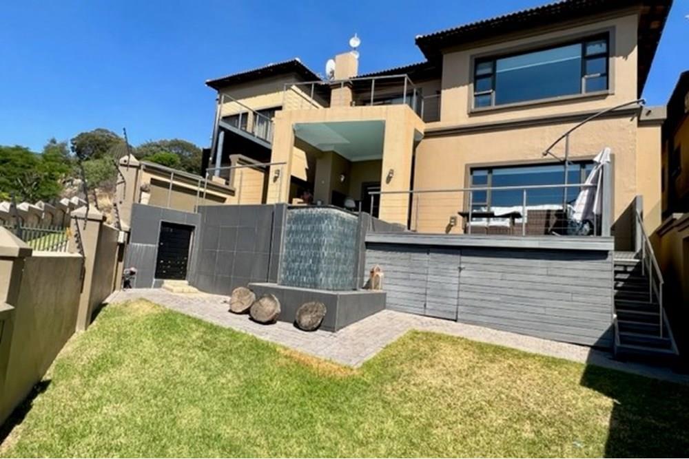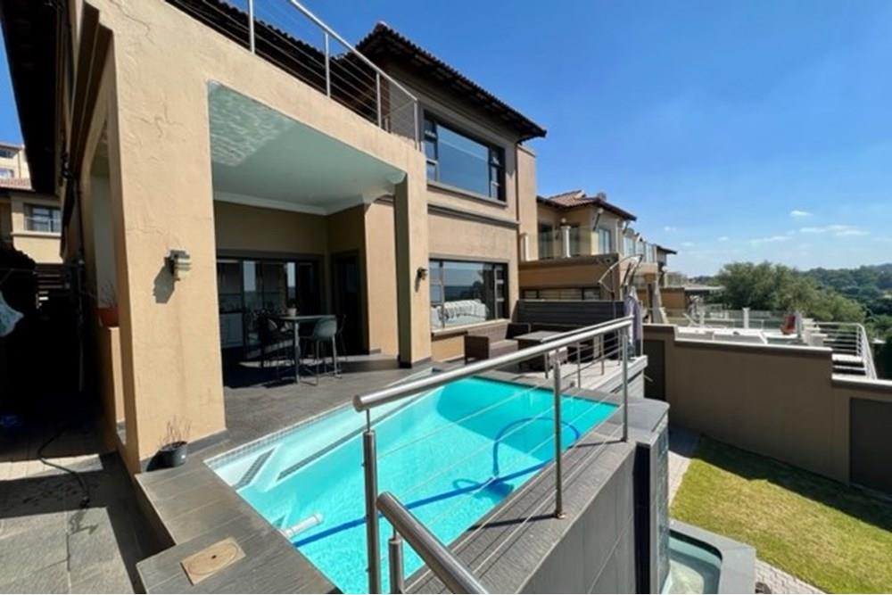 This 4 bedroom, 3 bathroom double storey cluster in a secure complex within a gated community offers fantastic accommodation and is beautifully maintained. An Inviting double volume entrance hall with feature lighting sets the tone as you enter this sun trap. The spacious lounge, dining room and kitchen are well thought out and fitted with bamboo floors, a feature fireplace and large picture windows that ensure plenty of natural light and capitalise on the amazing views, adding to the warmth and style of this exquisite property. The kitchen, lounge and dining room are positioned in such a way, that easy access to the covered verandah, braai, expansive sundeck, infinity pool and garden which make this property an entertainers dream. The first floor consists of 4 spacious bedrooms (2 en-suite bathrooms) complete with bamboo floors, built-in-cupboards and fitted blinds. The grand master suite has a built-in fireplace, walk through dressing room and lovely full bathroom en-suite. Both north facing bedrooms have direct access to the private balcony on the first floor. PLUS; Pre-paid electricity, gas , heated pool, 3 car garage with additional storage, back-up power supply to be installed upon secured lease.,