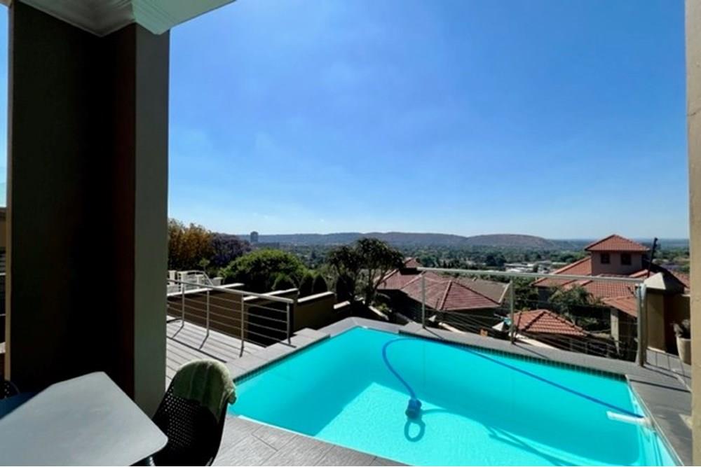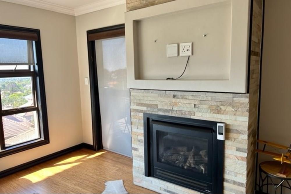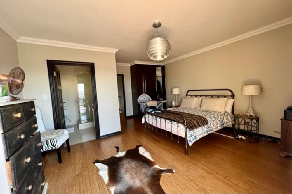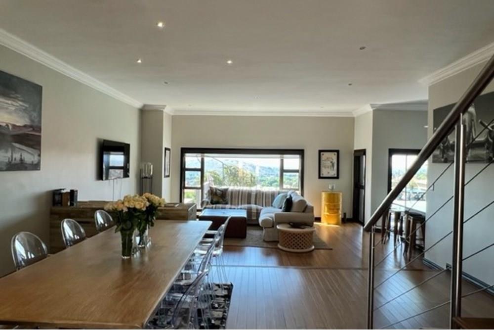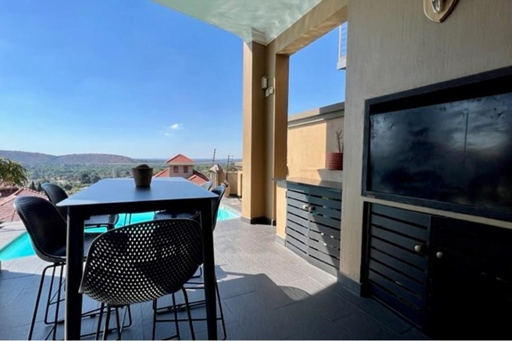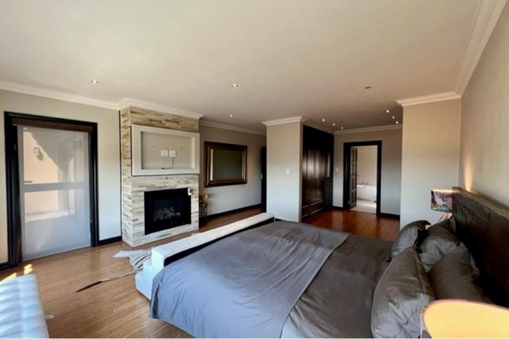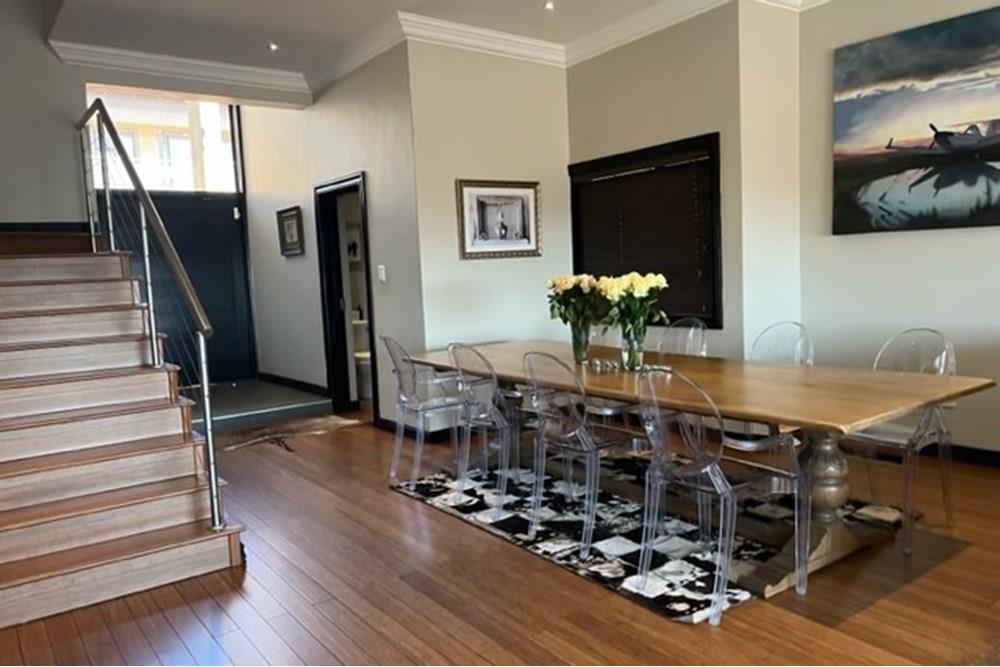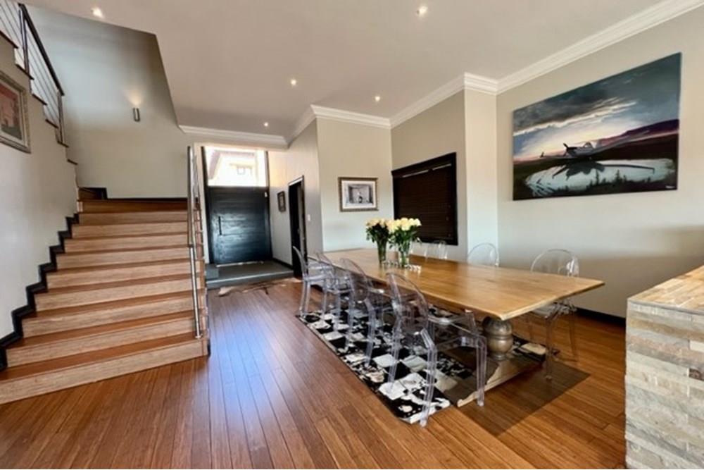 This 4 bedroom, 3 bathroom double storey cluster in a secure complex within a gated community offers fantastic accommodation and is beautifully maintained. An Inviting double volume entrance hall with feature lighting sets the tone as you enter this sun trap. The spacious lounge, dining room and kitchen are well thought out and fitted with bamboo floors, a feature fireplace and large picture windows that ensure plenty of natural light and capitalise on the amazing views, adding to the warmth and style of this exquisite property. The kitchen, lounge and dining room are positioned in such a way, that easy access to the covered verandah, braai, expansive sundeck, infinity pool and garden which make this property an entertainers dream. The first floor consists of 4 spacious bedrooms (2 en-suite bathrooms) complete with bamboo floors, built-in-cupboards and fitted blinds. The grand master suite has a built-in fireplace, walk through dressing room and lovely full bathroom en-suite. Both north facing bedrooms have direct access to the private balcony on the first floor. PLUS; Pre-paid electricity, gas , heated pool, 3 car garage with additional storage, back-up power supply to be installed upon secured lease.,