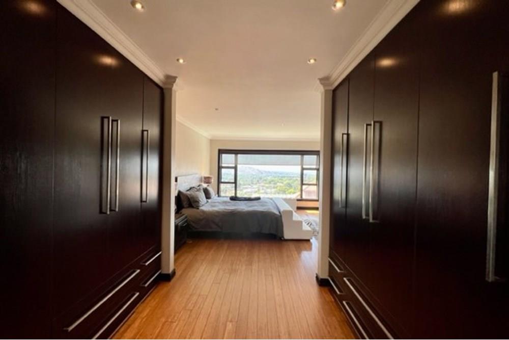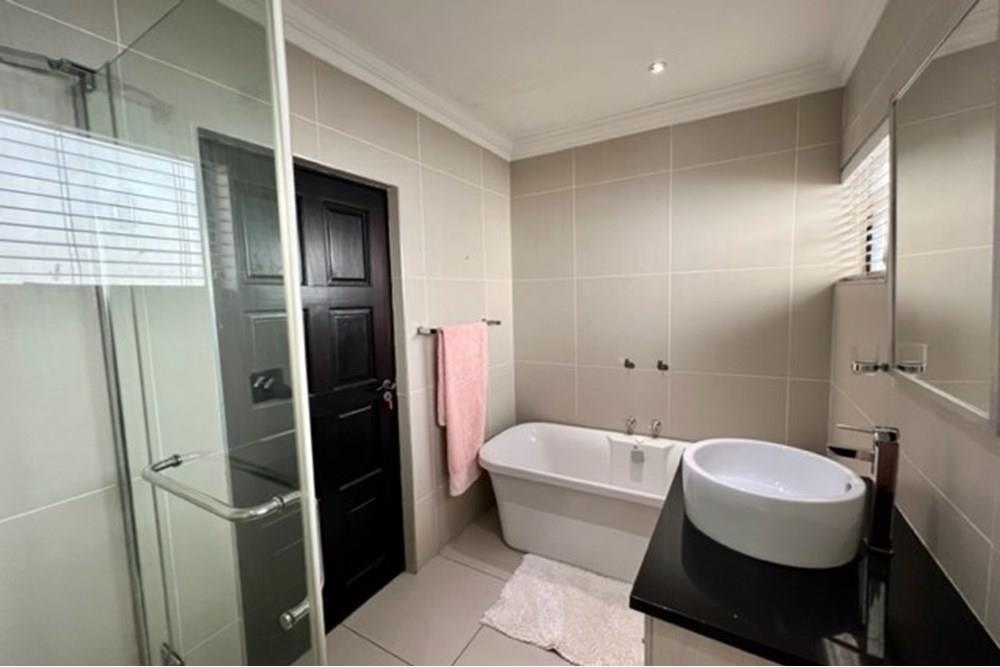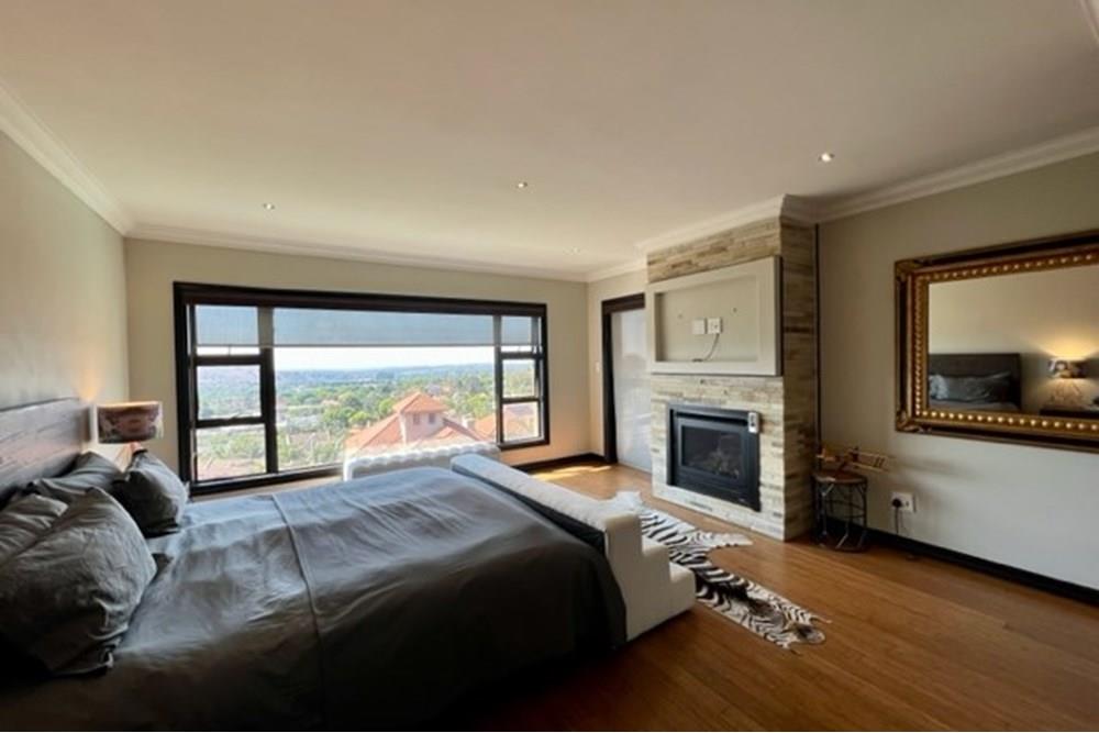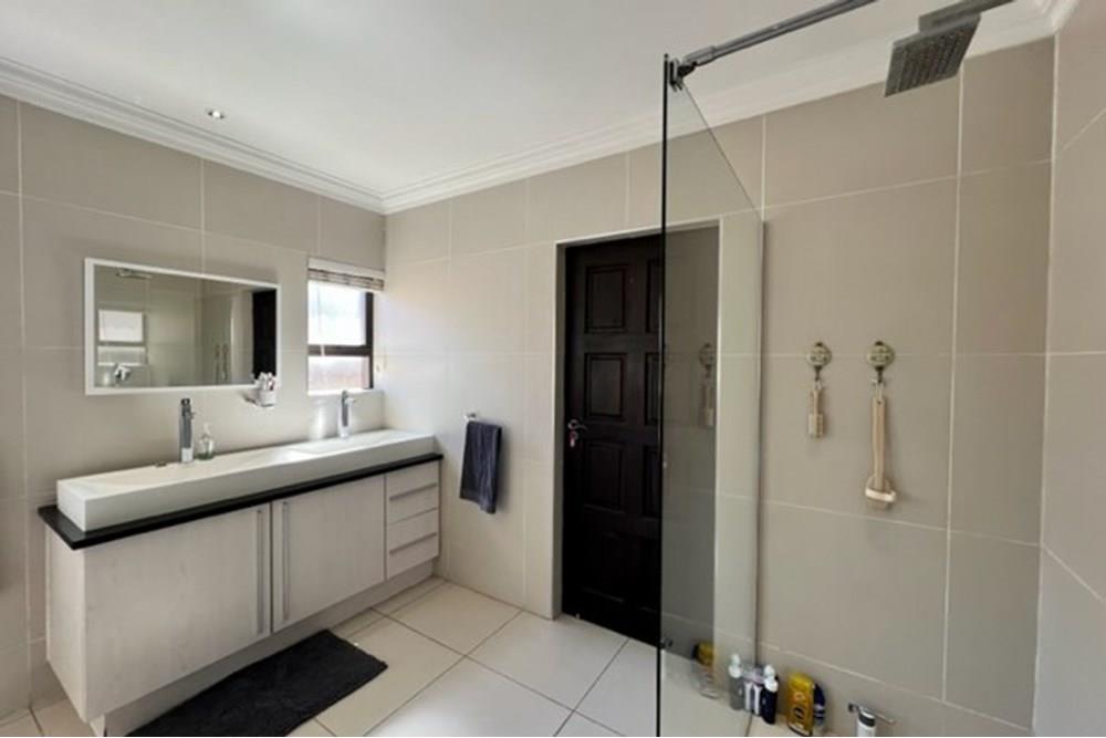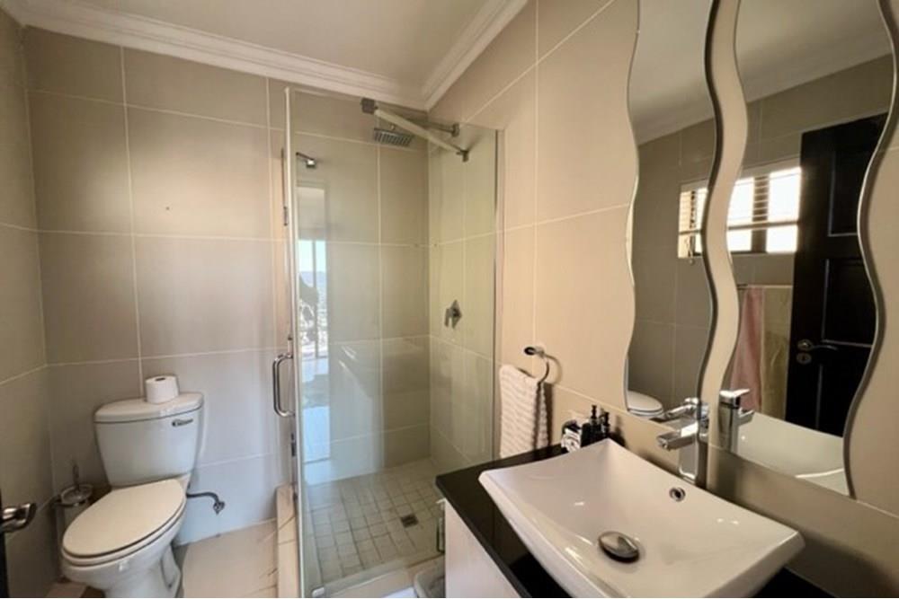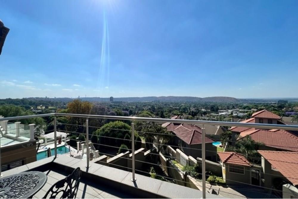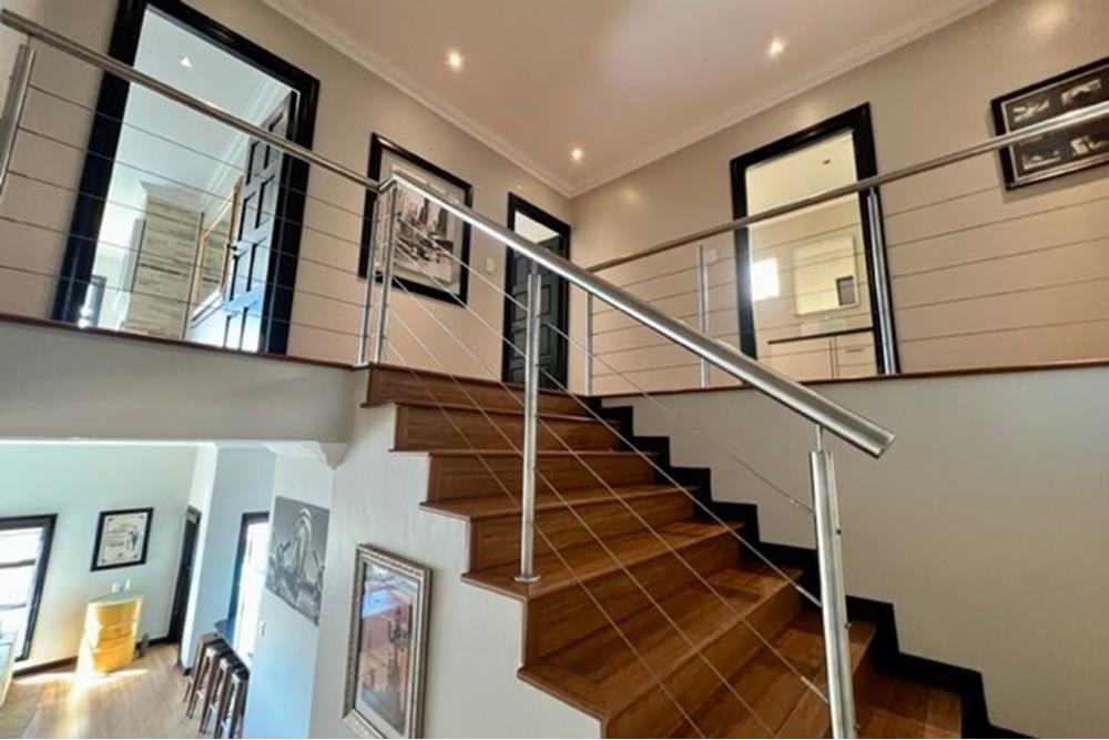 This 4 bedroom, 3 bathroom double storey cluster in a secure complex within a gated community offers fantastic accommodation and is beautifully maintained. An Inviting double volume entrance hall with feature lighting sets the tone as you enter this sun trap. The spacious lounge, dining room and kitchen are well thought out and fitted with bamboo floors, a feature fireplace and large picture windows that ensure plenty of natural light and capitalise on the amazing views, adding to the warmth and style of this exquisite property. The kitchen, lounge and dining room are positioned in such a way, that easy access to the covered verandah, braai, expansive sundeck, infinity pool and garden which make this property an entertainers dream. The first floor consists of 4 spacious bedrooms (2 en-suite bathrooms) complete with bamboo floors, built-in-cupboards and fitted blinds. The grand master suite has a built-in fireplace, walk through dressing room and lovely full bathroom en-suite. Both north facing bedrooms have direct access to the private balcony on the first floor. PLUS; Pre-paid electricity, gas , heated pool, 3 car garage with additional storage, back-up power supply to be installed upon secured lease.,