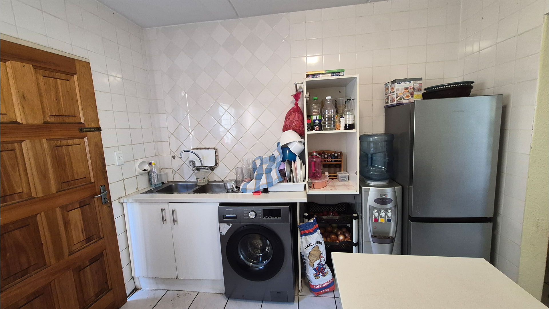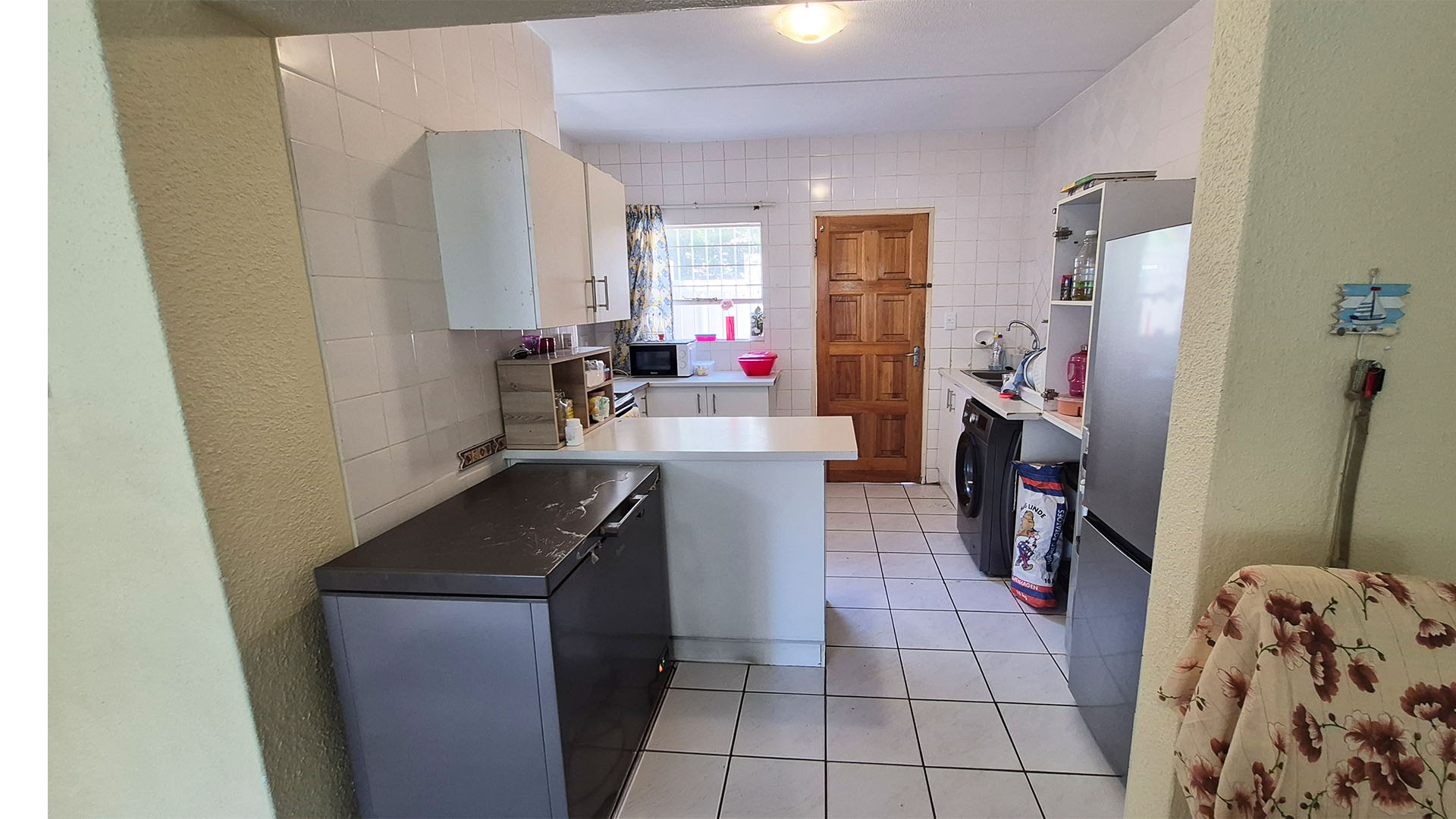 A semi-modern, functional kitchen with plenty of storage.