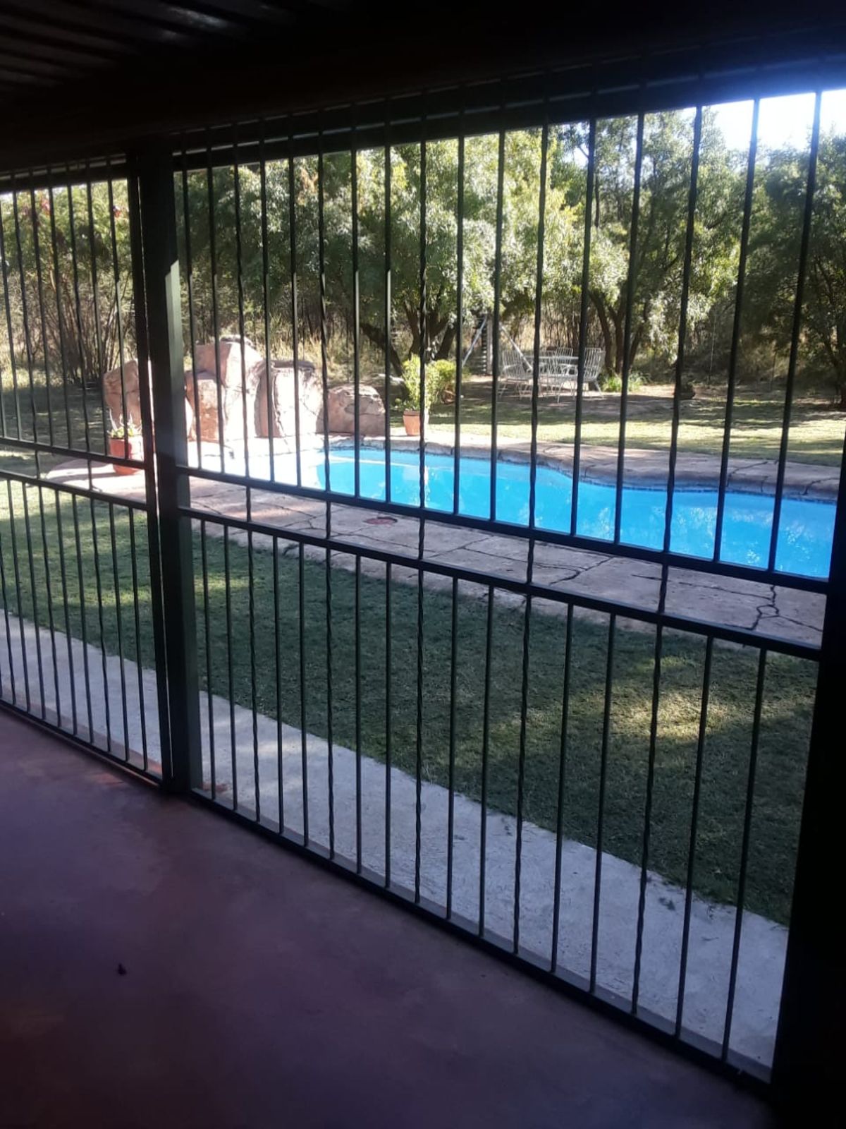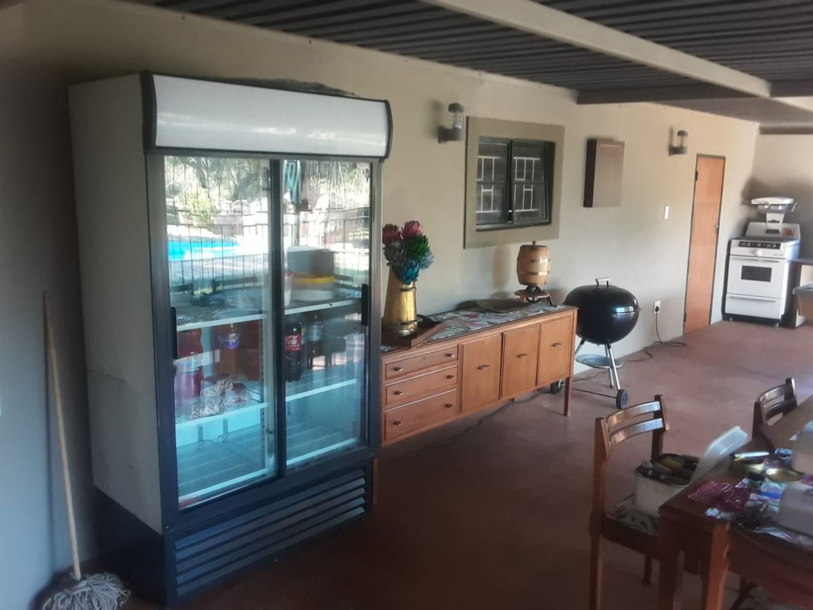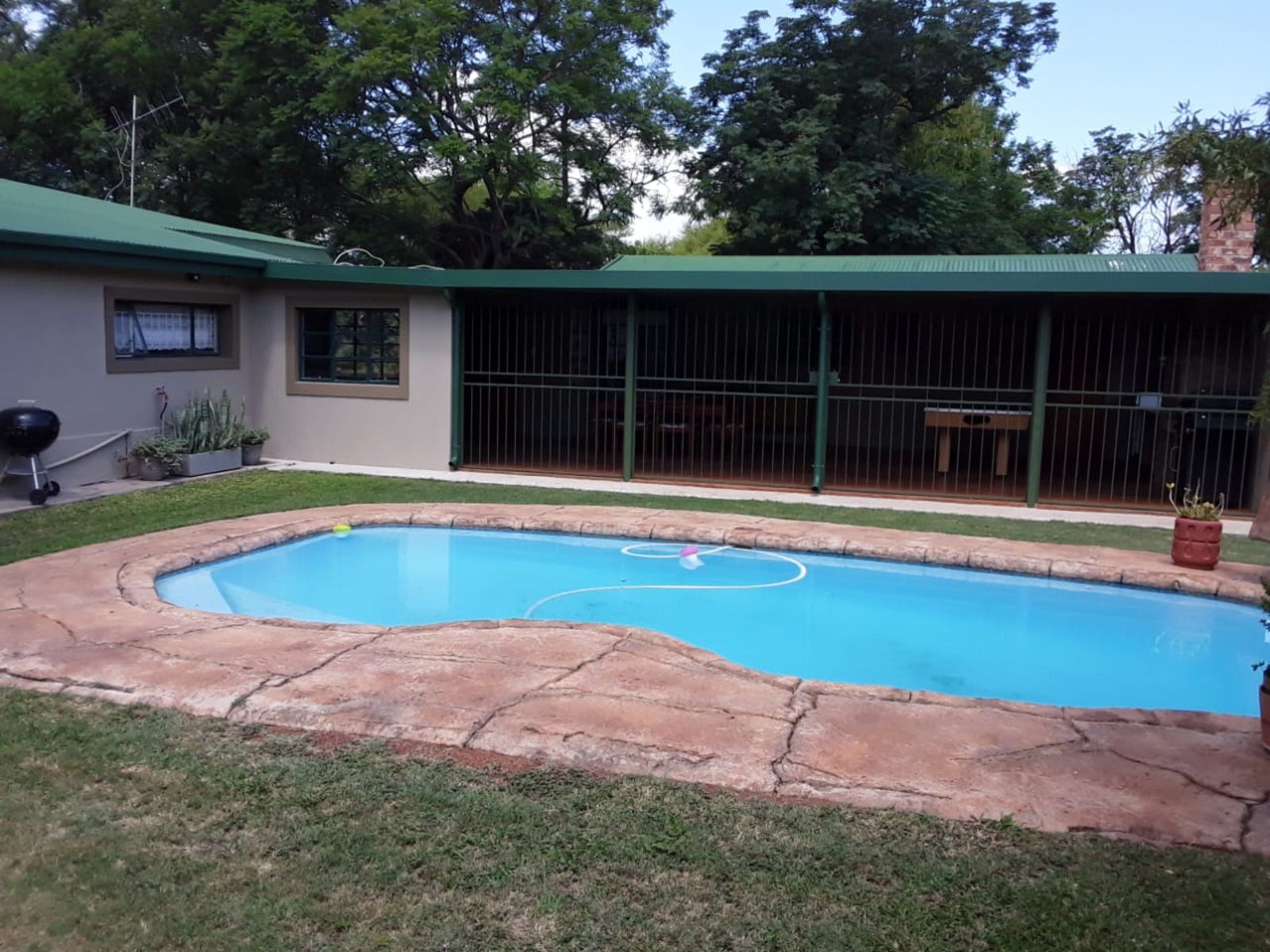 Step outside to an inviting entertainment area equipped with a built-in braai, perfect for hosting gatherings. The sparkling pool adds to the allure of outdoor living, while the extensive covered parking area offers space for 6-10 vehicles. The property is also equipped with a borehole, ensuring a reliable and sufficient water supply for all your needs.