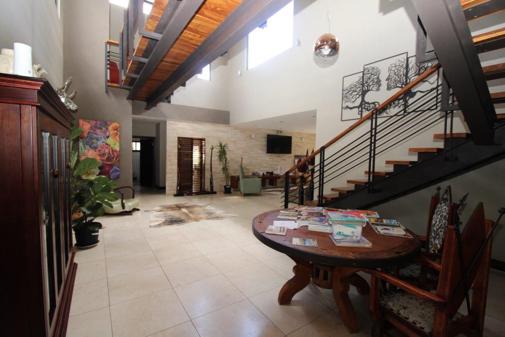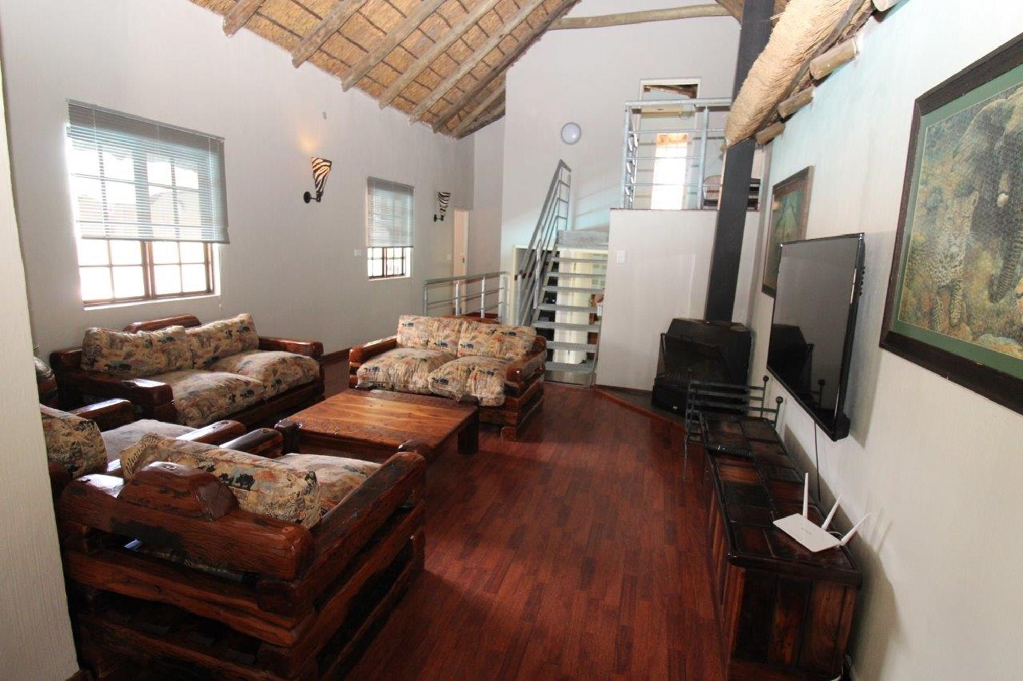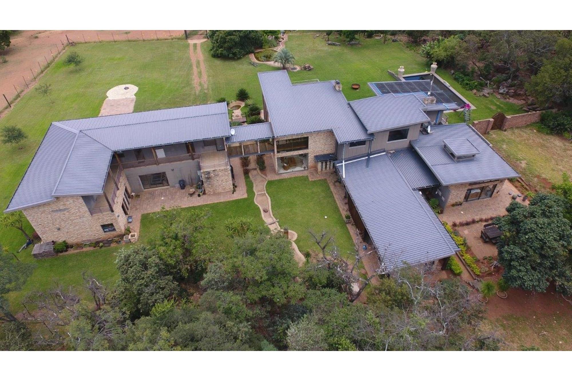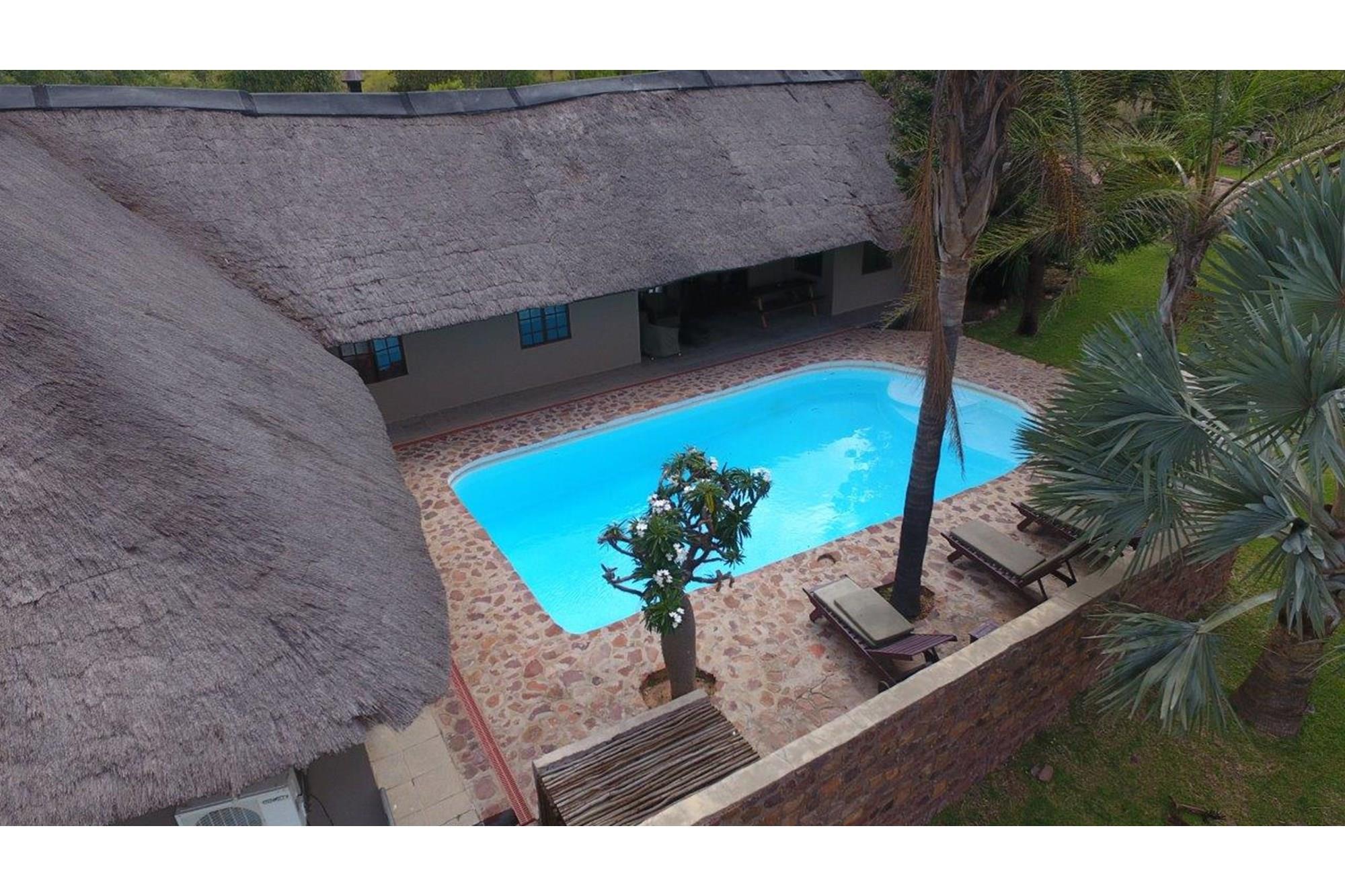 Luxurious 5 bedroom and 5 bathroom house with three lounges, dining room and modern and well equipped kitchen. Two studies and four garages including 1 hanger for the helicopter (helicopter not included) and Heli-Pad. Large swimming pool and well established and manicured garden overlooking the Waterberg mountains.ALL THE OWNER`S HOUSE FURNITURE NOW INCLUDED.