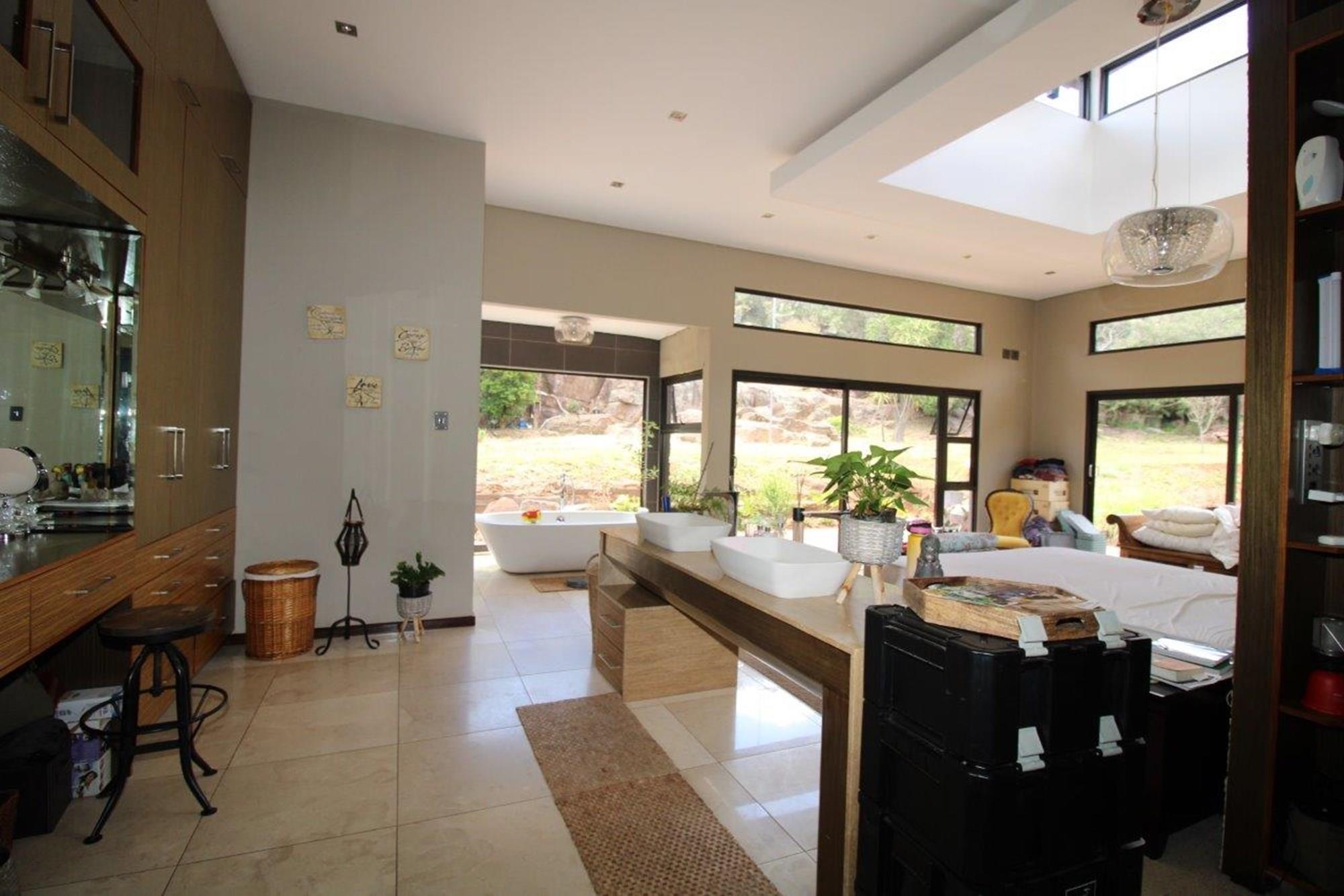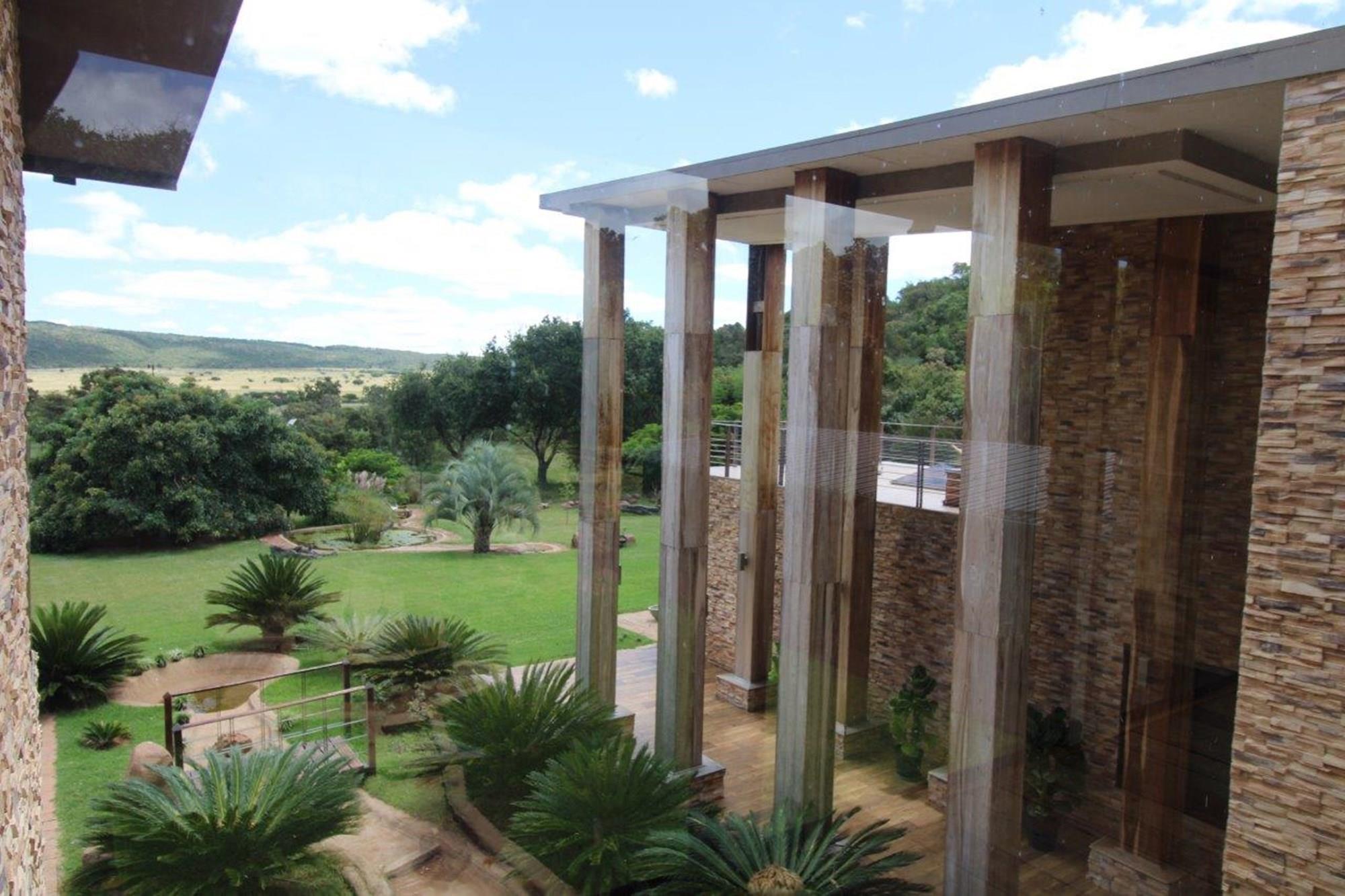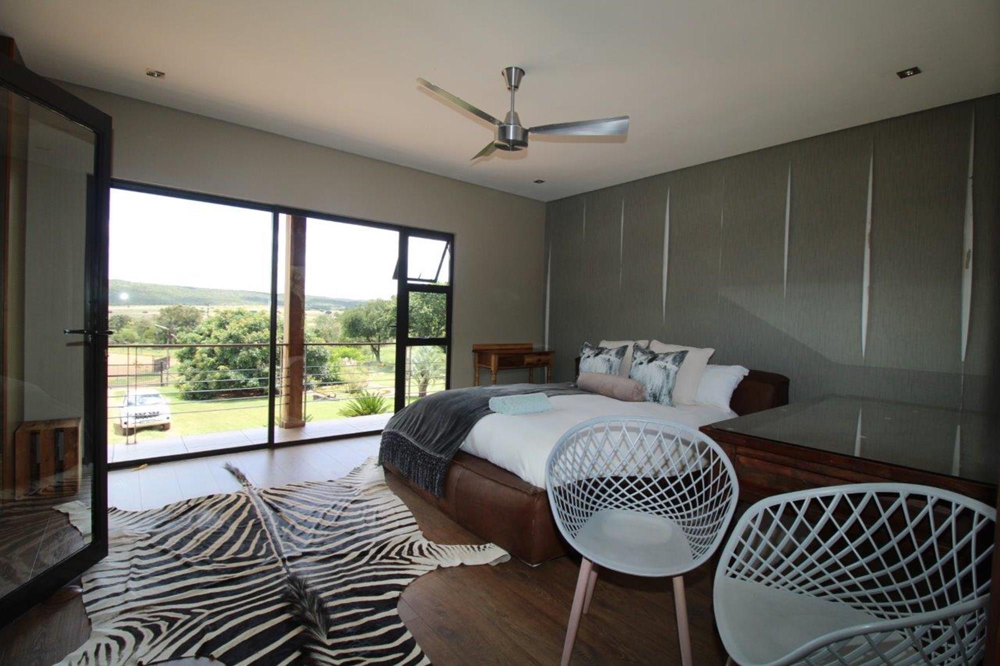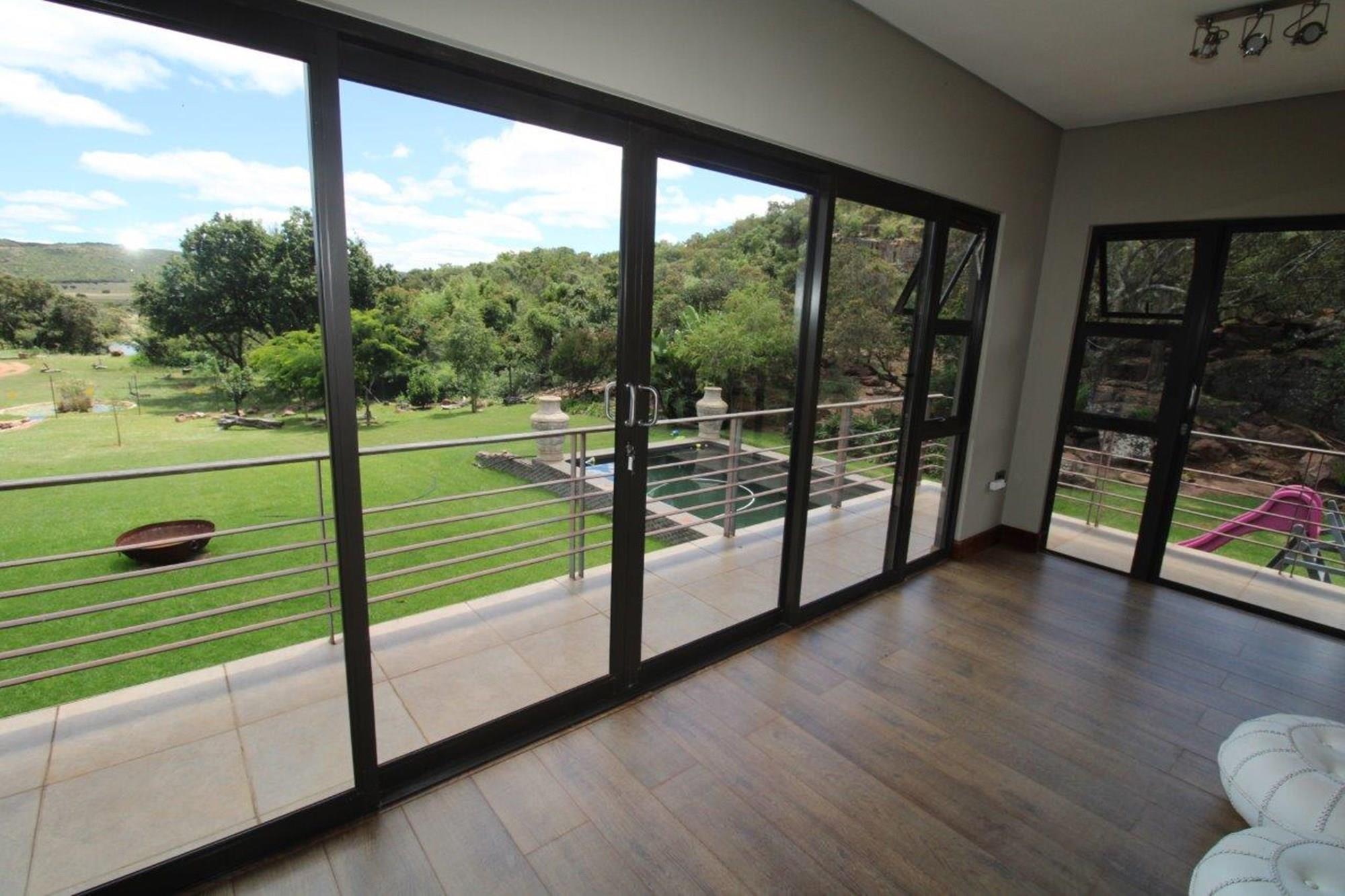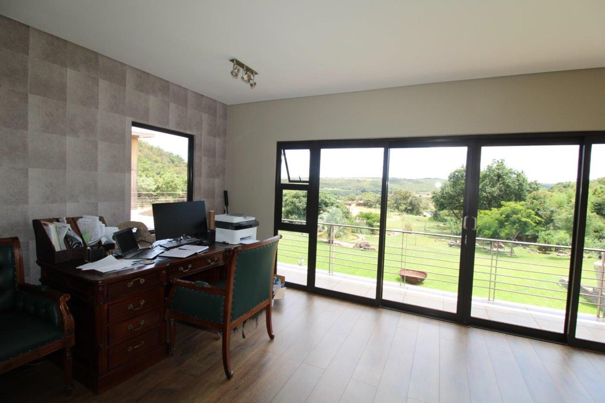 Luxurious 5 bedroom and 5 bathroom house with three lounges, dining room and modern and well equipped kitchen. Two studies and four garages including 1 hanger for the helicopter (helicopter not included) and Heli-Pad. Large swimming pool and well established and manicured garden overlooking the Waterberg mountains.ALL THE OWNER`S HOUSE FURNITURE NOW INCLUDED.