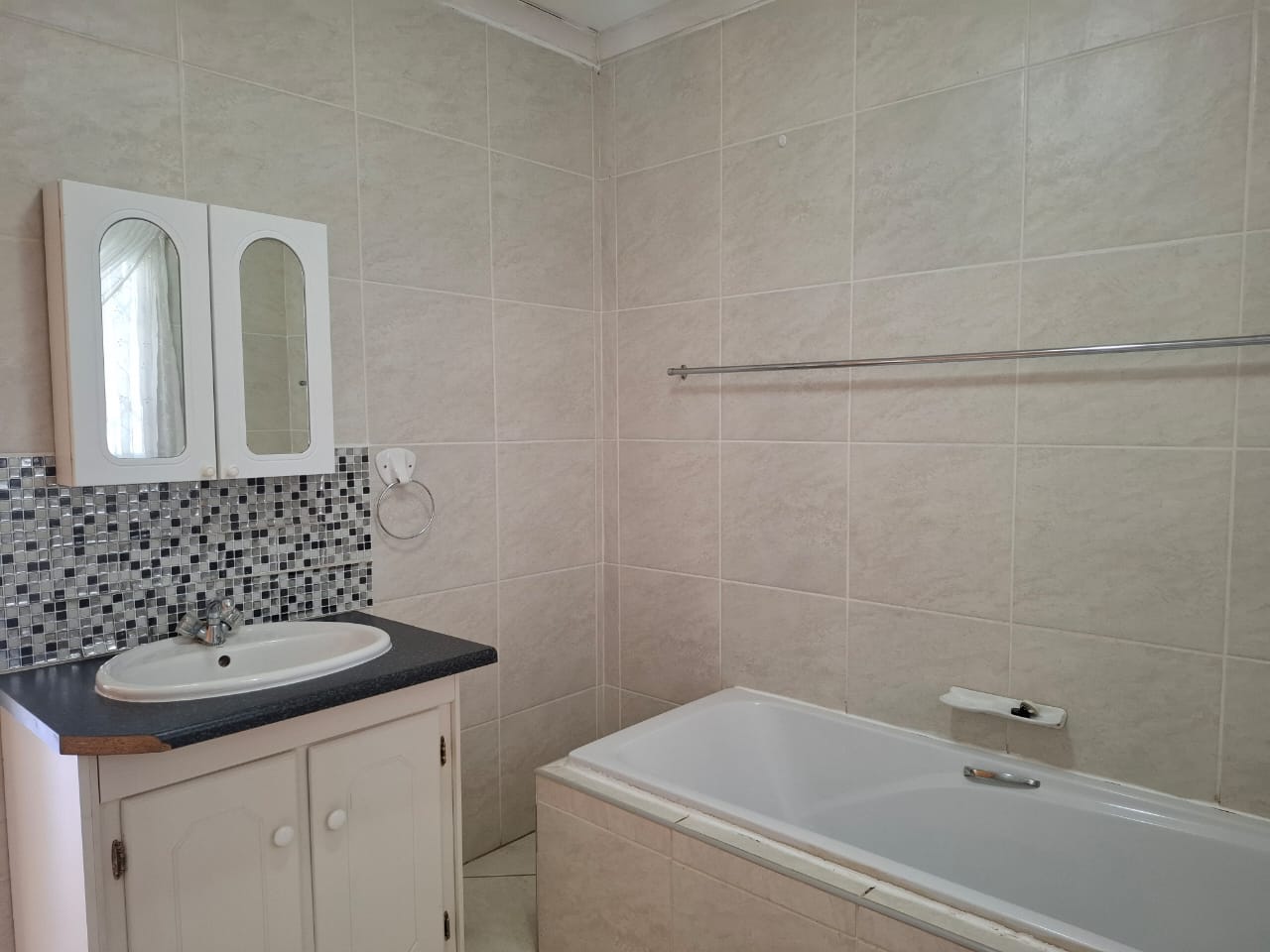 The main bedroom features an en-suite bathroom complete with a bath, shower, toilet, and basin. The two additional bedrooms are sunny, spacious, and fitted with built-in cupboards.