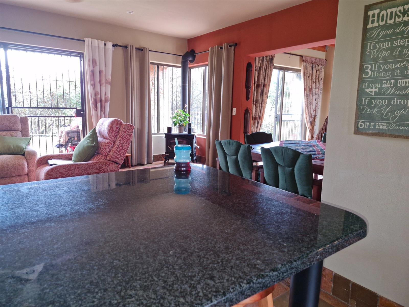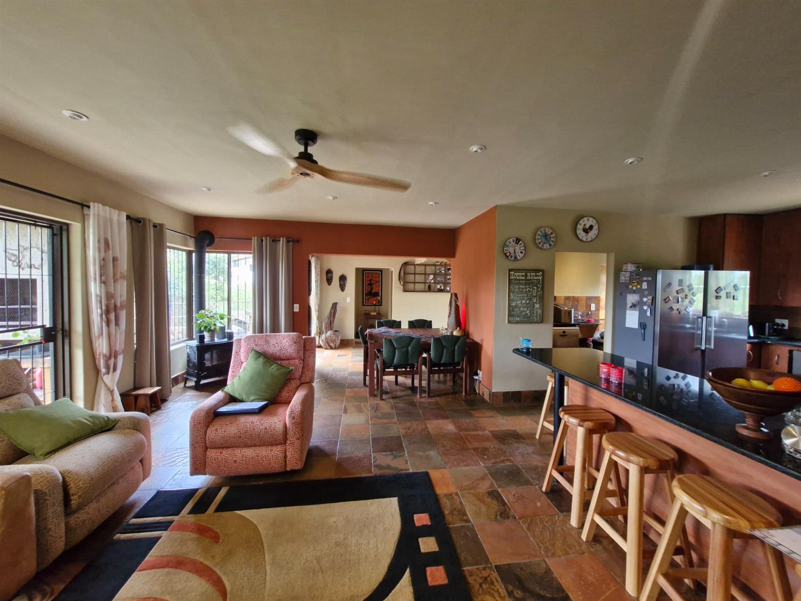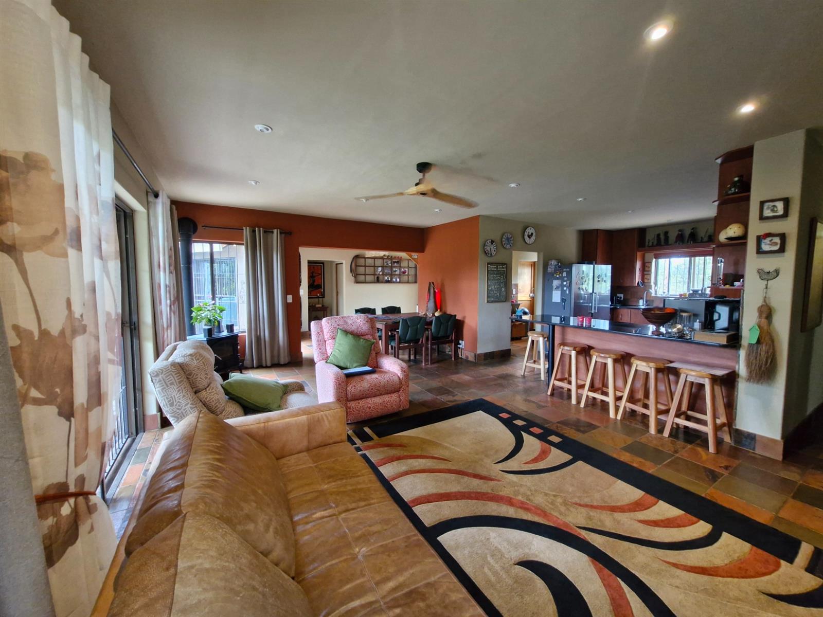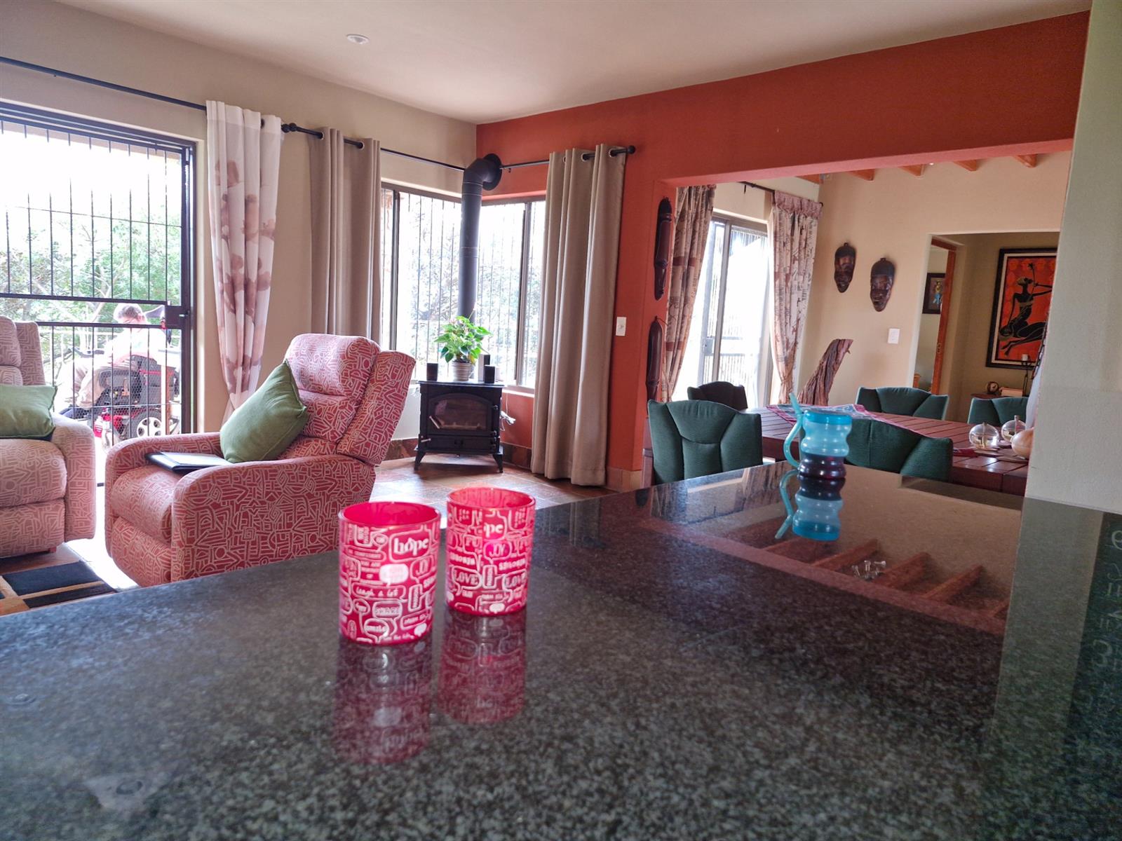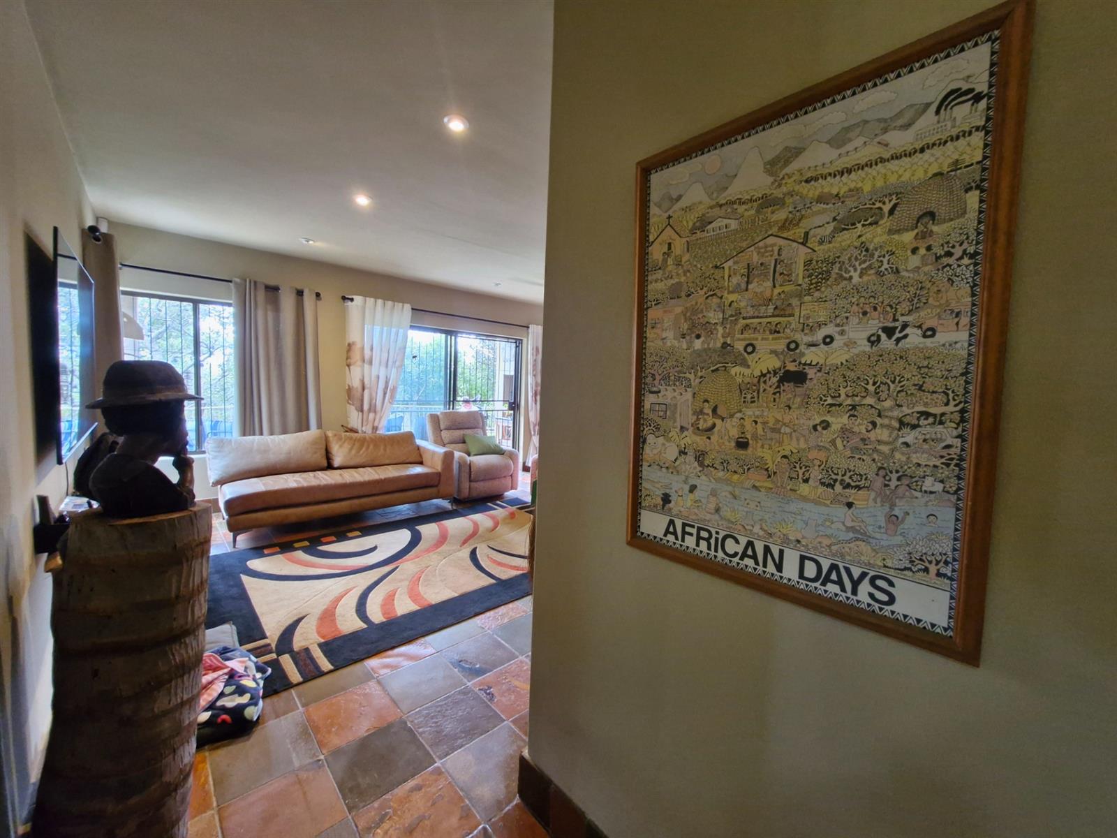 The living area open through glass sliding doors onto a well-designed entertainment area featuring a built-in braai and jacuzzi, ideal for refined indoor-outdoor living and entertaining.