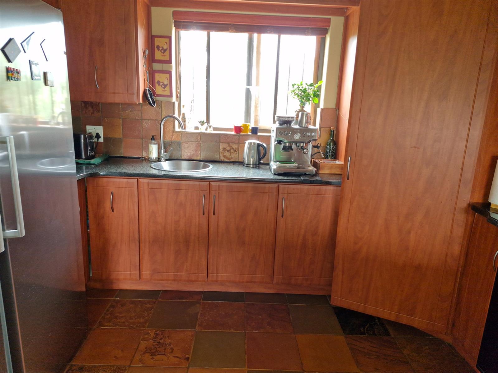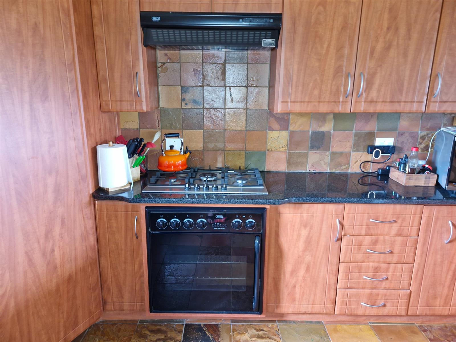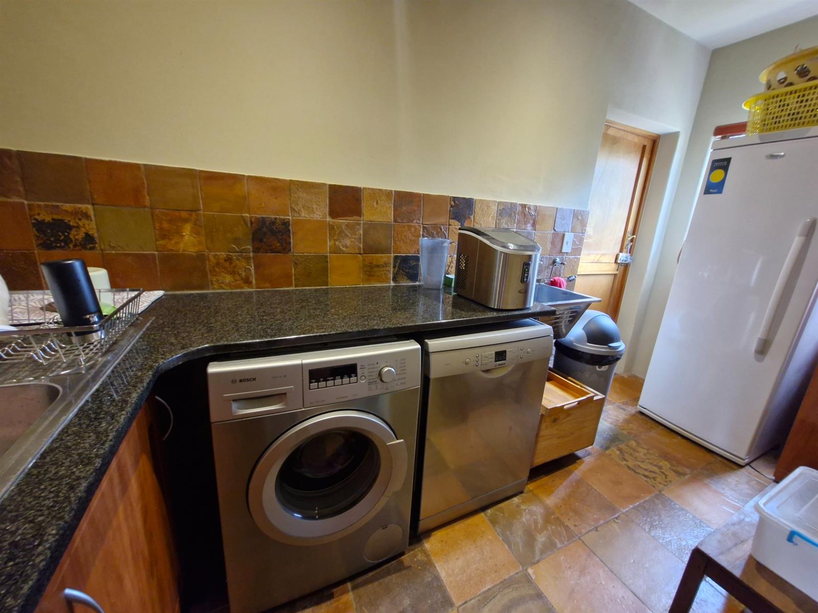 The open-plan kitchen is well appointed with generous cupboard space, a gas stove, pantry, and a separate scullery fitted with connections for both a washing machine and dishwasher.
