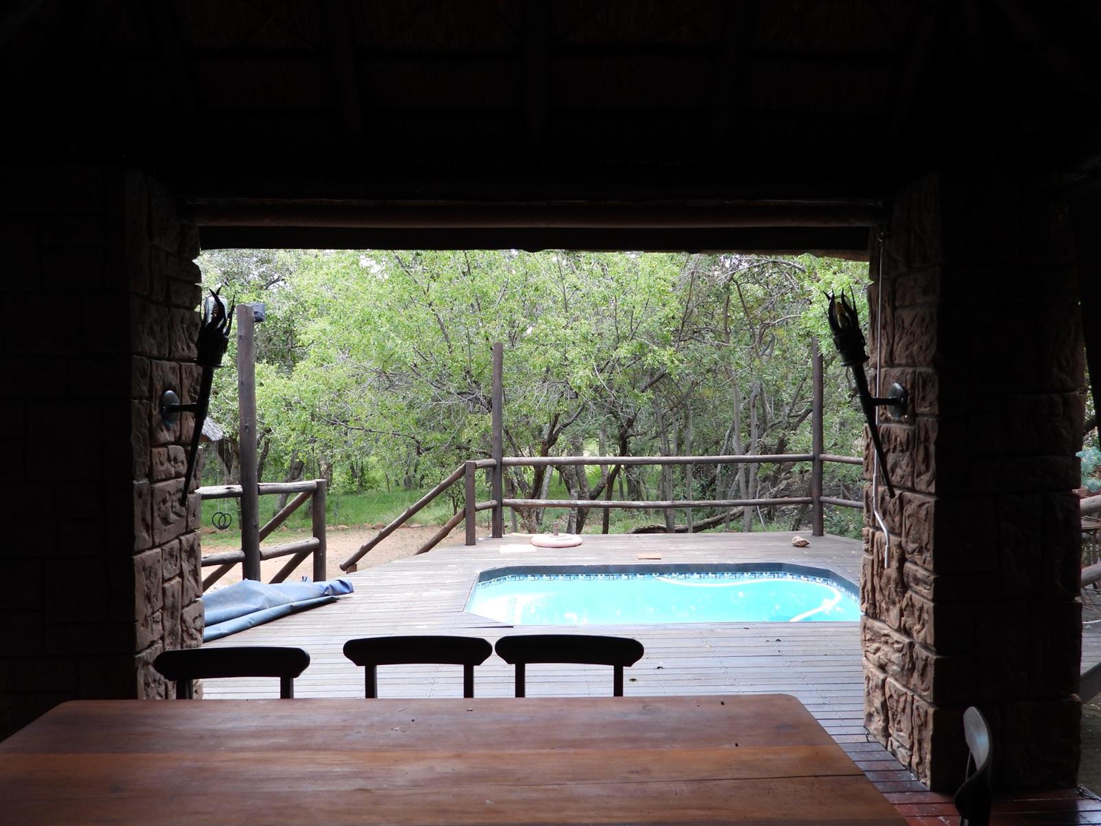 Step outside and the true magic of the property unfolds. A sparkling swimming pool shimmers in the sun, inviting you to cool off while watching wildlife pass beyond the fence line. The traditional boma sits ready for storytelling evenings around the fire, while the built-in braai promises long, laughter-filled gatherings with friends and family. An outdoor shower adds a touch of safari charm, there’s nothing quite like showering beneath the open sky.
