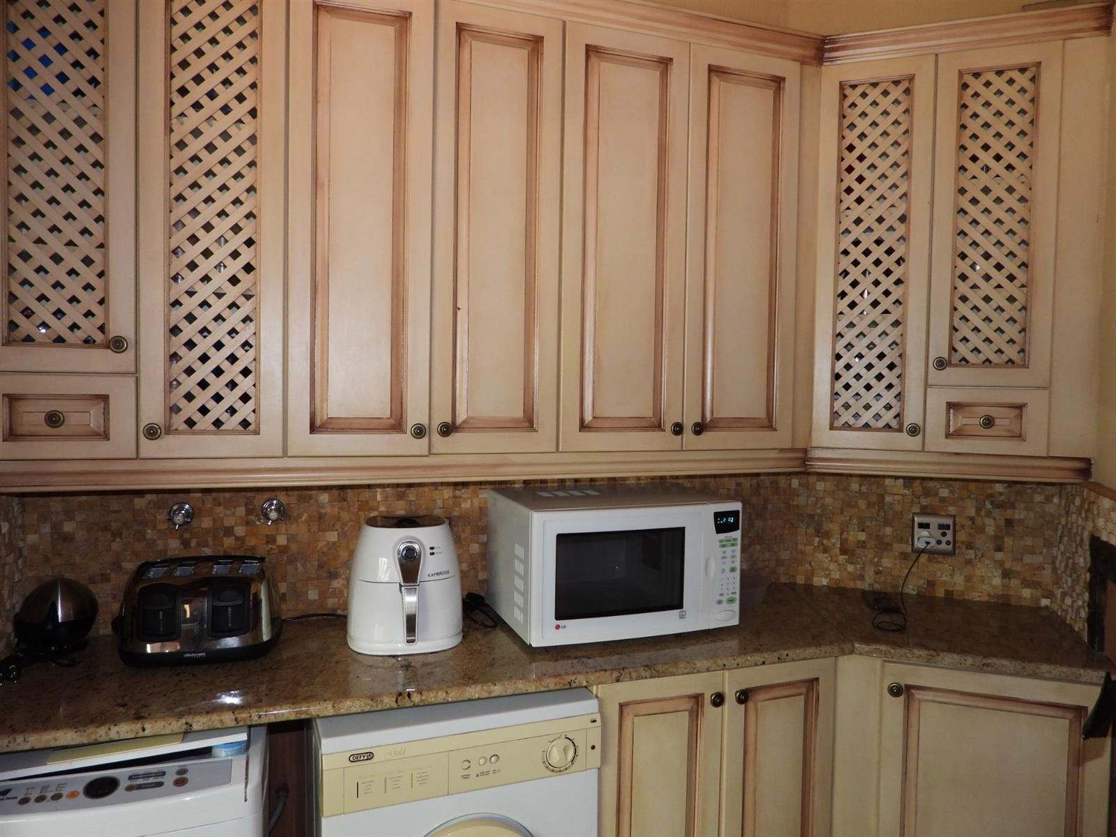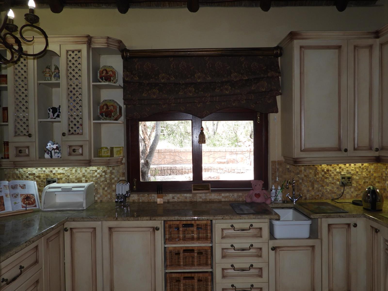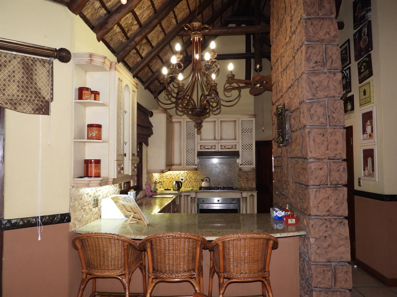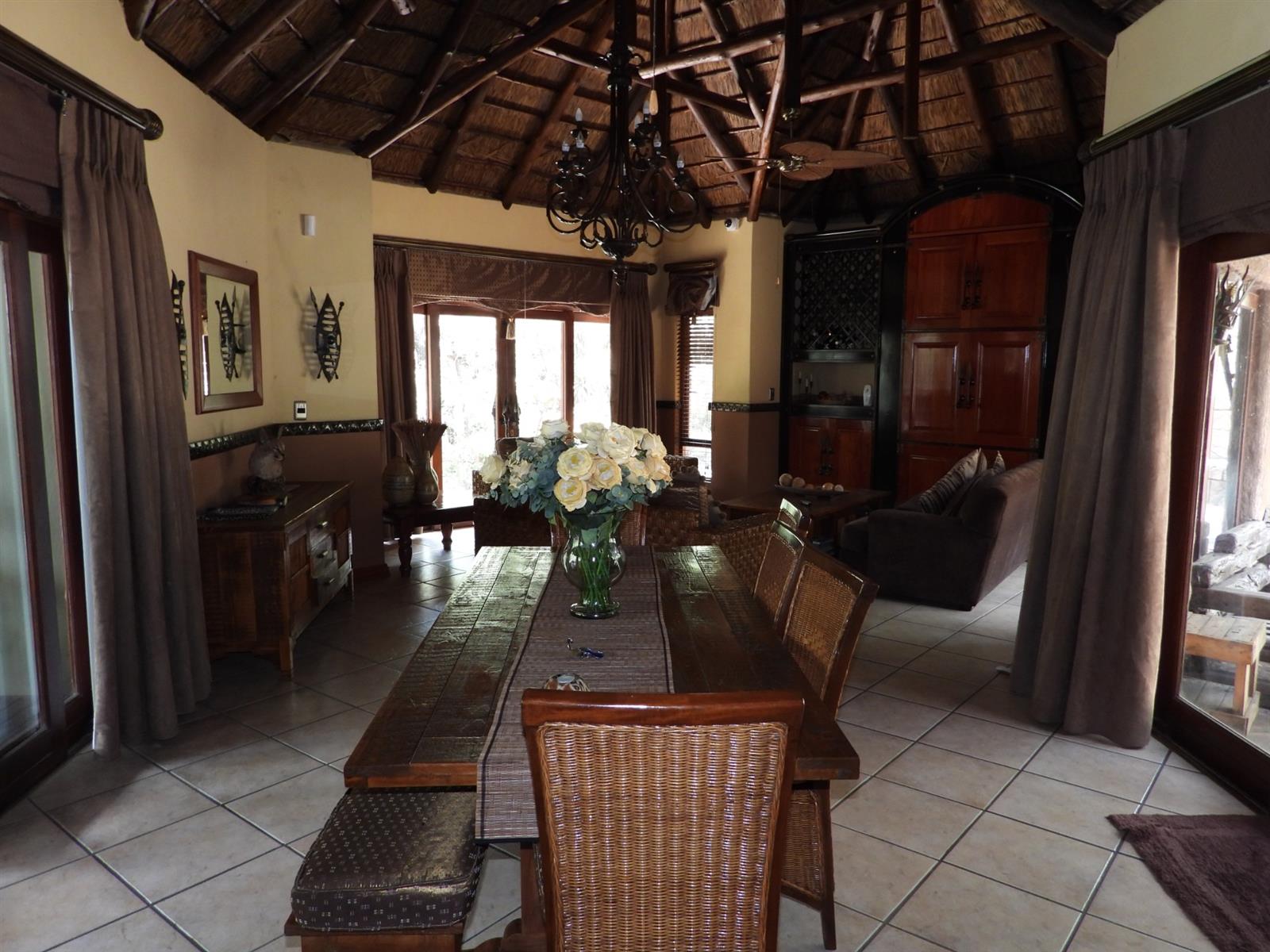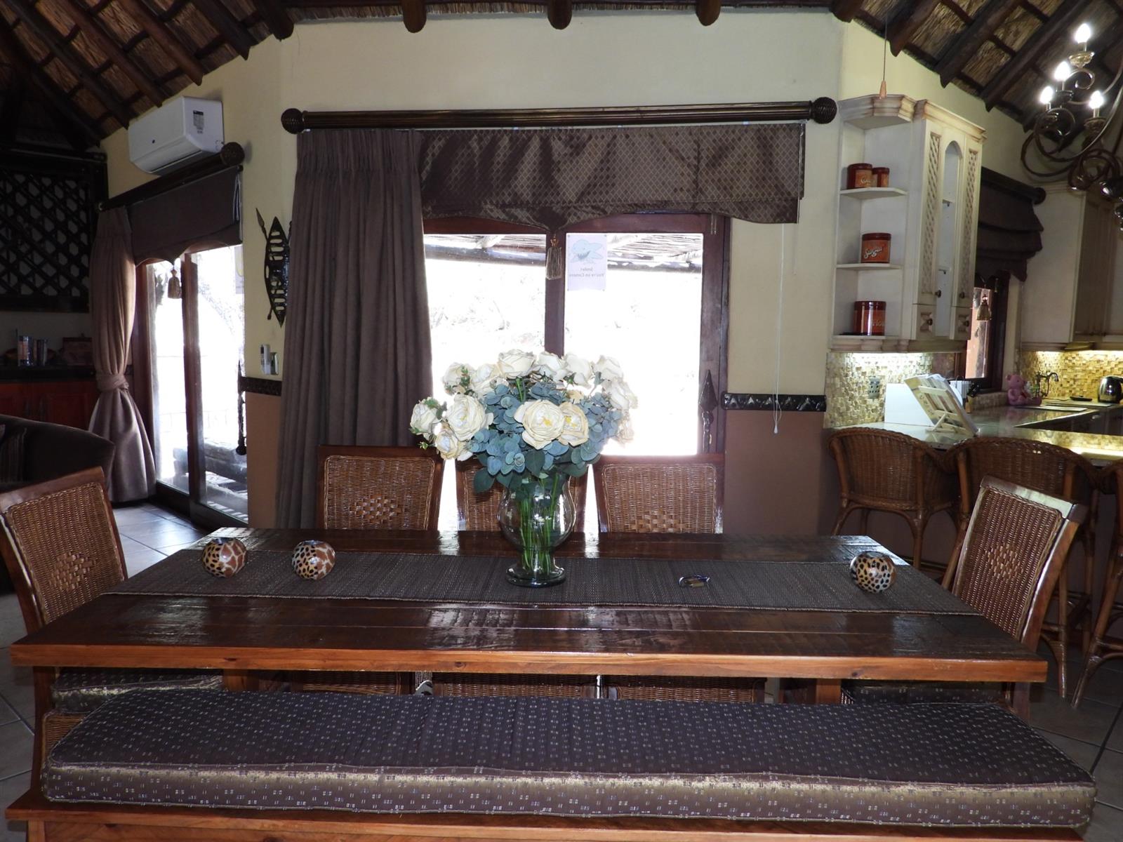 The main house welcomes you with a broad patio that looks out over the bushveld, often visited by wandering nyala and curious warthogs. Large doors open into an airy open-plan living space where the dining room and lounge flow effortlessly together. Sunlight spills across tiled floors, and the hum of air conditioners keeps the home cool even on the warmest summer days. The kitchen forms the heart of the house, fitted with a gas stove for effortless cooking, an electric oven, a generous pantry, and a separate scullery that keeps everything neat and practical when entertaining guests.