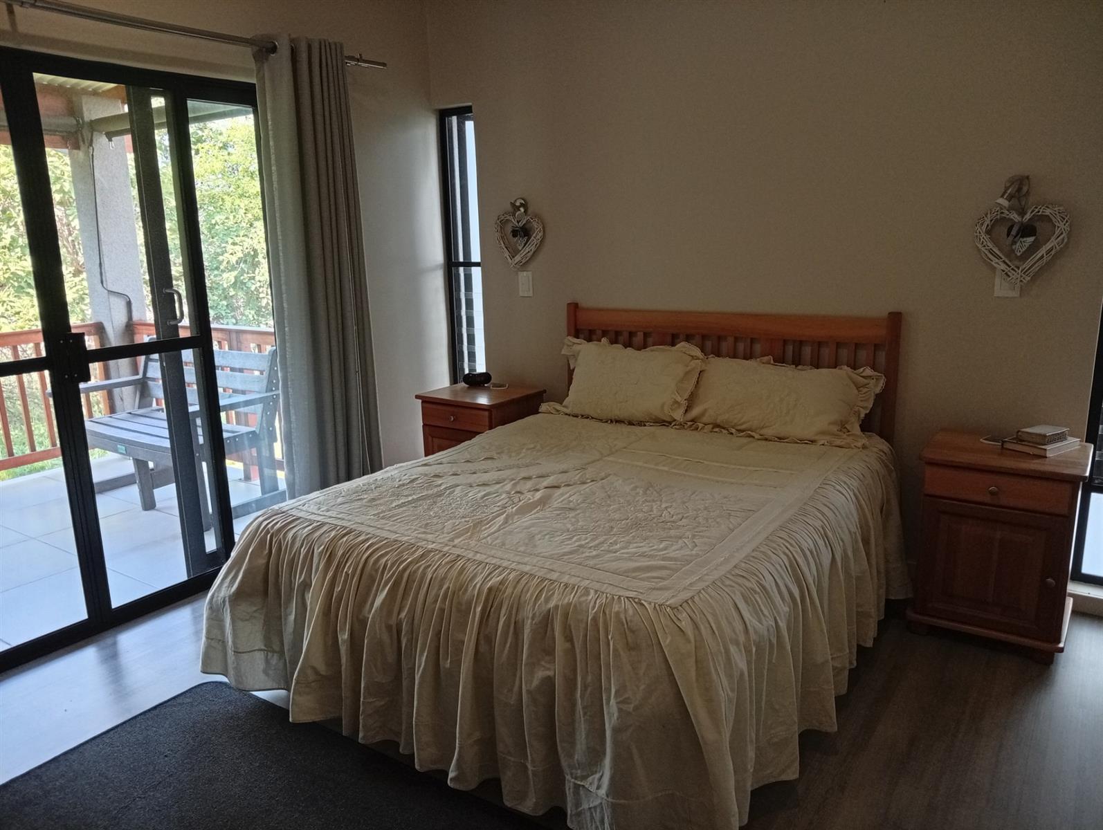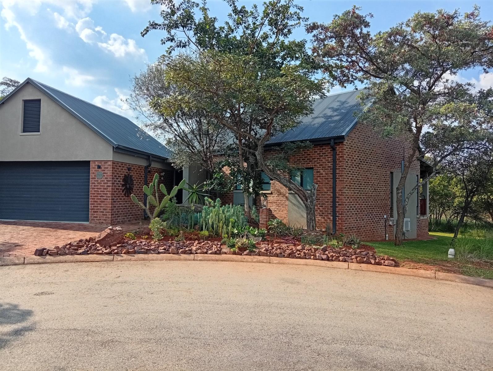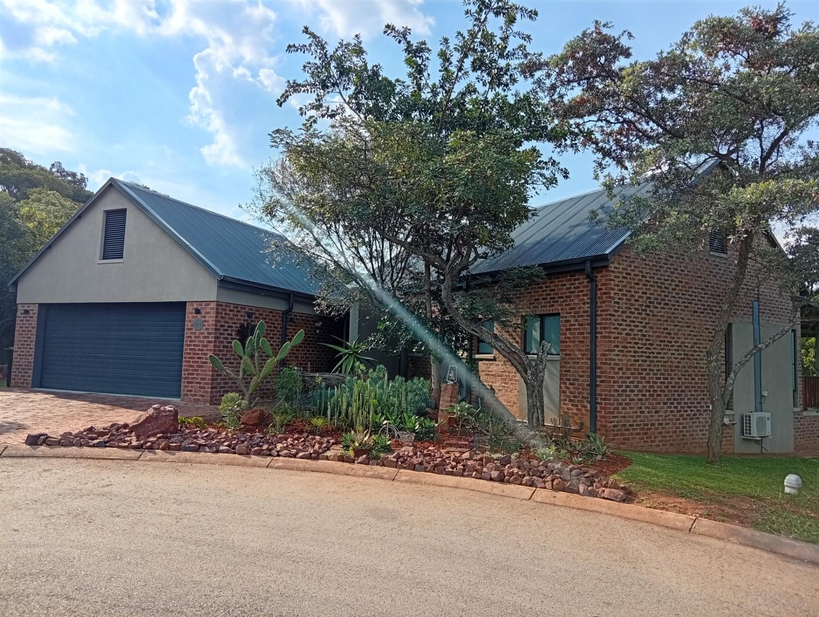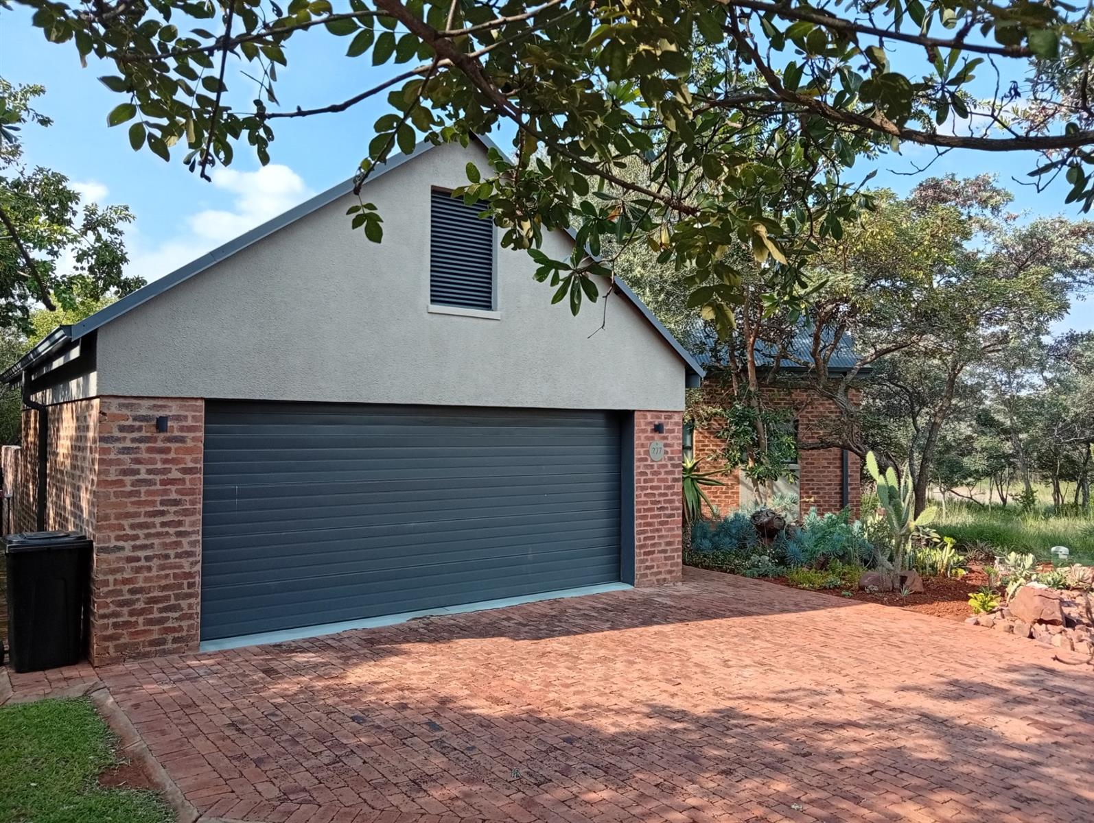 This north-facing home, located in a quiet cul-de-sac, is truly unique within the estate. It boasts exquisite bush views visible from three sides (green areas) of the house, creating a sense of privacy and immersion in nature. The property offers two bedrooms and two bathrooms, a double garage, and a spacious veranda that spans the full width of the home and features a built-in braai. A separate, private entertainment area includes a boma with permanent seating, ideal for relaxed outdoor gatherings.