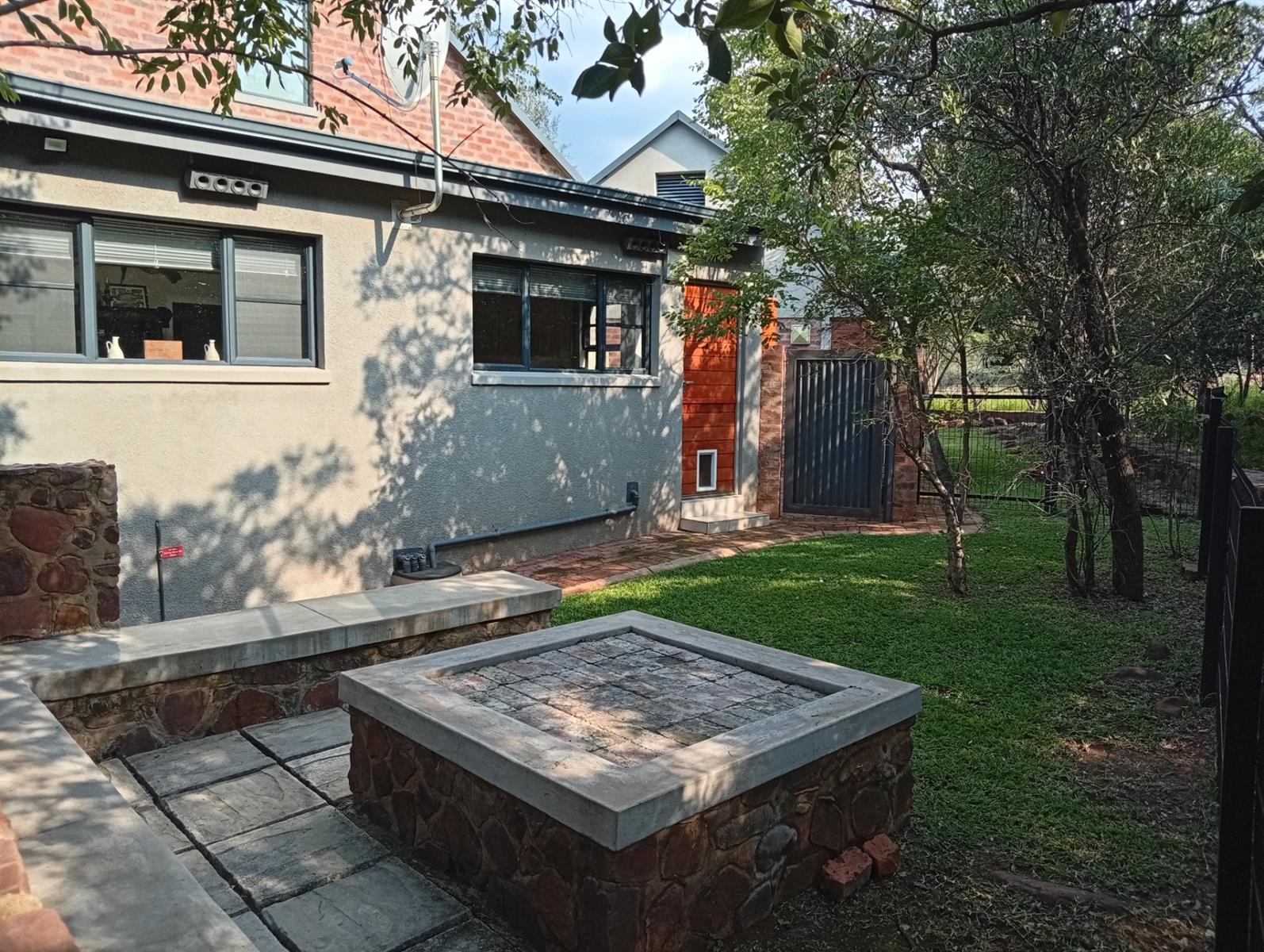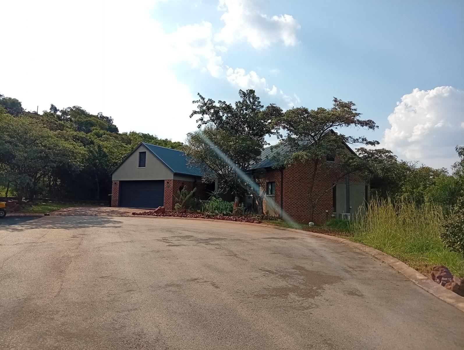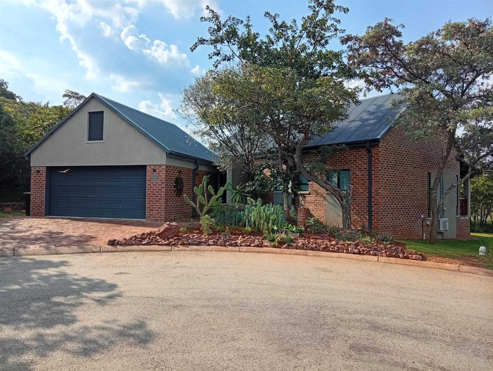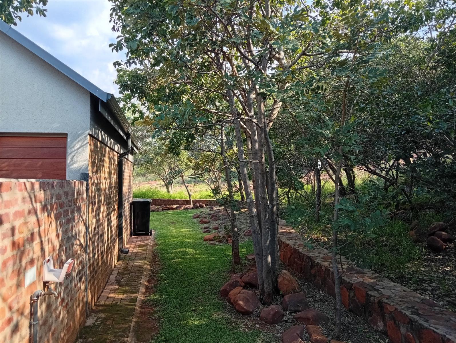 This north-facing home, located in a quiet cul-de-sac, is truly unique within the estate. It boasts exquisite bush views visible from three sides (green areas) of the house, creating a sense of privacy and immersion in nature. The property offers two bedrooms and two bathrooms, a double garage, and a spacious veranda that spans the full width of the home and features a built-in braai. A separate, private entertainment area includes a boma with permanent seating, ideal for relaxed outdoor gatherings.