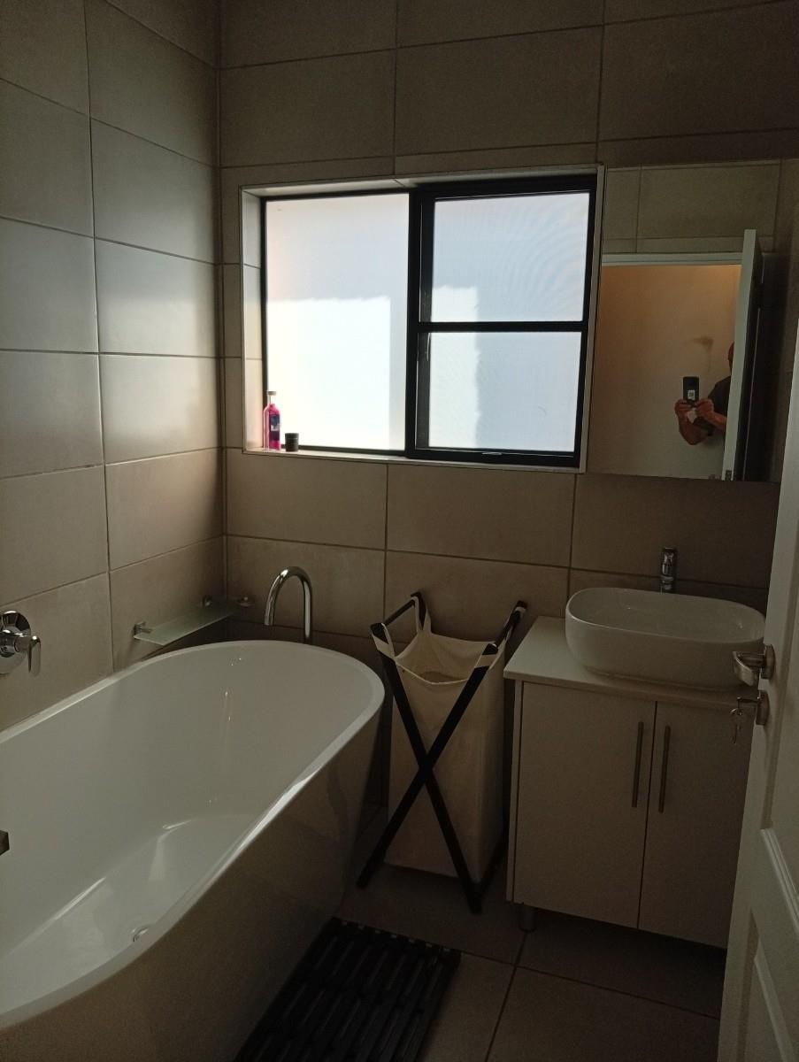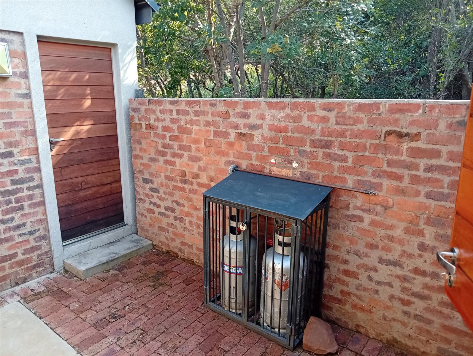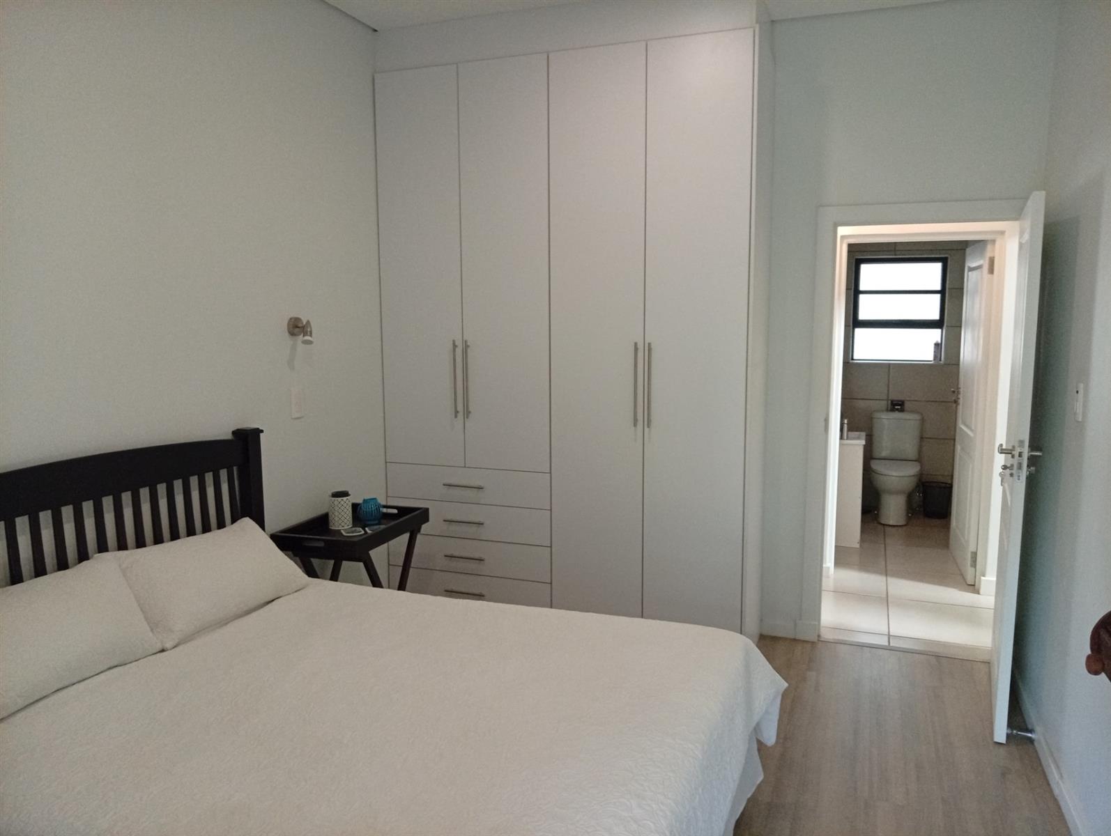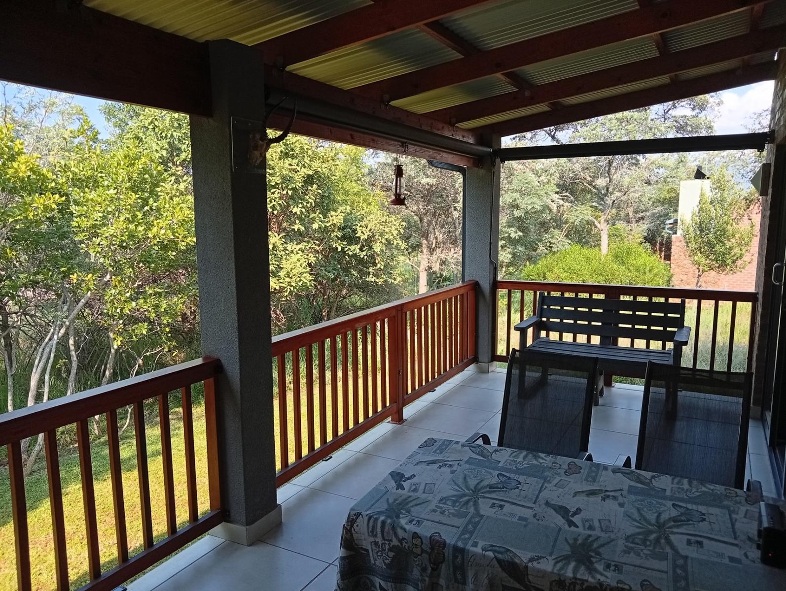 This north-facing home, located in a quiet cul-de-sac, is truly unique within the estate. It boasts exquisite bush views visible from three sides (green areas) of the house, creating a sense of privacy and immersion in nature. The property offers two bedrooms and two bathrooms, a double garage, and a spacious veranda that spans the full width of the home and features a built-in braai. A separate, private entertainment area includes a boma with permanent seating, ideal for relaxed outdoor gatherings.