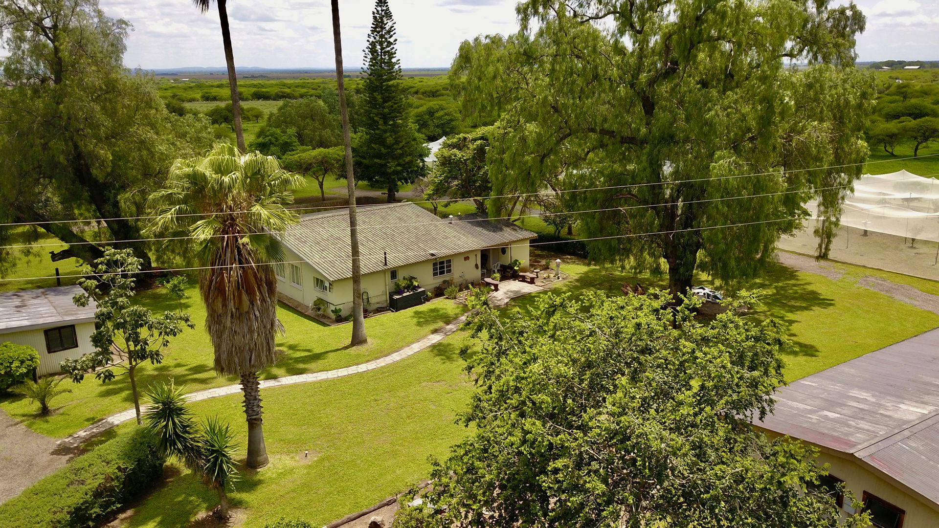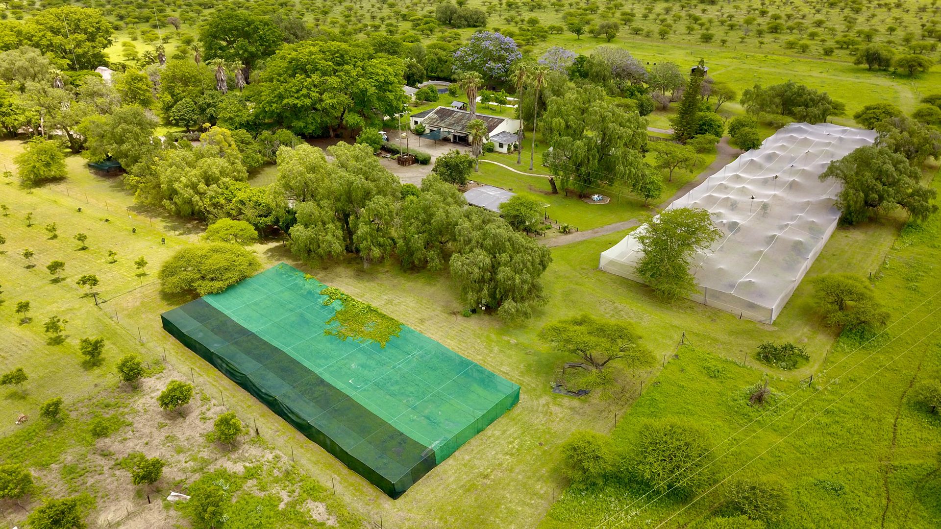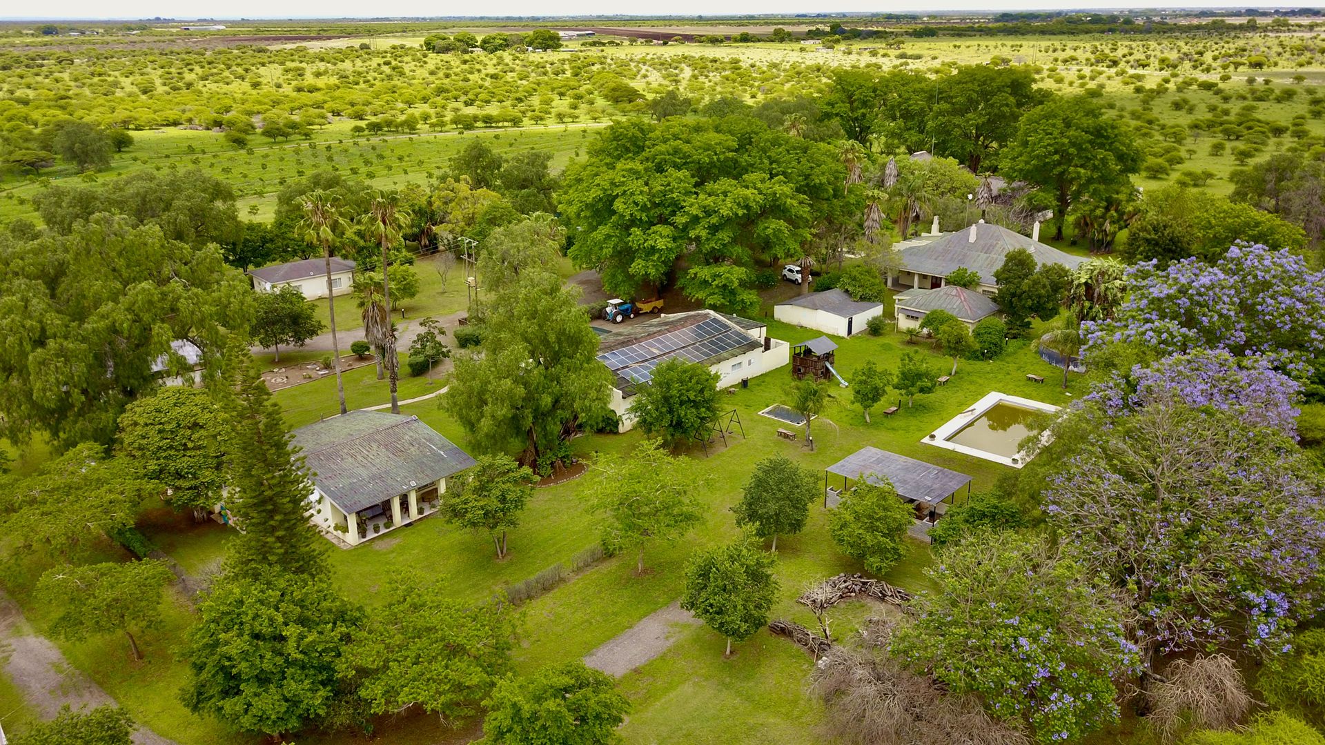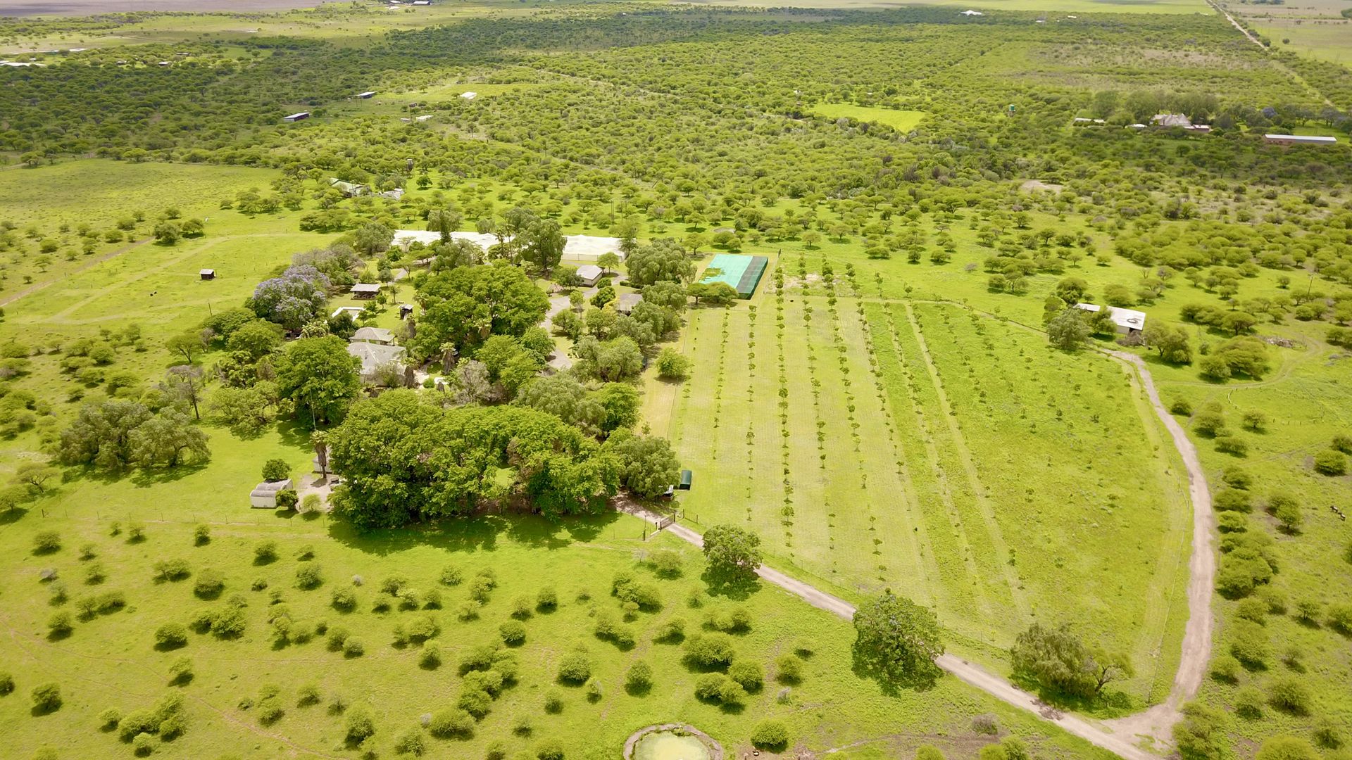 The property is designed for leisure and entertainment, with a large swimming pool, chess floor, volleyball court, and a children’s play area complete with swings, trampoline, and playhouse with slide. Outbuildings include a large store area with toilets, kitchen, and walk-in cold room, as well as six labour quarters with a shared bathroom. Agricultural features are extensive, with 500 pecan nut trees, 50 fruit trees under shade net, a large greenhouse, and two equipped boreholes. The entire farm is game-fenced, with electrical fencing around the houses for added security.