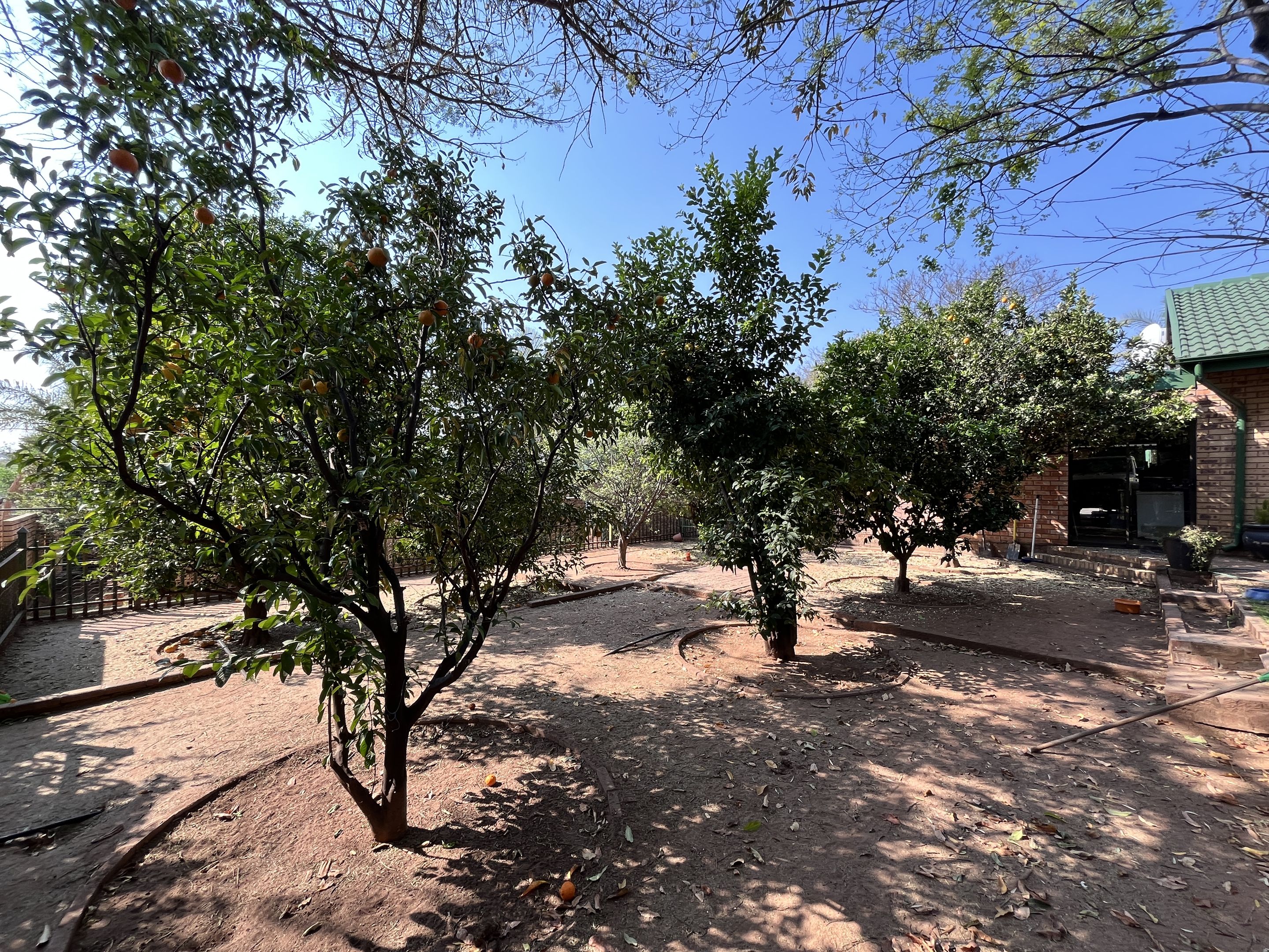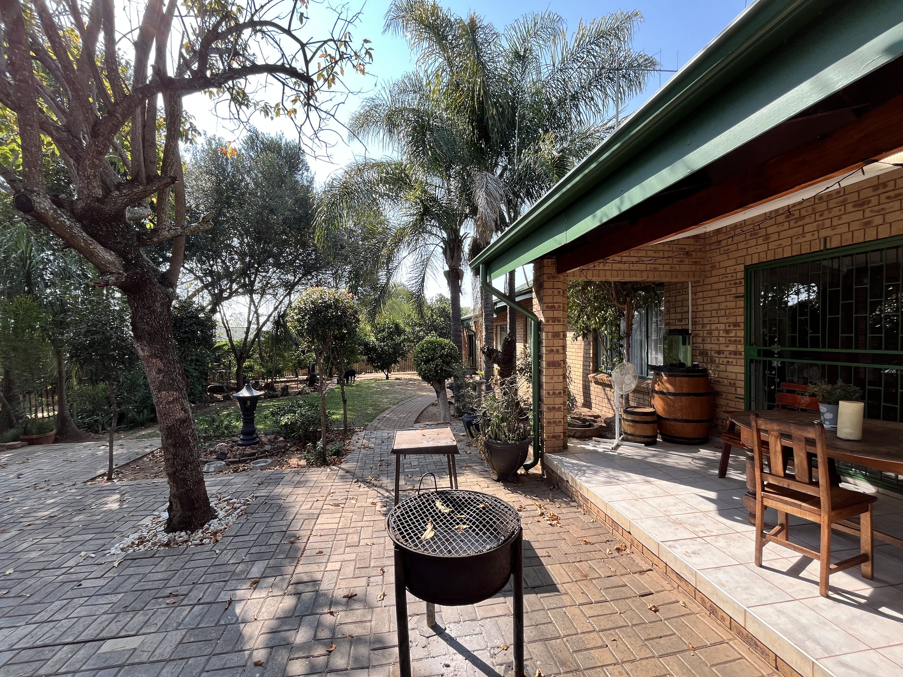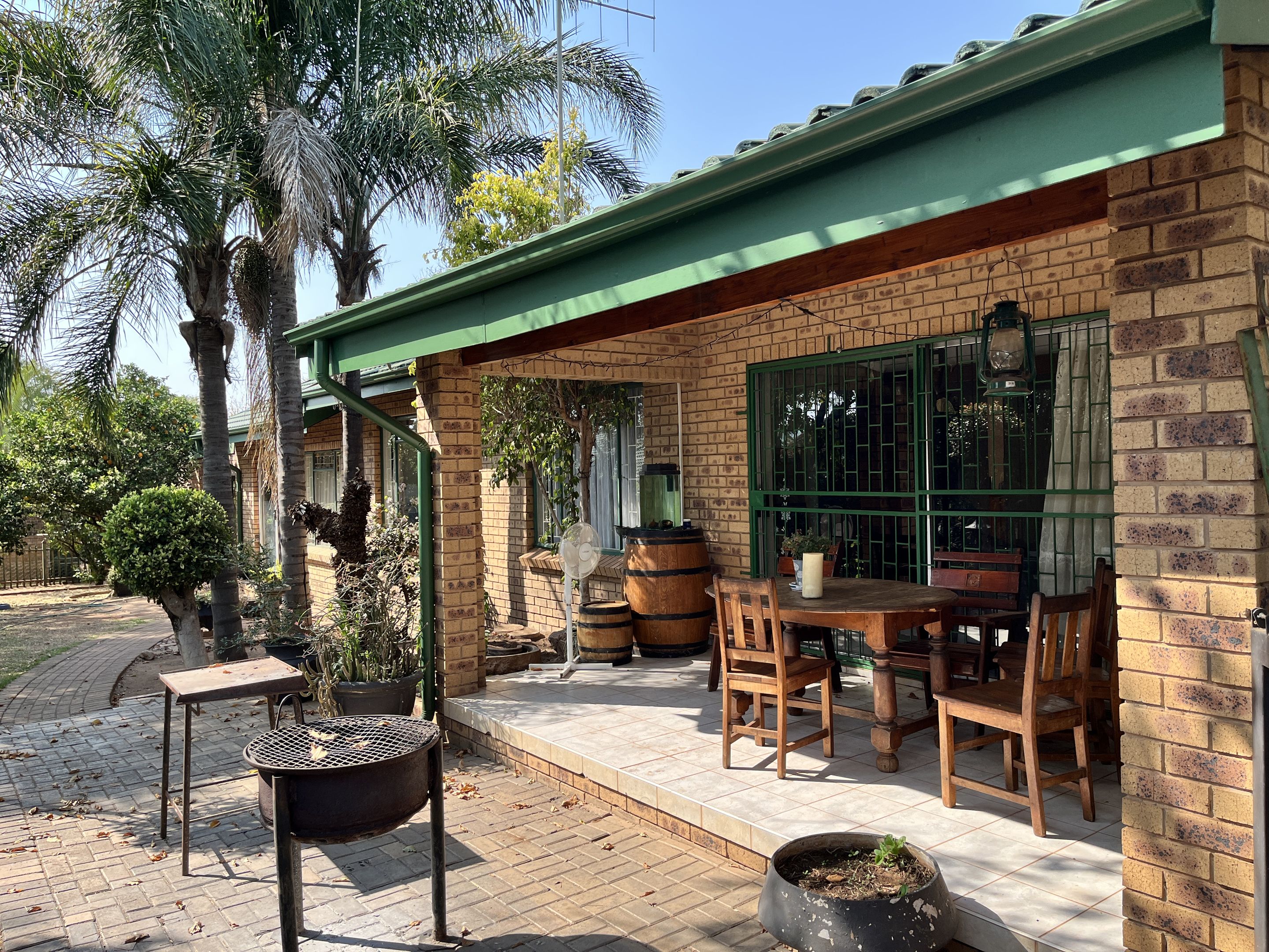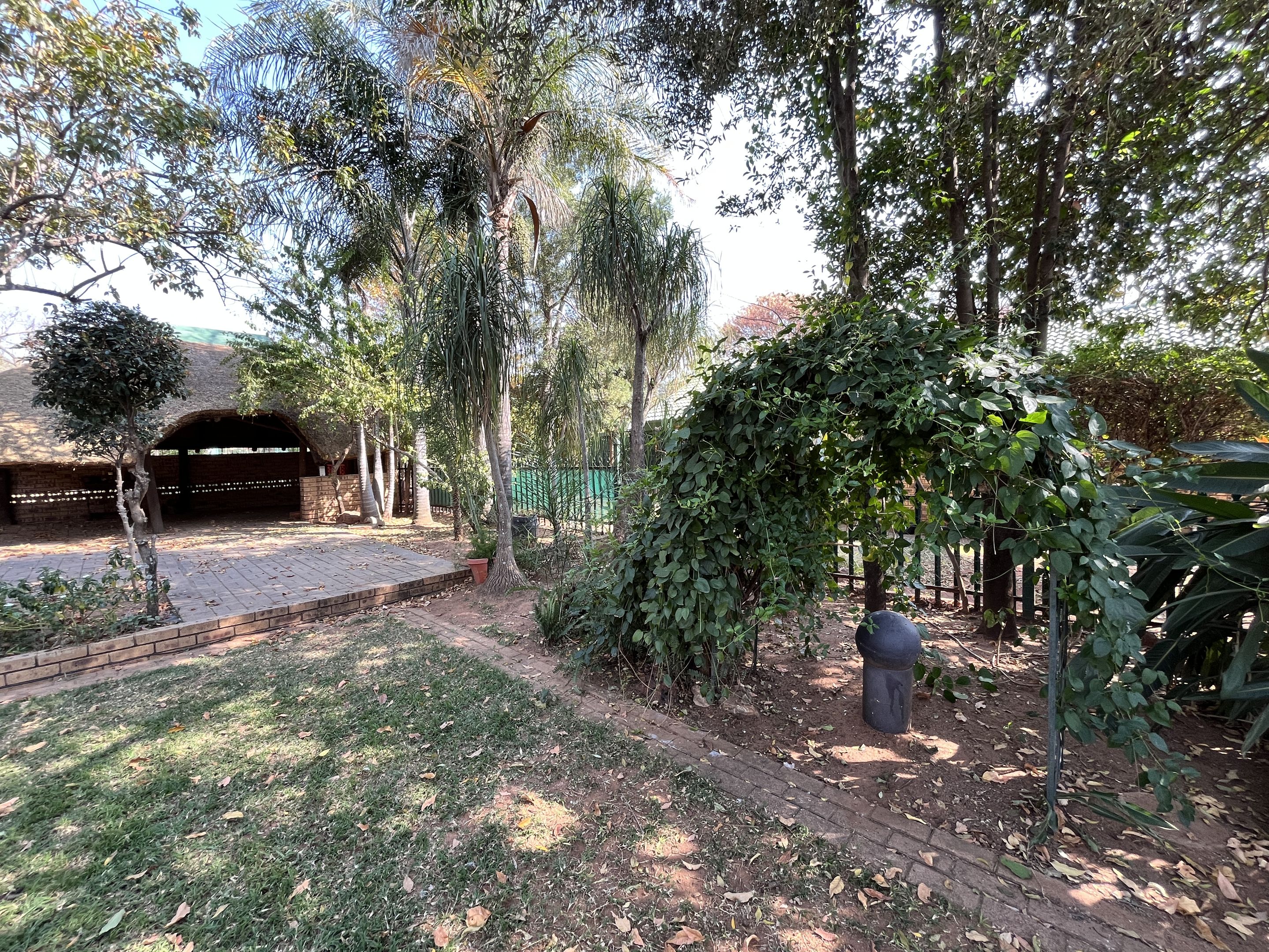 The open-plan lounge and dining area seamlessly connect to a fully equipped kitchen, complete with sturdy built-in cupboards, creating a welcoming and efficient living space. A corridor from the living area leads to the bedrooms, with the main bedroom thoughtfully designed on a slightly sunken level for added privacy and character. Perfectly suited for young families or retirees, the home boasts a large, fully enclosed yard adorned with citrus trees including oranges and lemons, as well as a multi-layered garden filled with vibrant plants and mature trees. Outdoor living is enhanced by a covered patio and a separate lapa, offering versatile spaces for relaxation and entertaining.