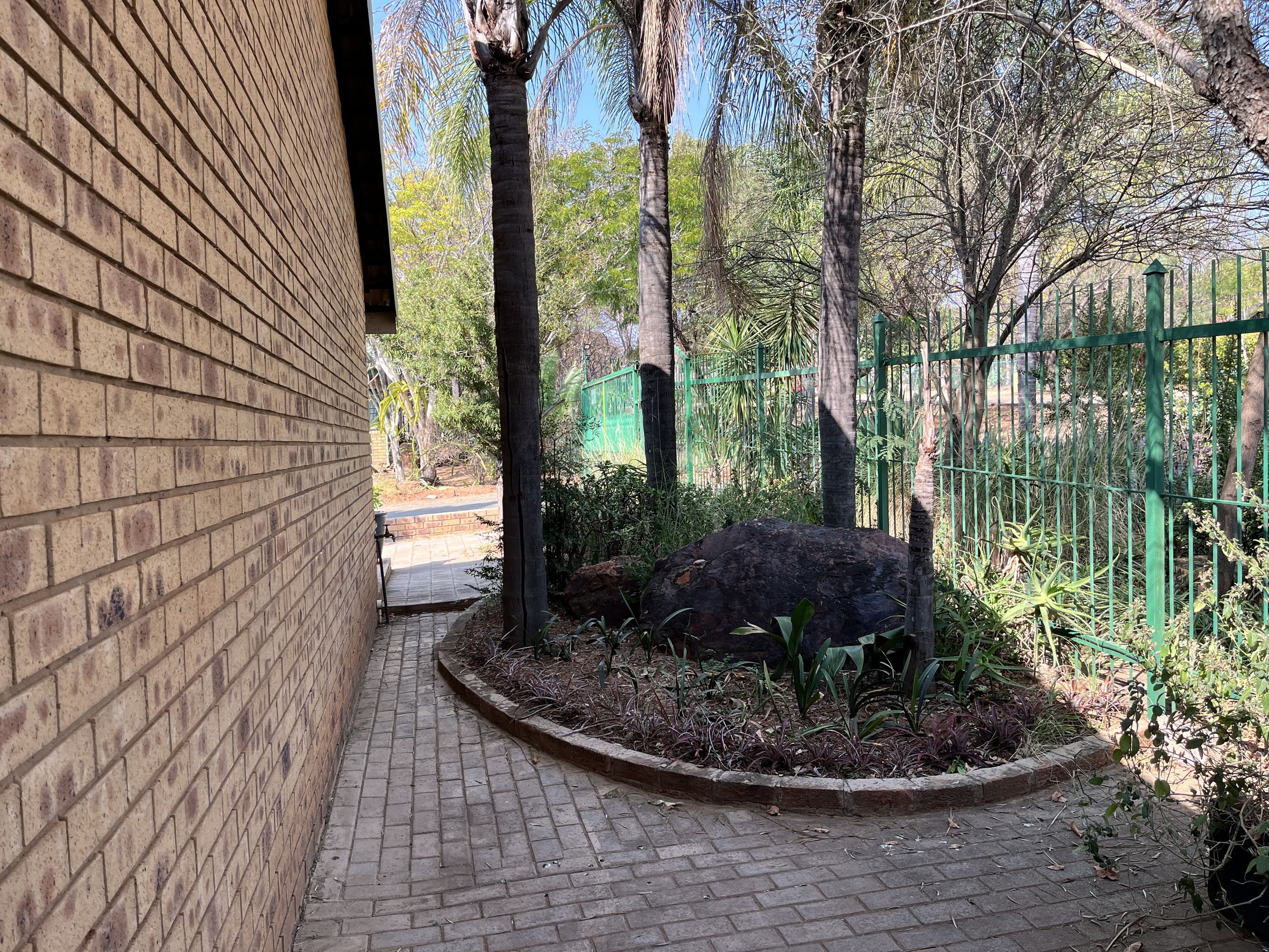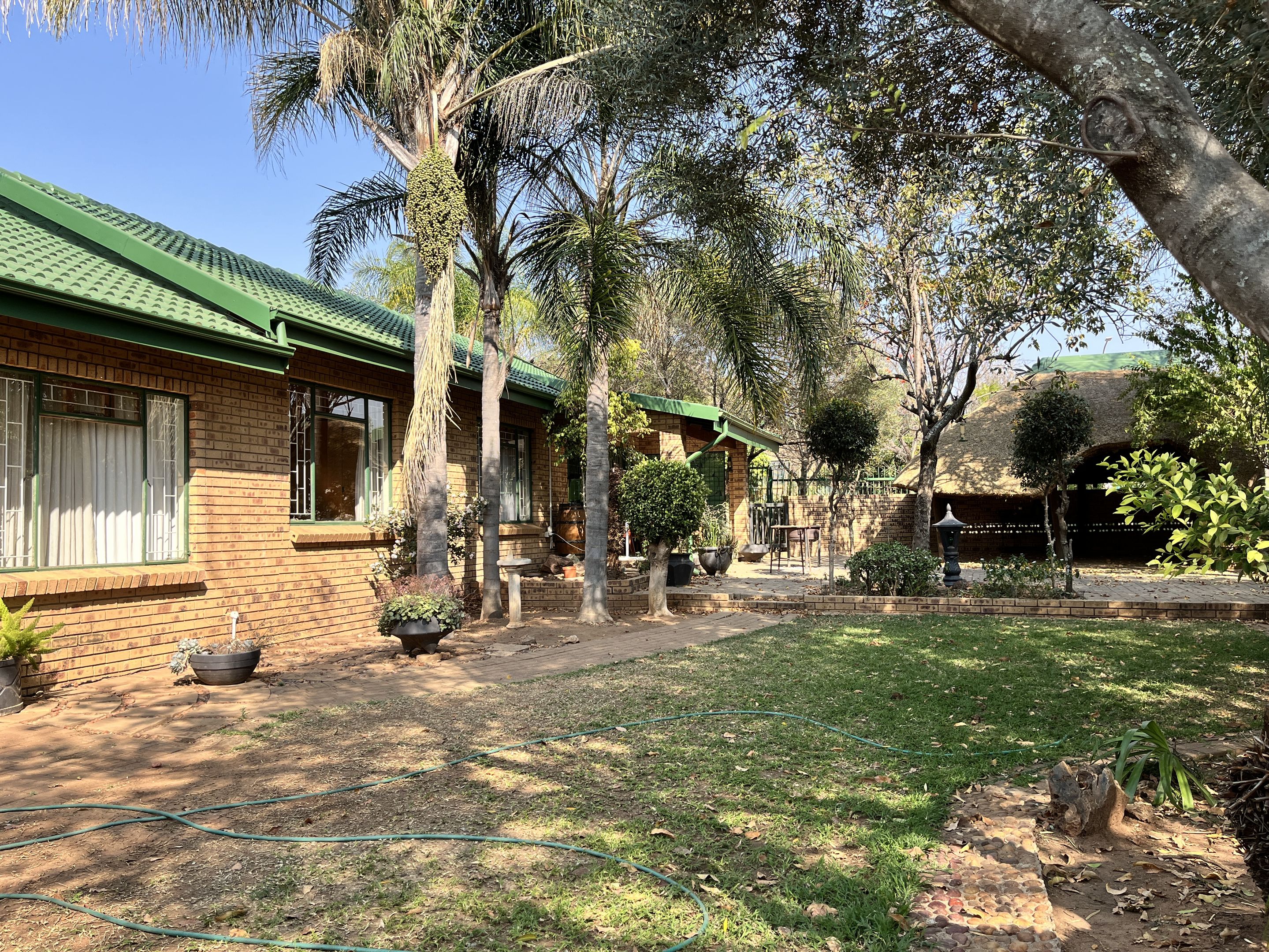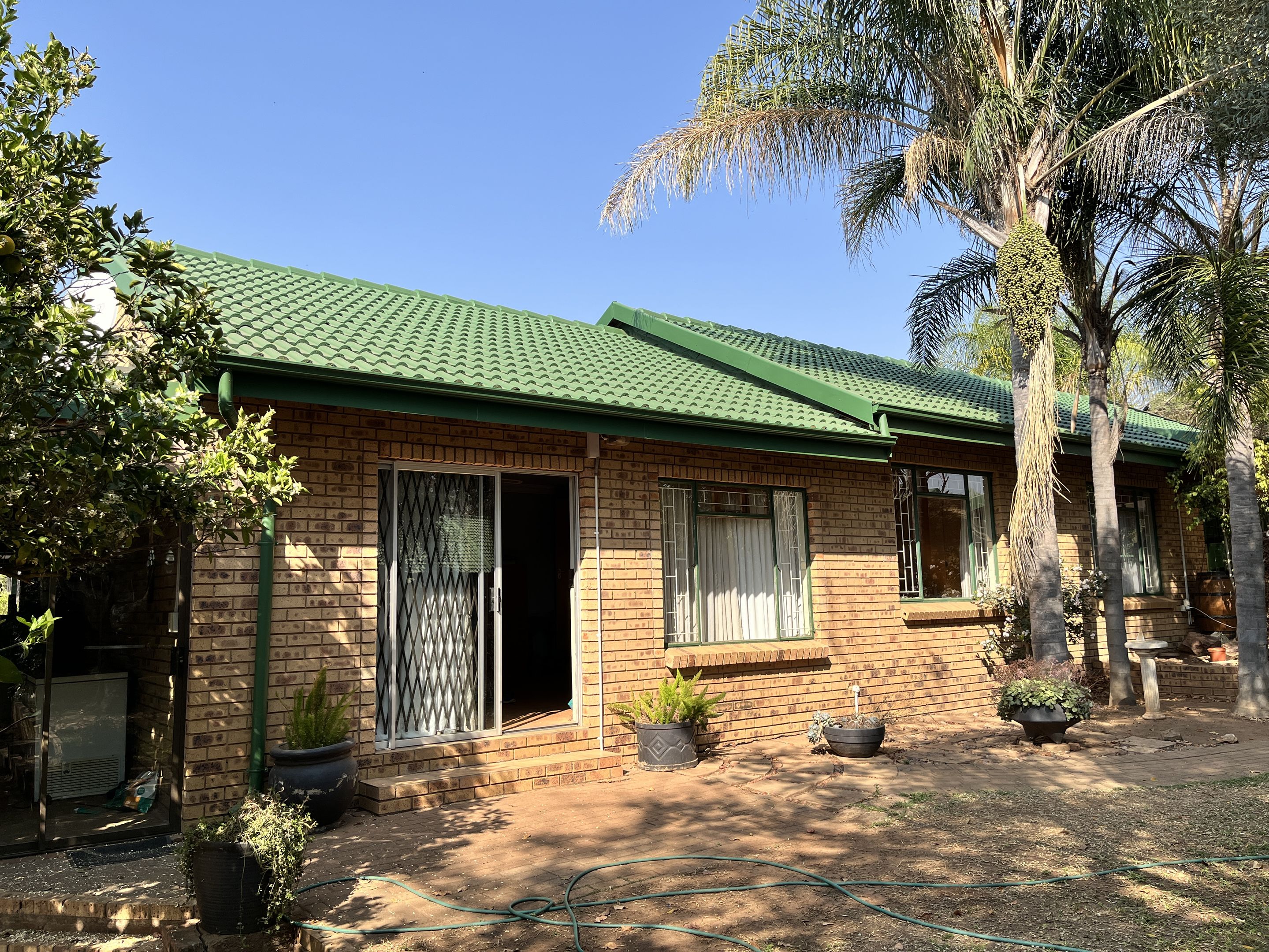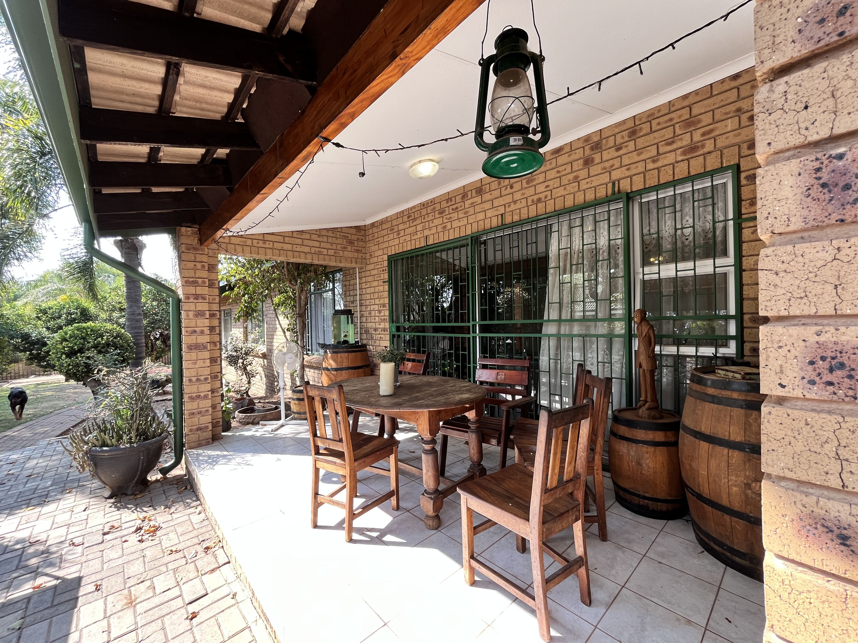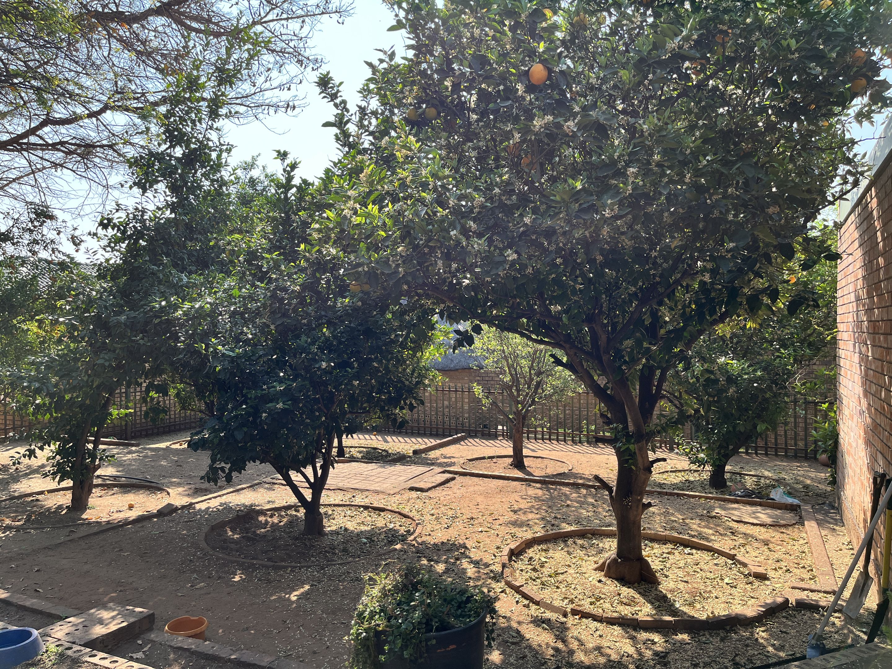 The open-plan lounge and dining area seamlessly connect to a fully equipped kitchen, complete with sturdy built-in cupboards, creating a welcoming and efficient living space. A corridor from the living area leads to the bedrooms, with the main bedroom thoughtfully designed on a slightly sunken level for added privacy and character. Perfectly suited for young families or retirees, the home boasts a large, fully enclosed yard adorned with citrus trees including oranges and lemons, as well as a multi-layered garden filled with vibrant plants and mature trees. Outdoor living is enhanced by a covered patio and a separate lapa, offering versatile spaces for relaxation and entertaining.