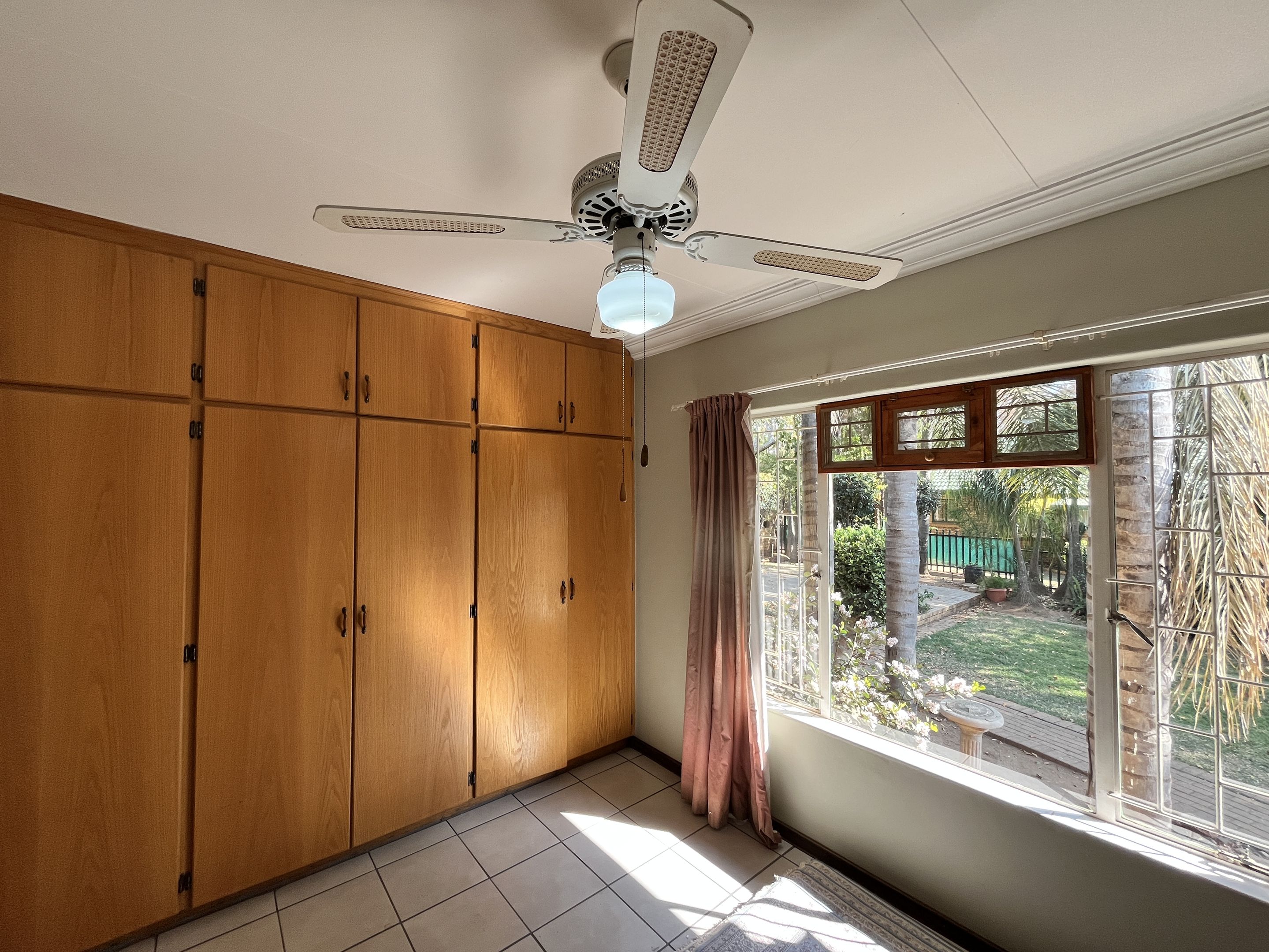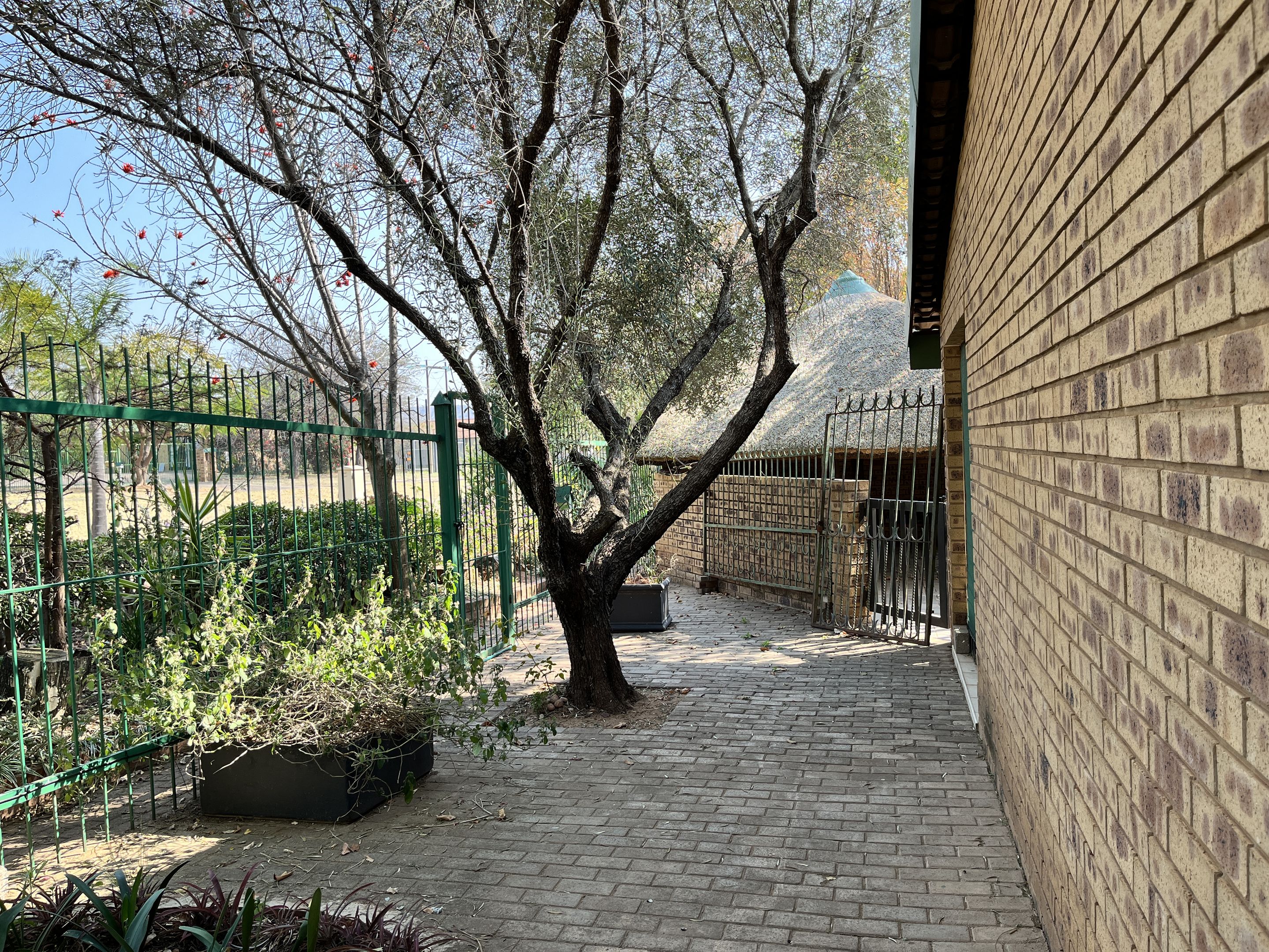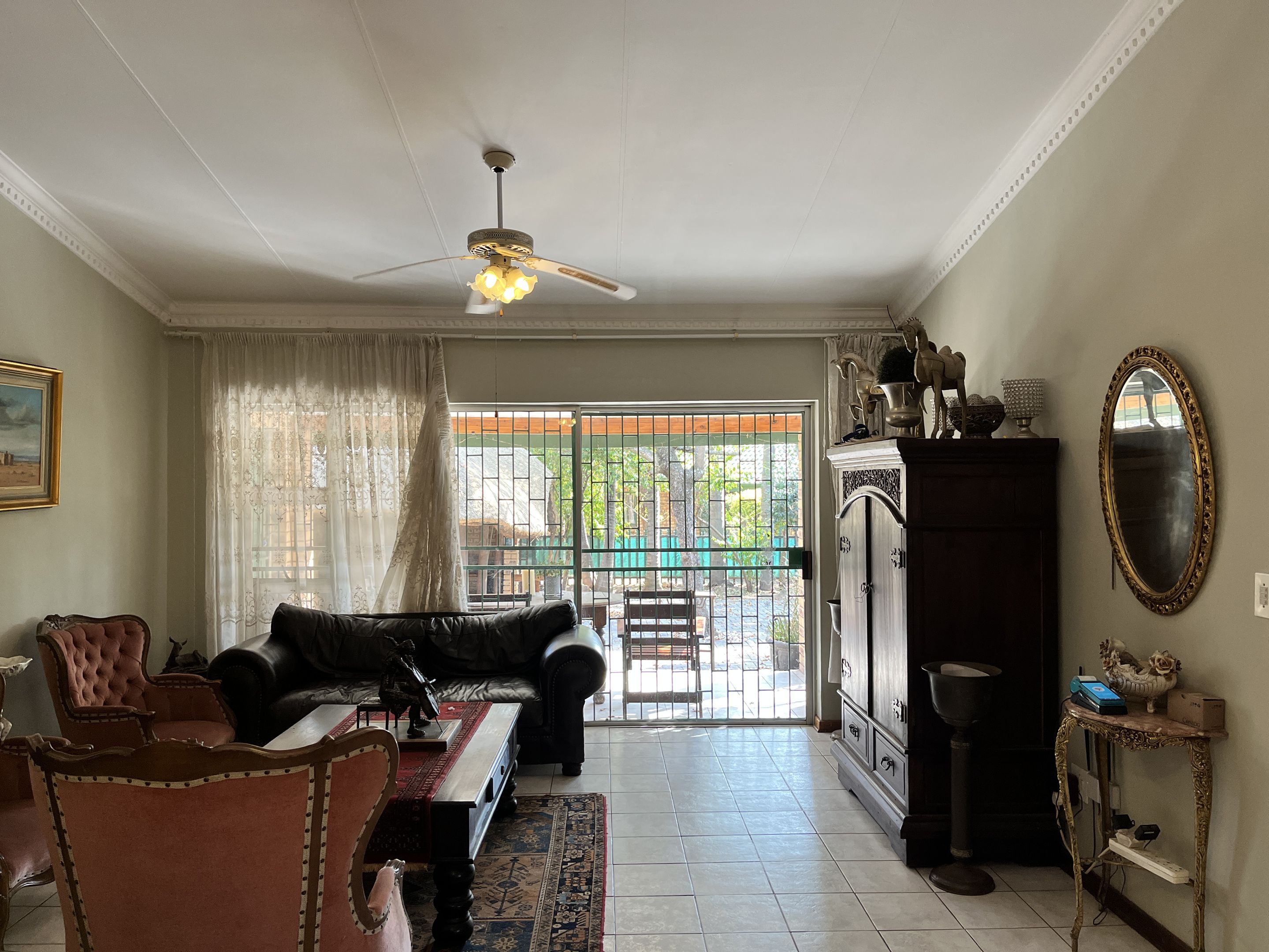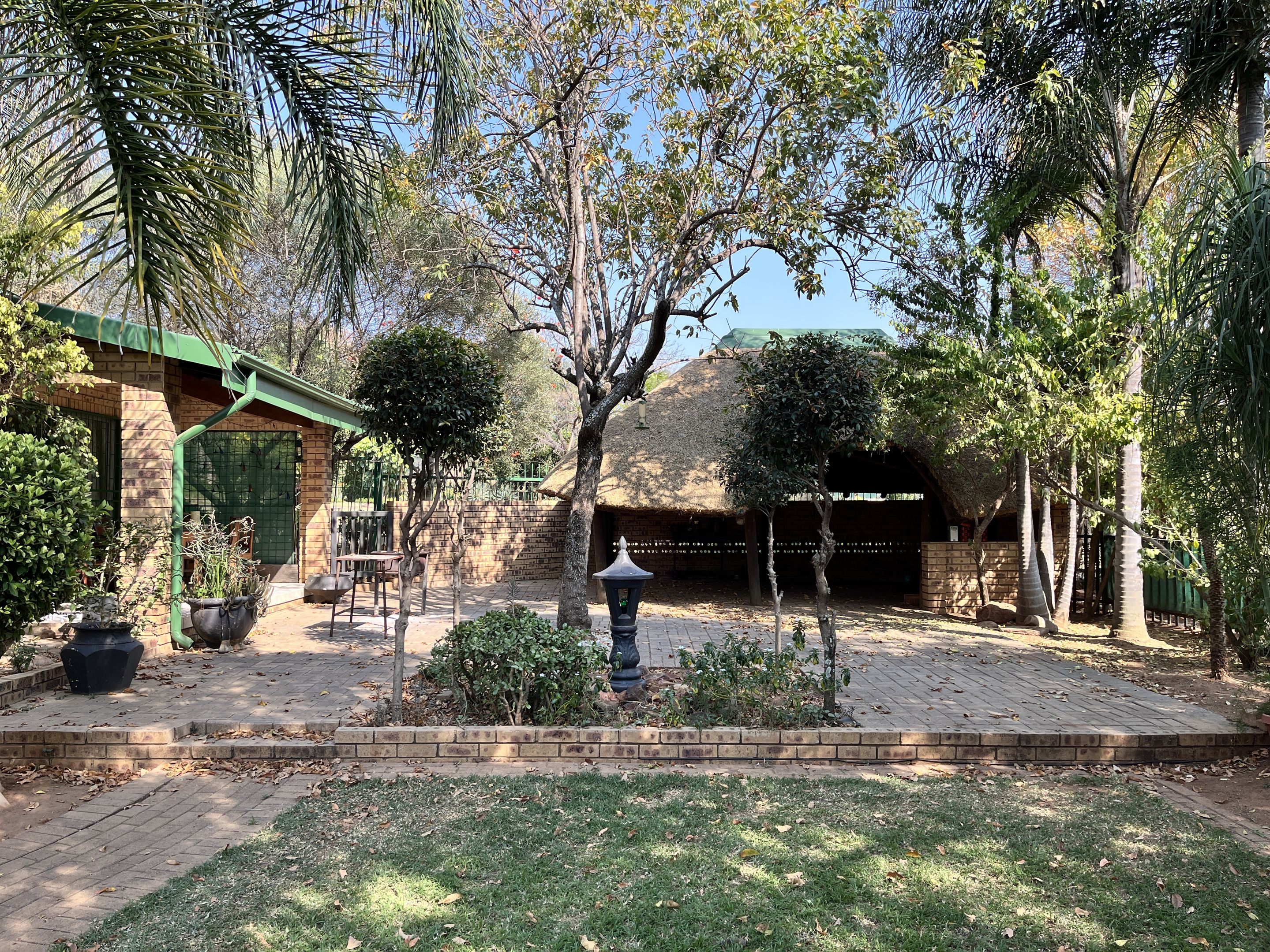 The open-plan lounge and dining area seamlessly connect to a fully equipped kitchen, complete with sturdy built-in cupboards, creating a welcoming and efficient living space. A corridor from the living area leads to the bedrooms, with the main bedroom thoughtfully designed on a slightly sunken level for added privacy and character. Perfectly suited for young families or retirees, the home boasts a large, fully enclosed yard adorned with citrus trees including oranges and lemons, as well as a multi-layered garden filled with vibrant plants and mature trees. Outdoor living is enhanced by a covered patio and a separate lapa, offering versatile spaces for relaxation and entertaining.