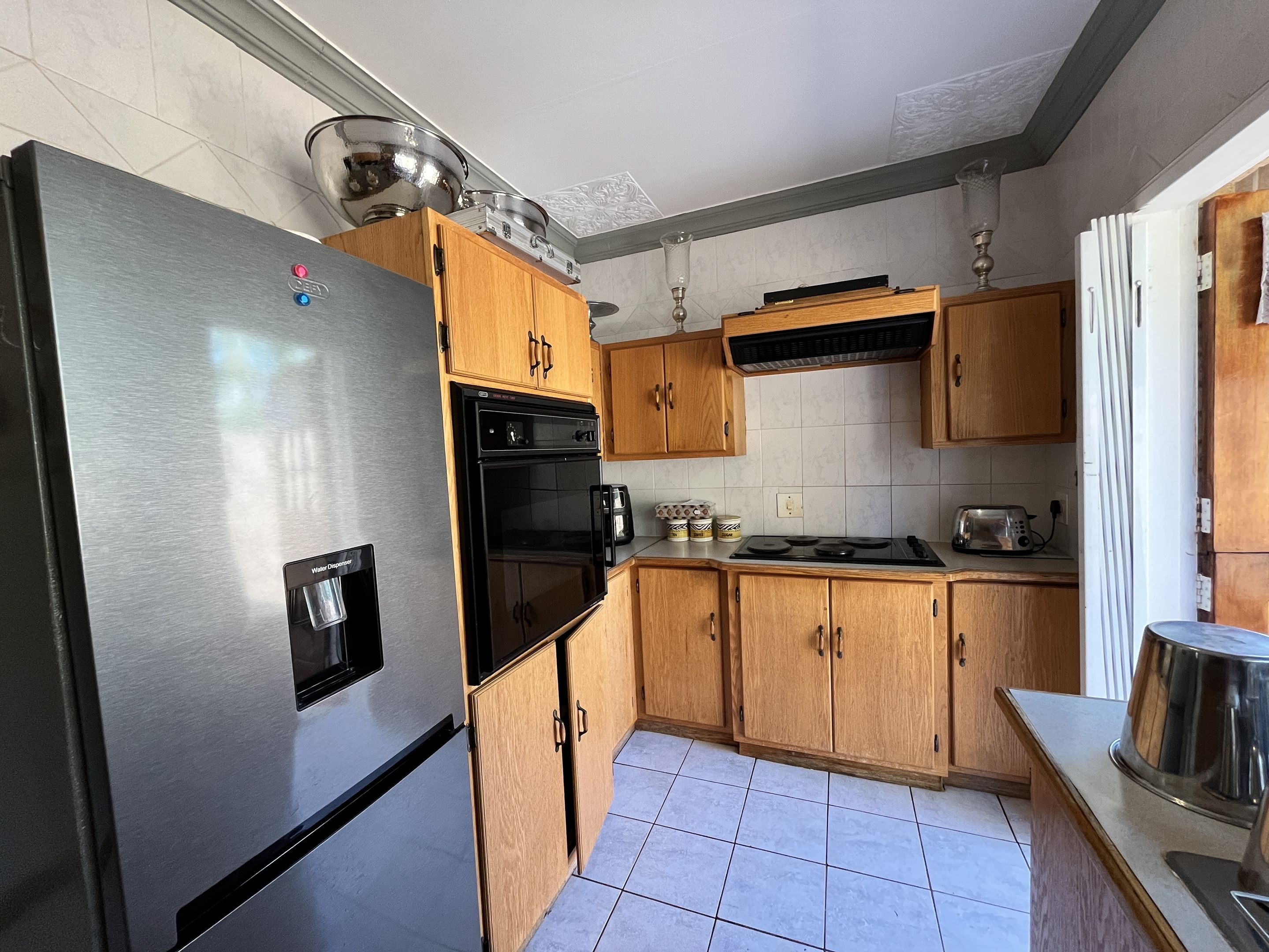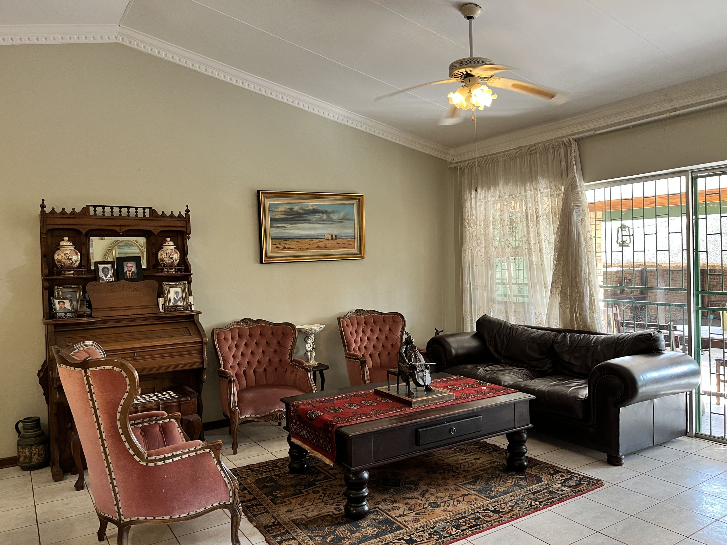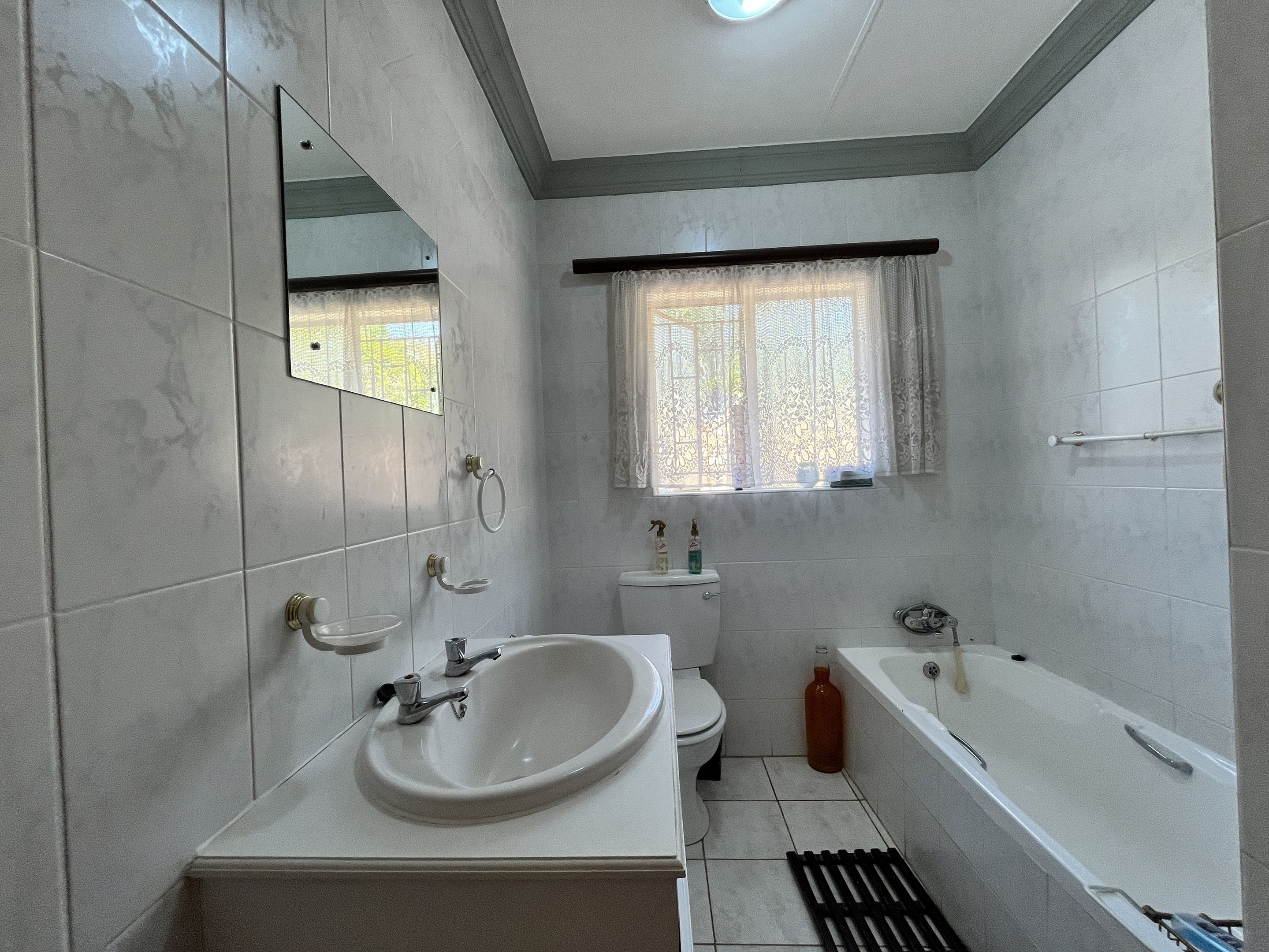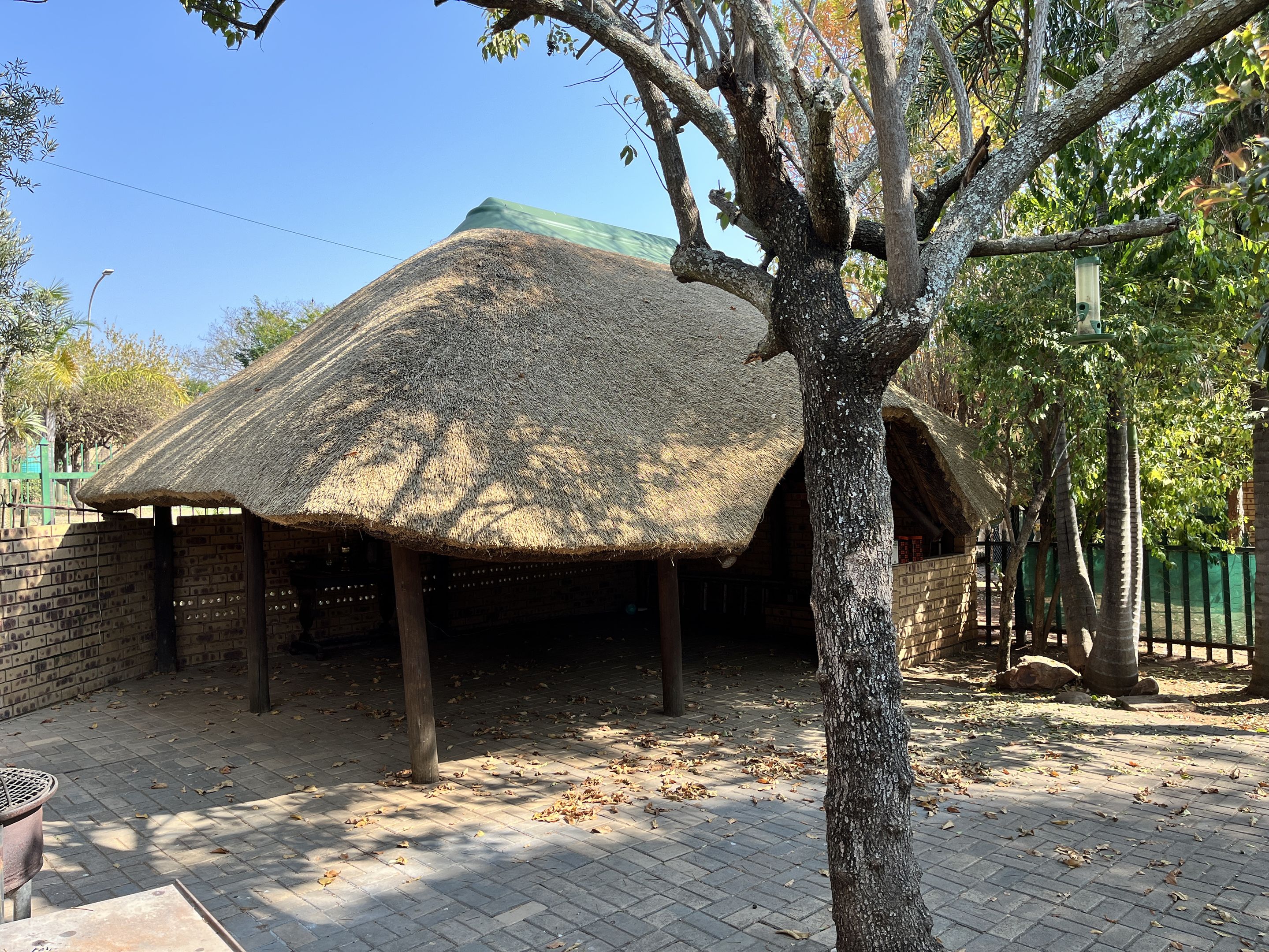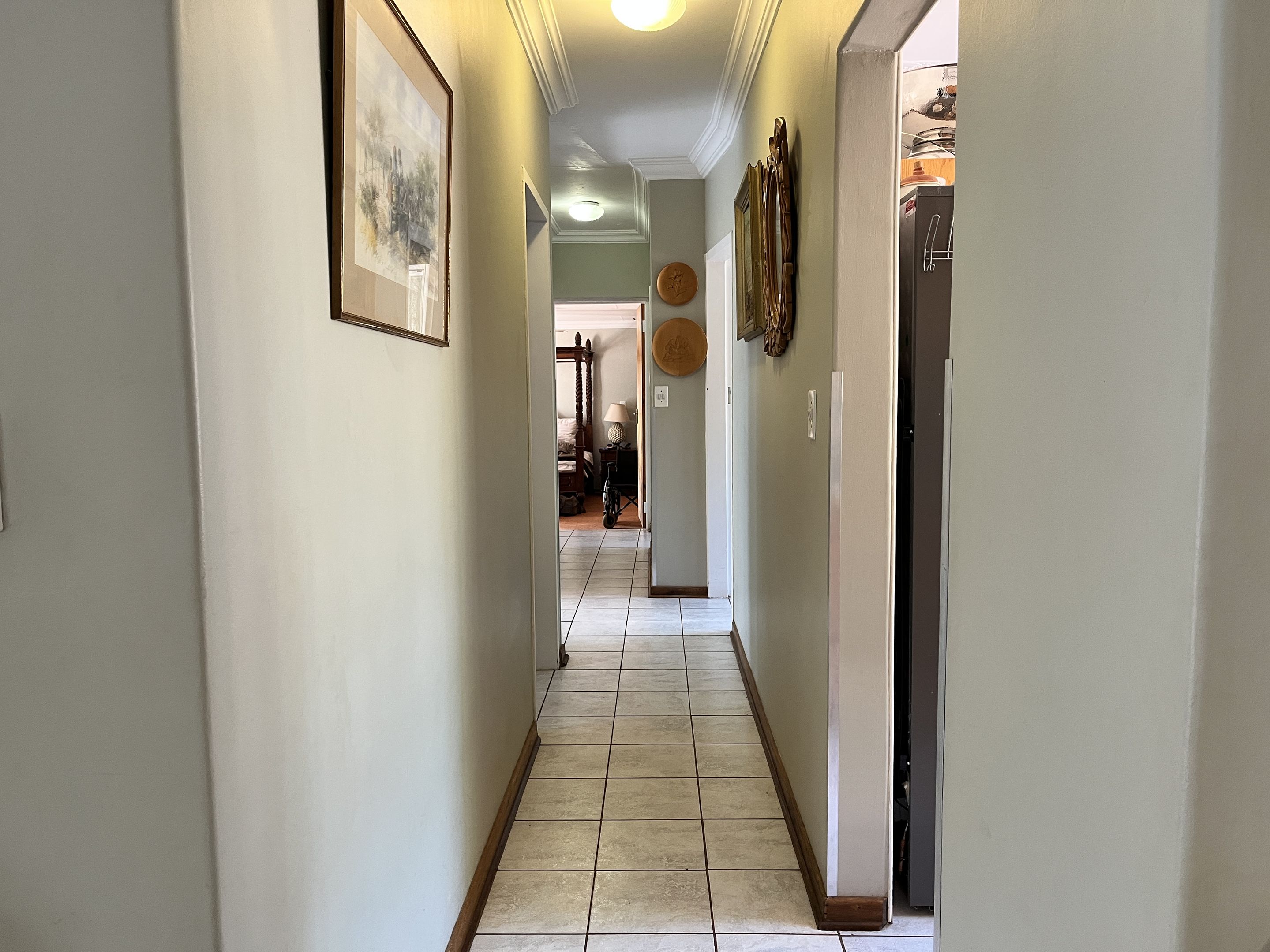 The open-plan lounge and dining area seamlessly connect to a fully equipped kitchen, complete with sturdy built-in cupboards, creating a welcoming and efficient living space. A corridor from the living area leads to the bedrooms, with the main bedroom thoughtfully designed on a slightly sunken level for added privacy and character. Perfectly suited for young families or retirees, the home boasts a large, fully enclosed yard adorned with citrus trees including oranges and lemons, as well as a multi-layered garden filled with vibrant plants and mature trees. Outdoor living is enhanced by a covered patio and a separate lapa, offering versatile spaces for relaxation and entertaining.