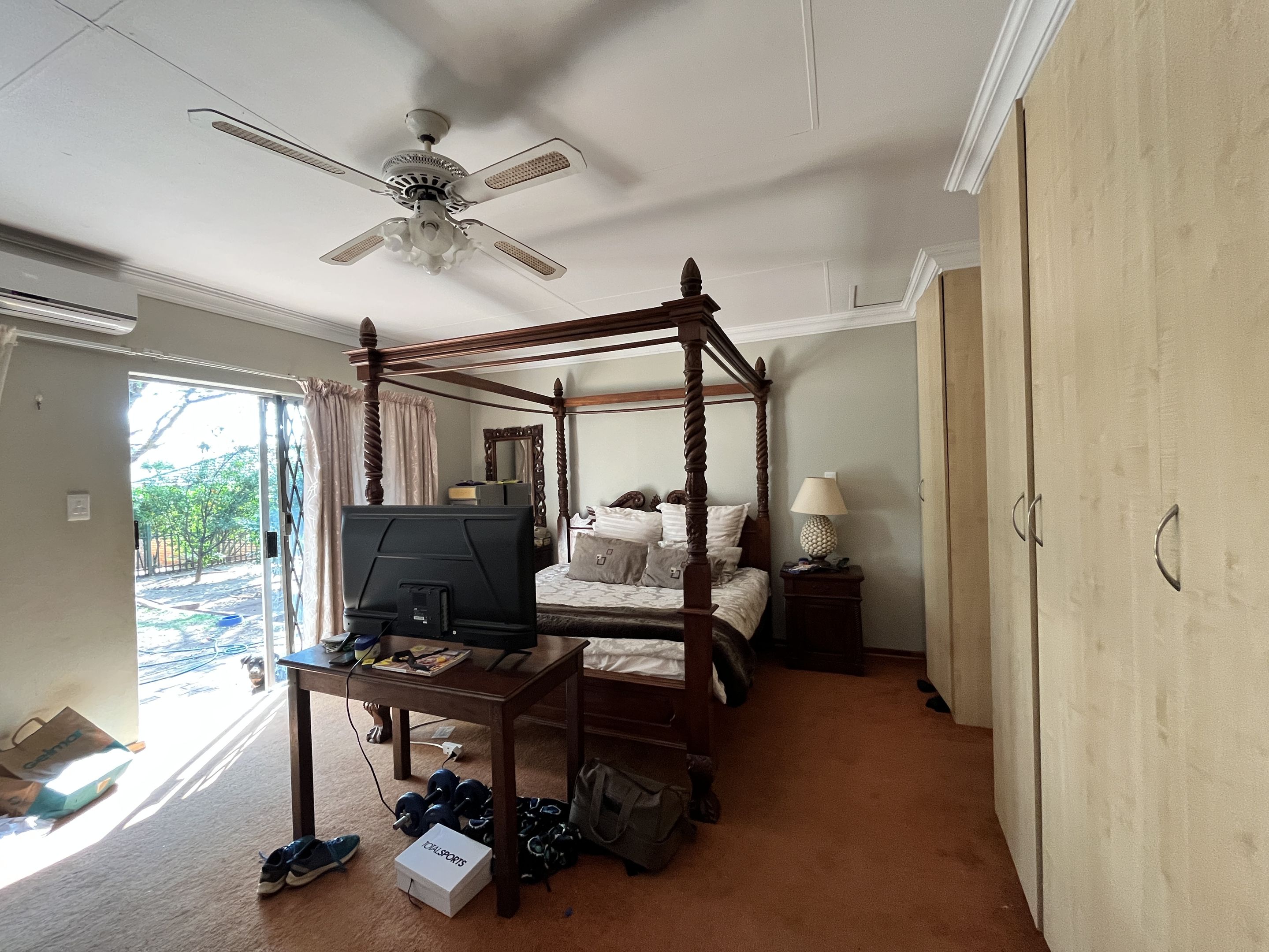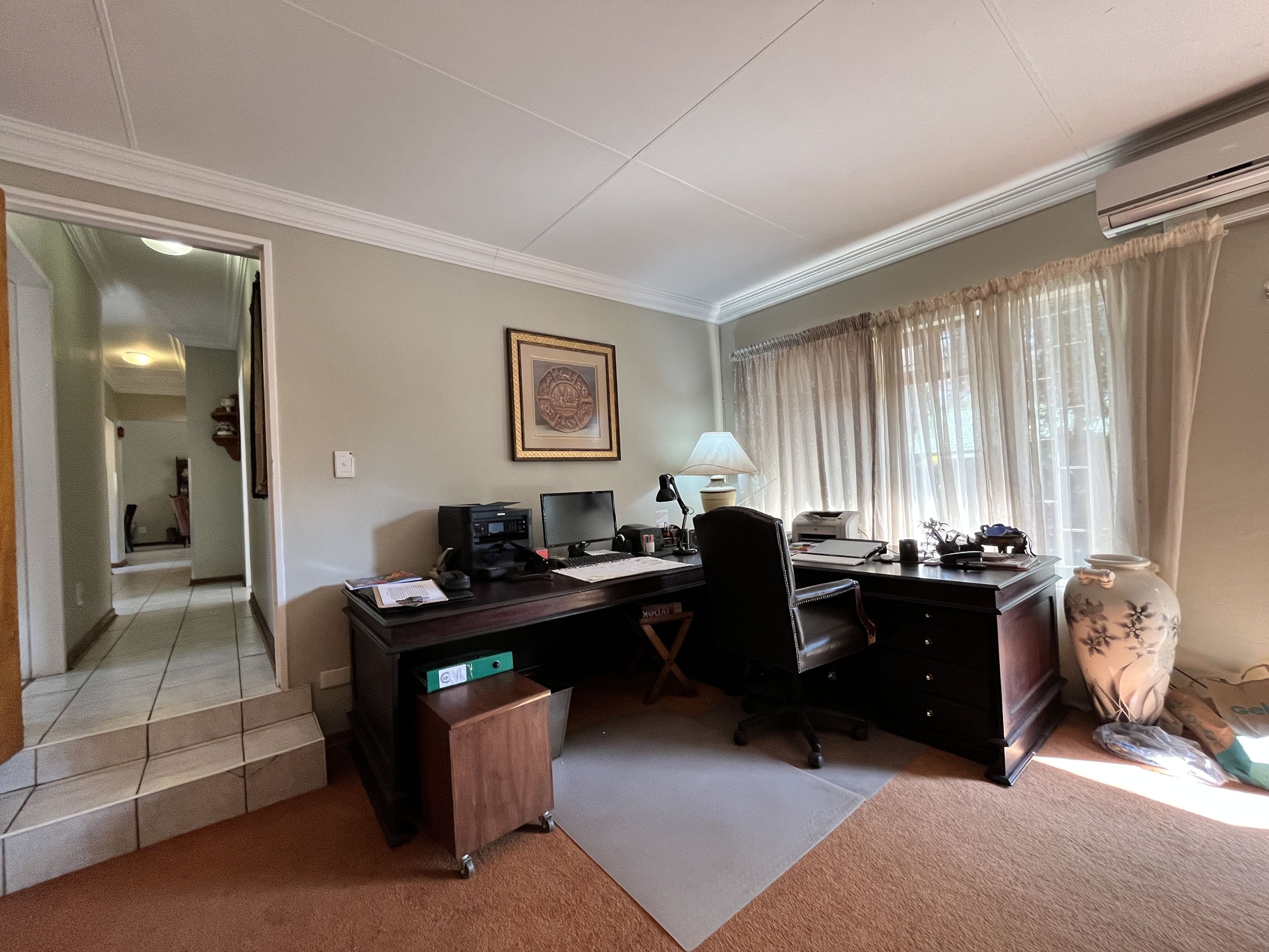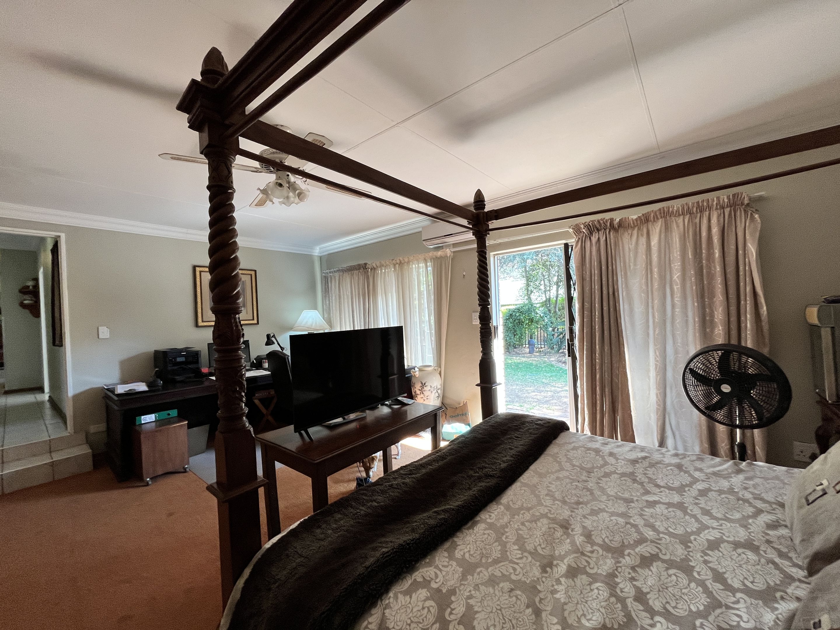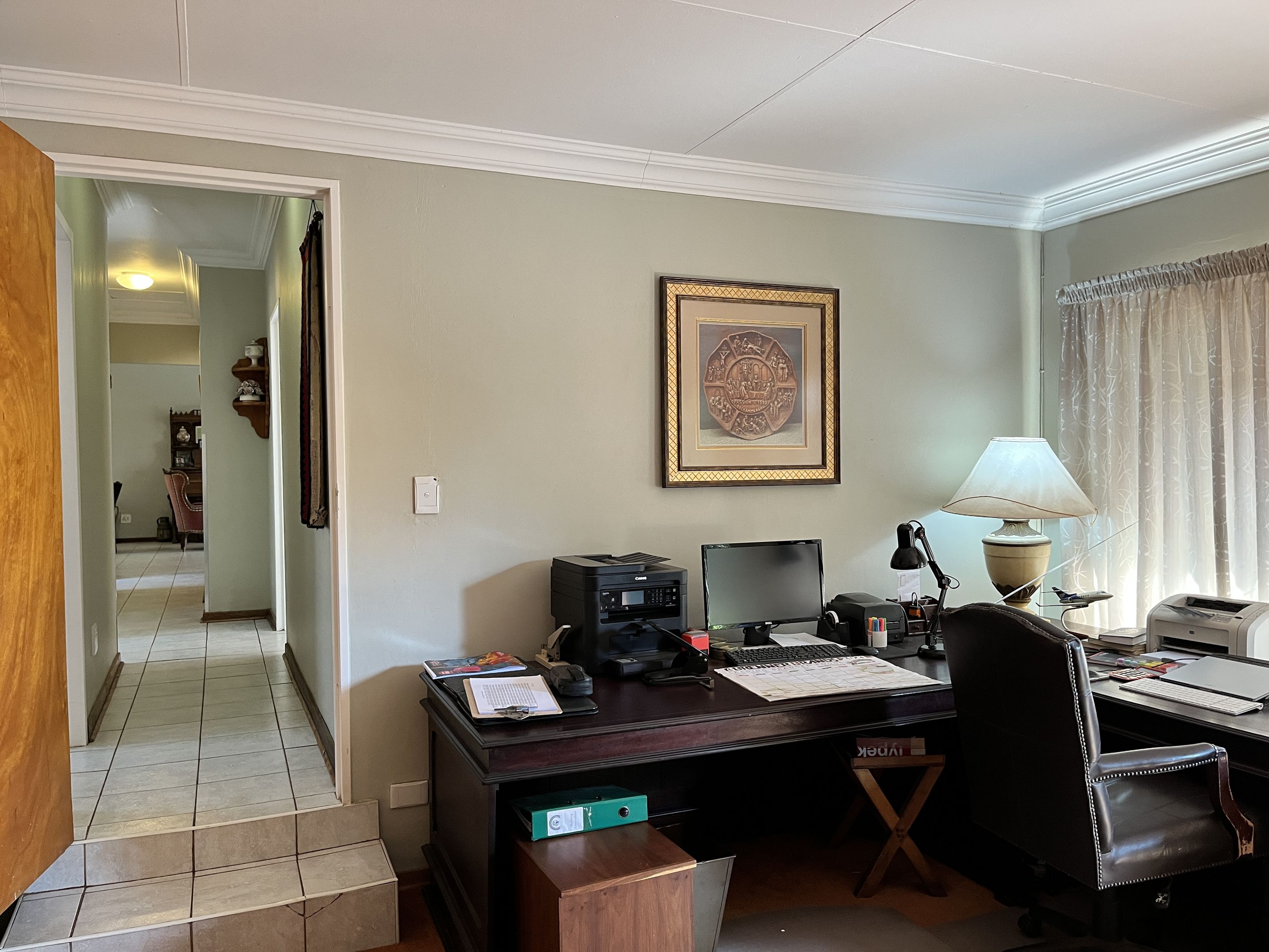 The open-plan lounge and dining area seamlessly connect to a fully equipped kitchen, complete with sturdy built-in cupboards, creating a welcoming and efficient living space. A corridor from the living area leads to the bedrooms, with the main bedroom thoughtfully designed on a slightly sunken level for added privacy and character. Perfectly suited for young families or retirees, the home boasts a large, fully enclosed yard adorned with citrus trees including oranges and lemons, as well as a multi-layered garden filled with vibrant plants and mature trees. Outdoor living is enhanced by a covered patio and a separate lapa, offering versatile spaces for relaxation and entertaining.