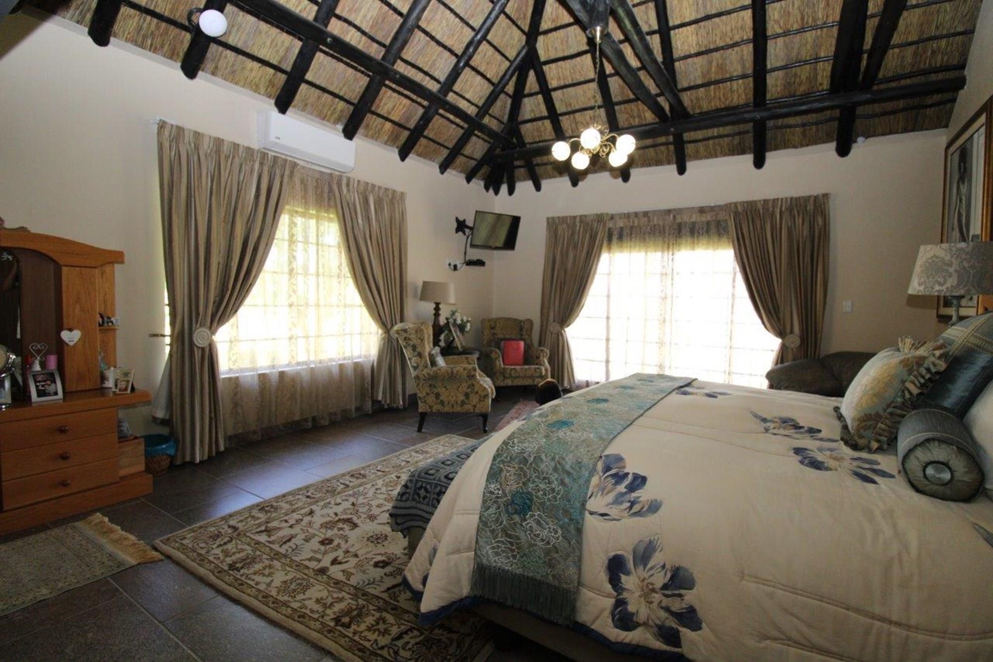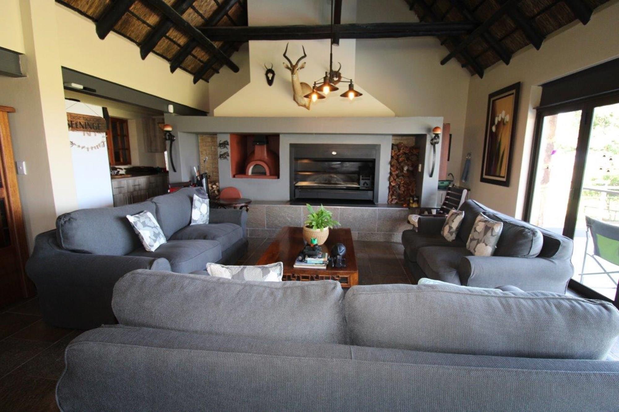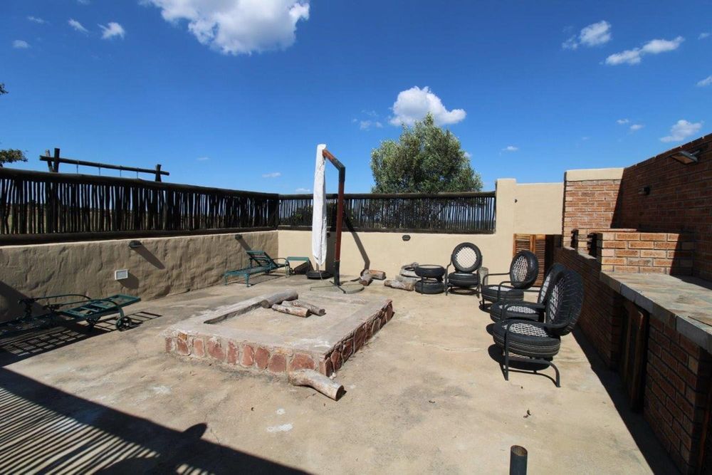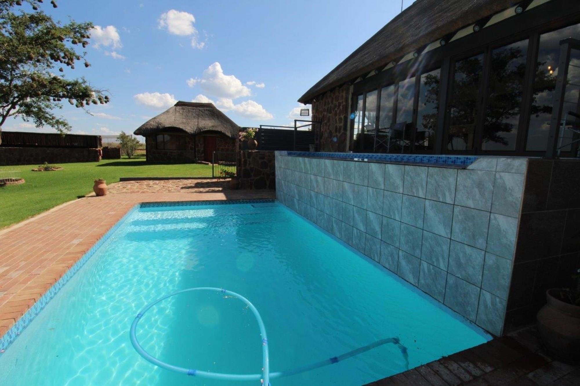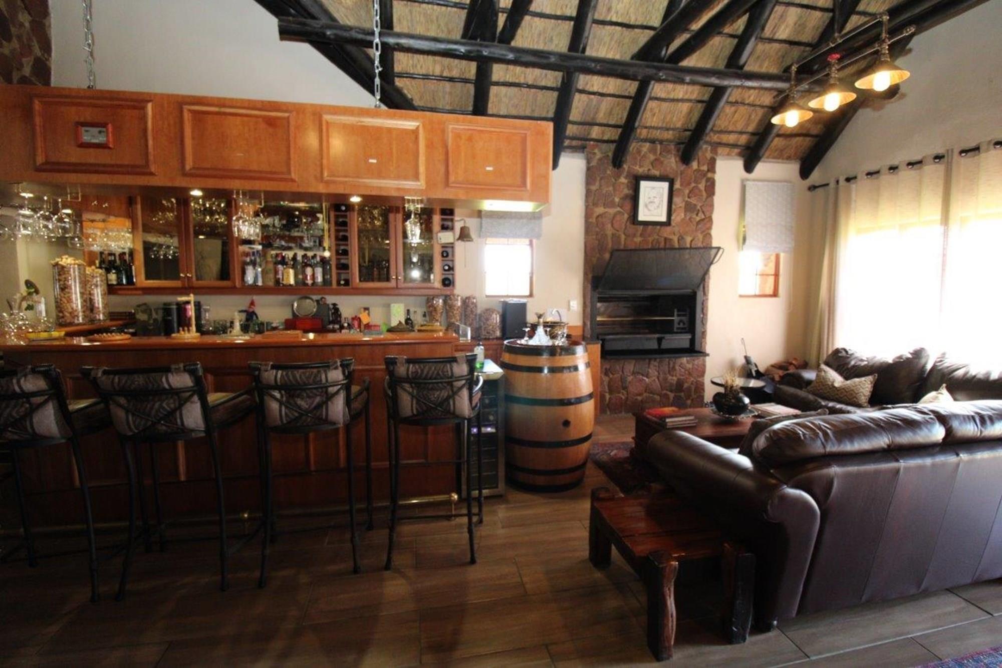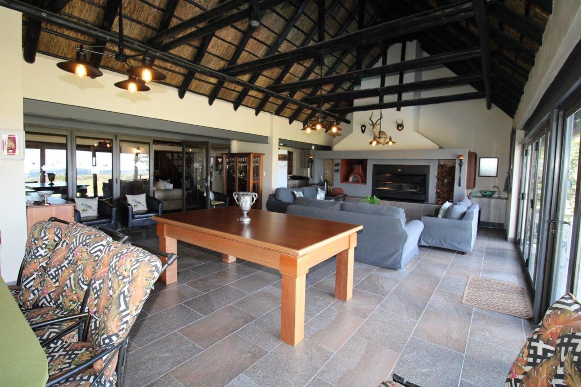 This property features a Main Lodge with four bedrooms and four bathrooms, as well as an open plan kitchen, dining room, and lounge which opens onto a large patio. There is also an additional loft lounge area, a conference facility for 20 people, a bar with a guest toilet, a swimming pool, a walk-in safe, and a well-manicured garden with automated irrigation. Very large boma braai area for functions and conferences overlooking the large earth dam. Excellent game viewing with giraffe, buffalo and other plains game drinking water at the dam. Guests may also utilise a private picnic and boma braai area situated on the mountain above the lodge with spectacular views. Internet installation included.