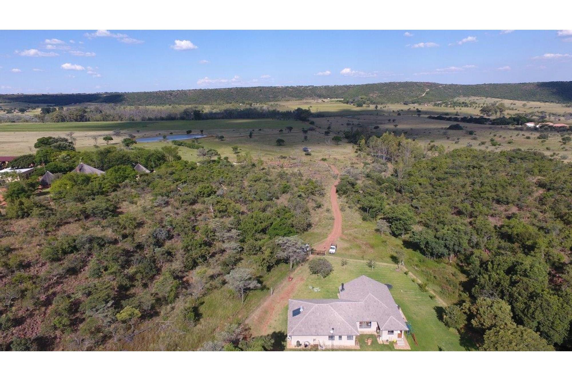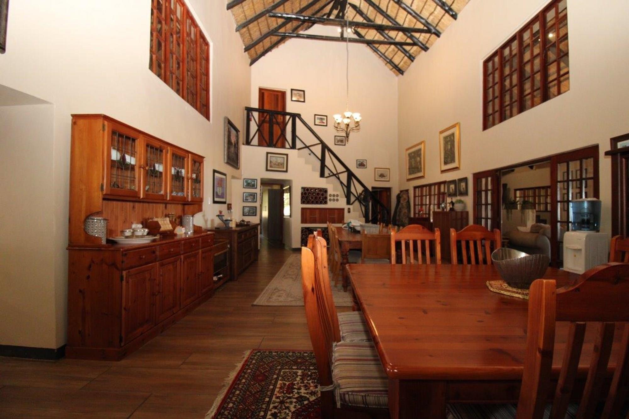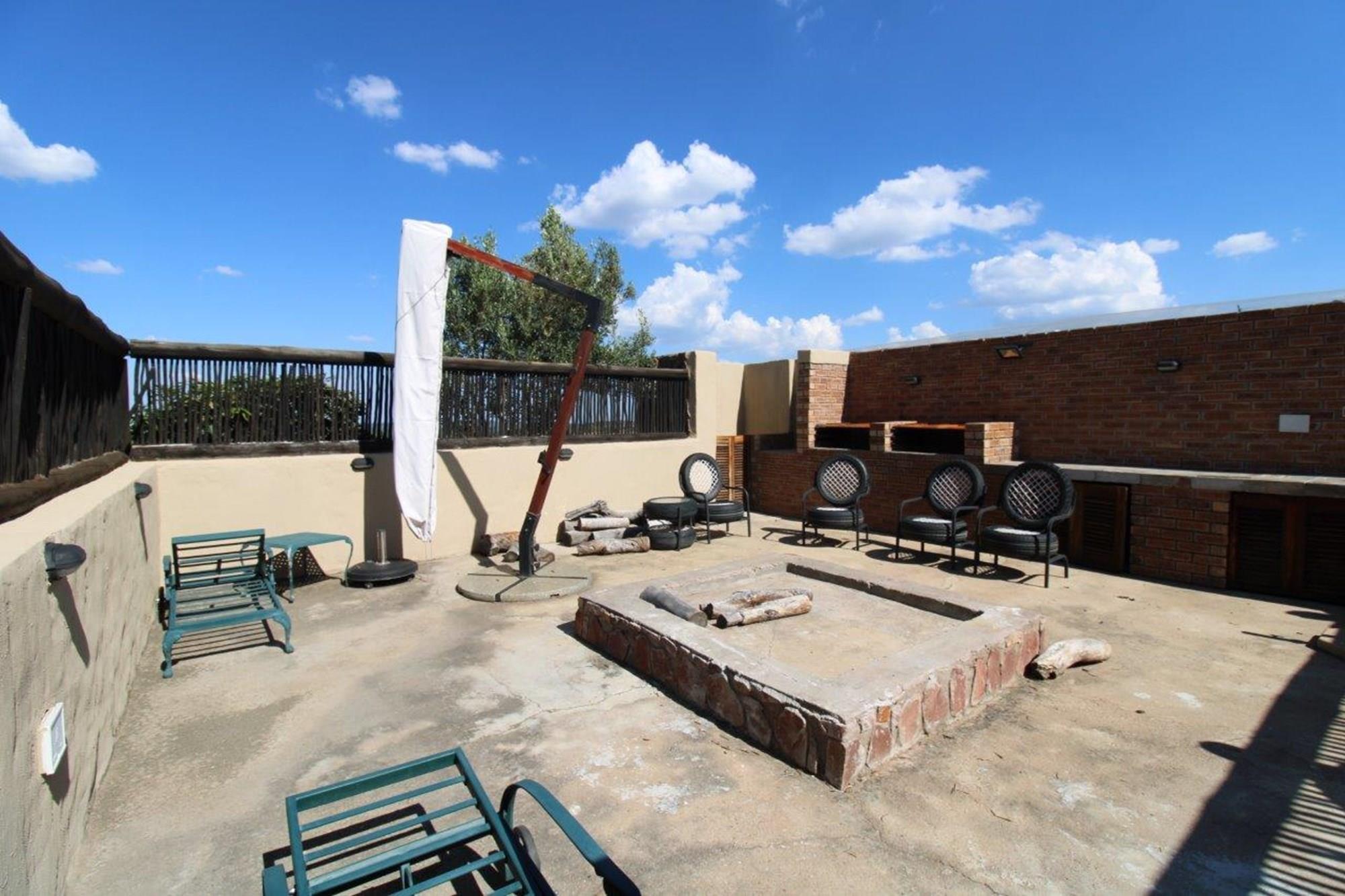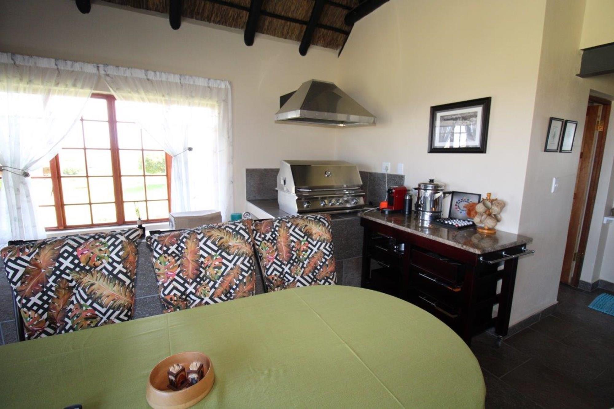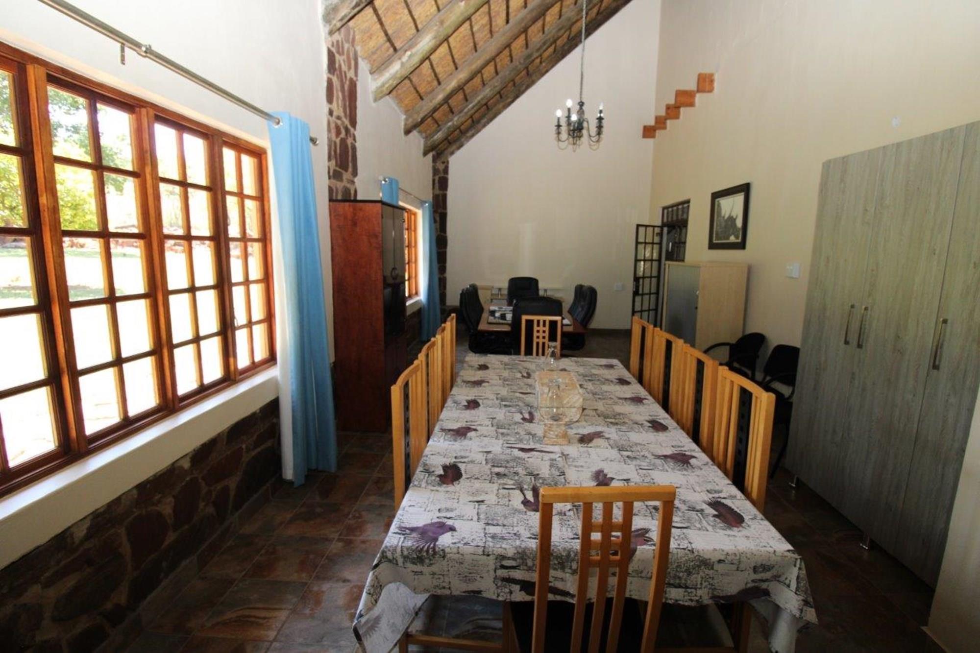 This property features a Main Lodge with four bedrooms and four bathrooms, as well as an open plan kitchen, dining room, and lounge which opens onto a large patio. There is also an additional loft lounge area, a conference facility for 20 people, a bar with a guest toilet, a swimming pool, a walk-in safe, and a well-manicured garden with automated irrigation. Very large boma braai area for functions and conferences overlooking the large earth dam. Excellent game viewing with giraffe, buffalo and other plains game drinking water at the dam. Guests may also utilise a private picnic and boma braai area situated on the mountain above the lodge with spectacular views. Internet installation included.
