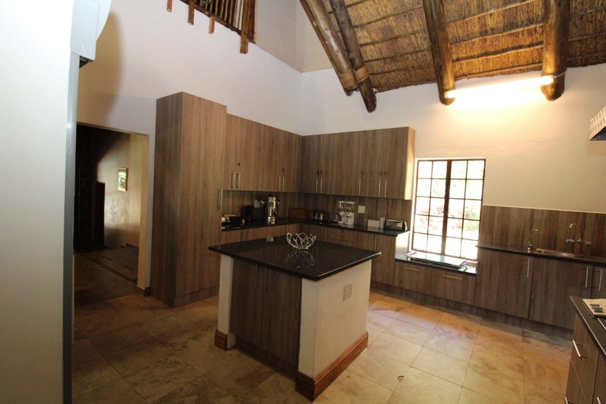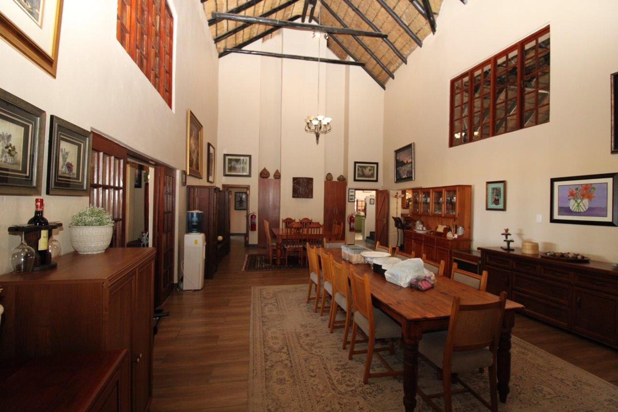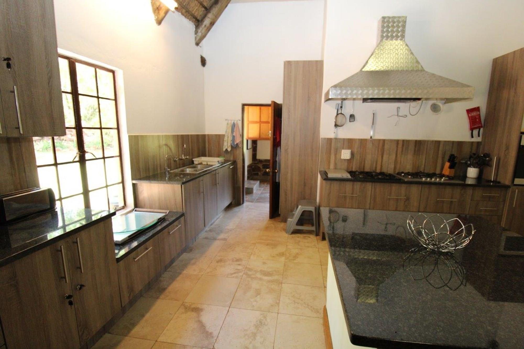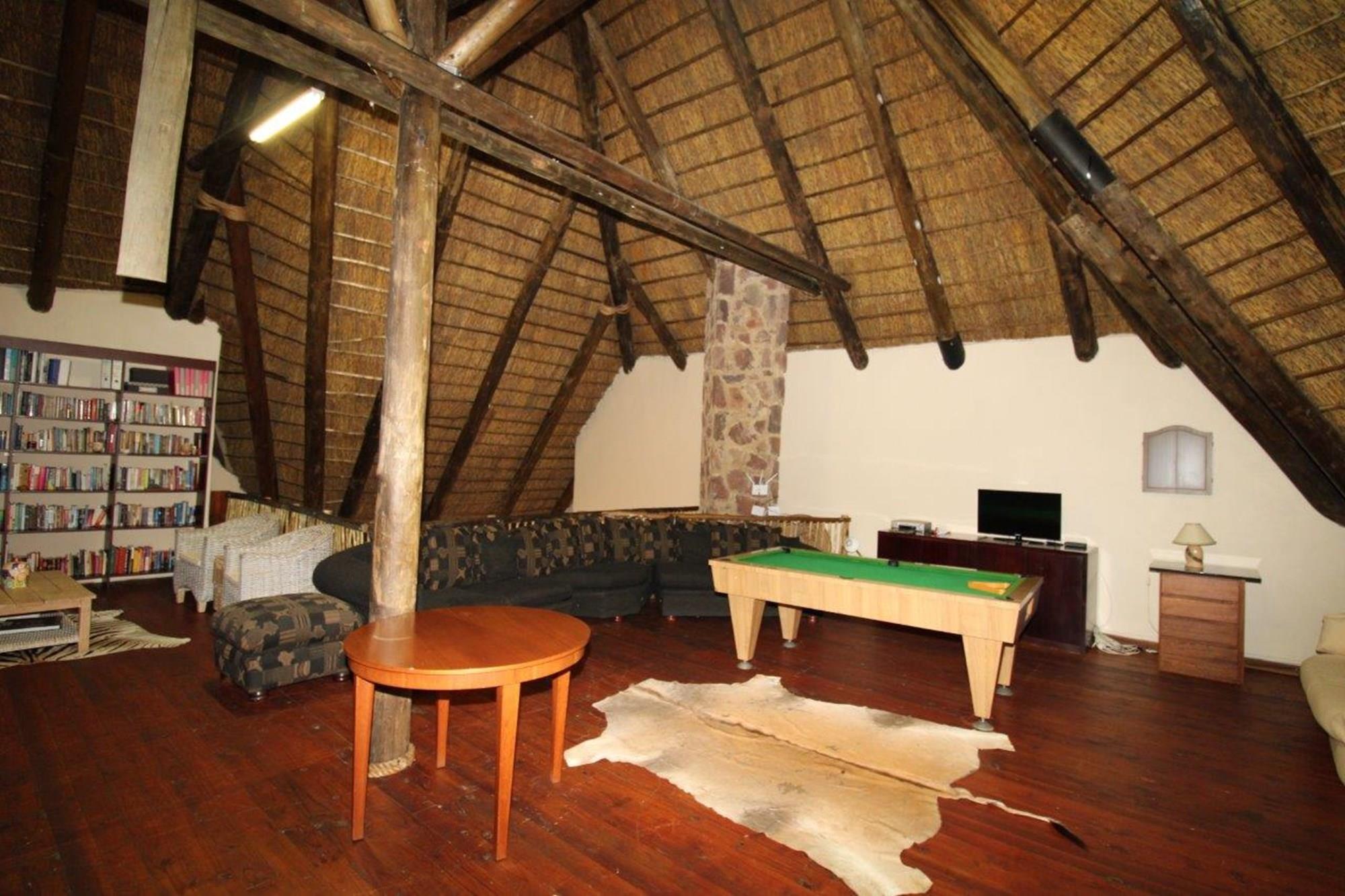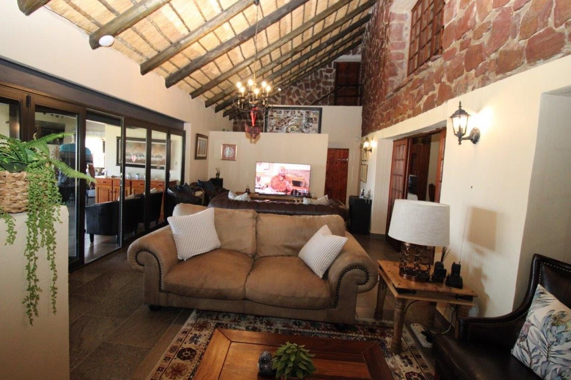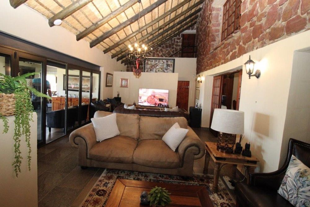 This property features a Main Lodge with four bedrooms and four bathrooms, as well as an open plan kitchen, dining room, and lounge which opens onto a large patio. There is also an additional loft lounge area, a conference facility for 20 people, a bar with a guest toilet, a swimming pool, a walk-in safe, and a well-manicured garden with automated irrigation. Very large boma braai area for functions and conferences overlooking the large earth dam. Excellent game viewing with giraffe, buffalo and other plains game drinking water at the dam. Guests may also utilise a private picnic and boma braai area situated on the mountain above the lodge with spectacular views. Internet installation included.