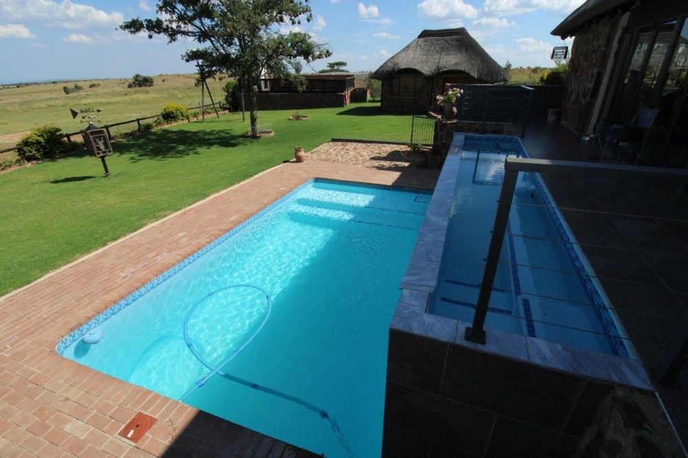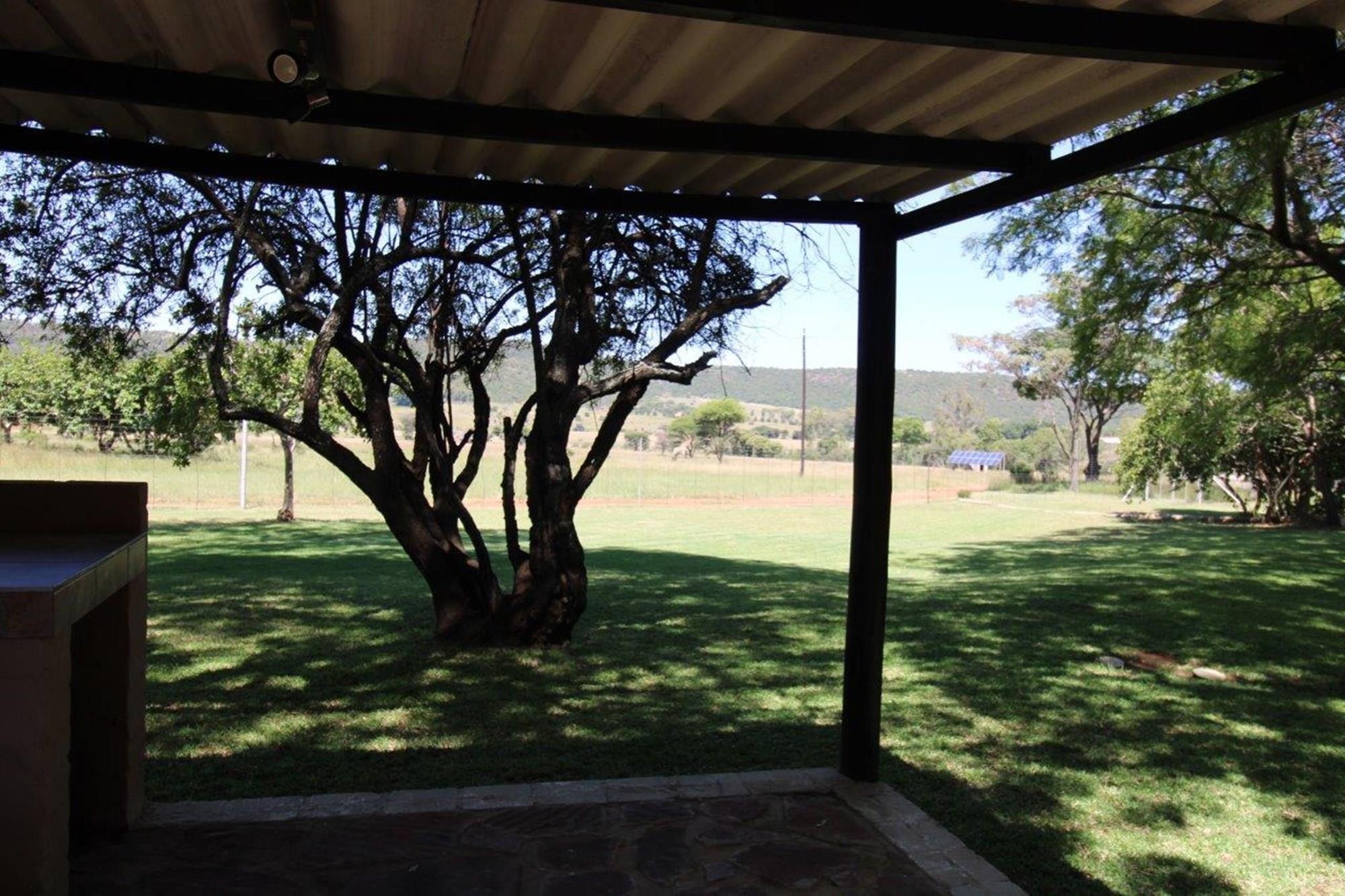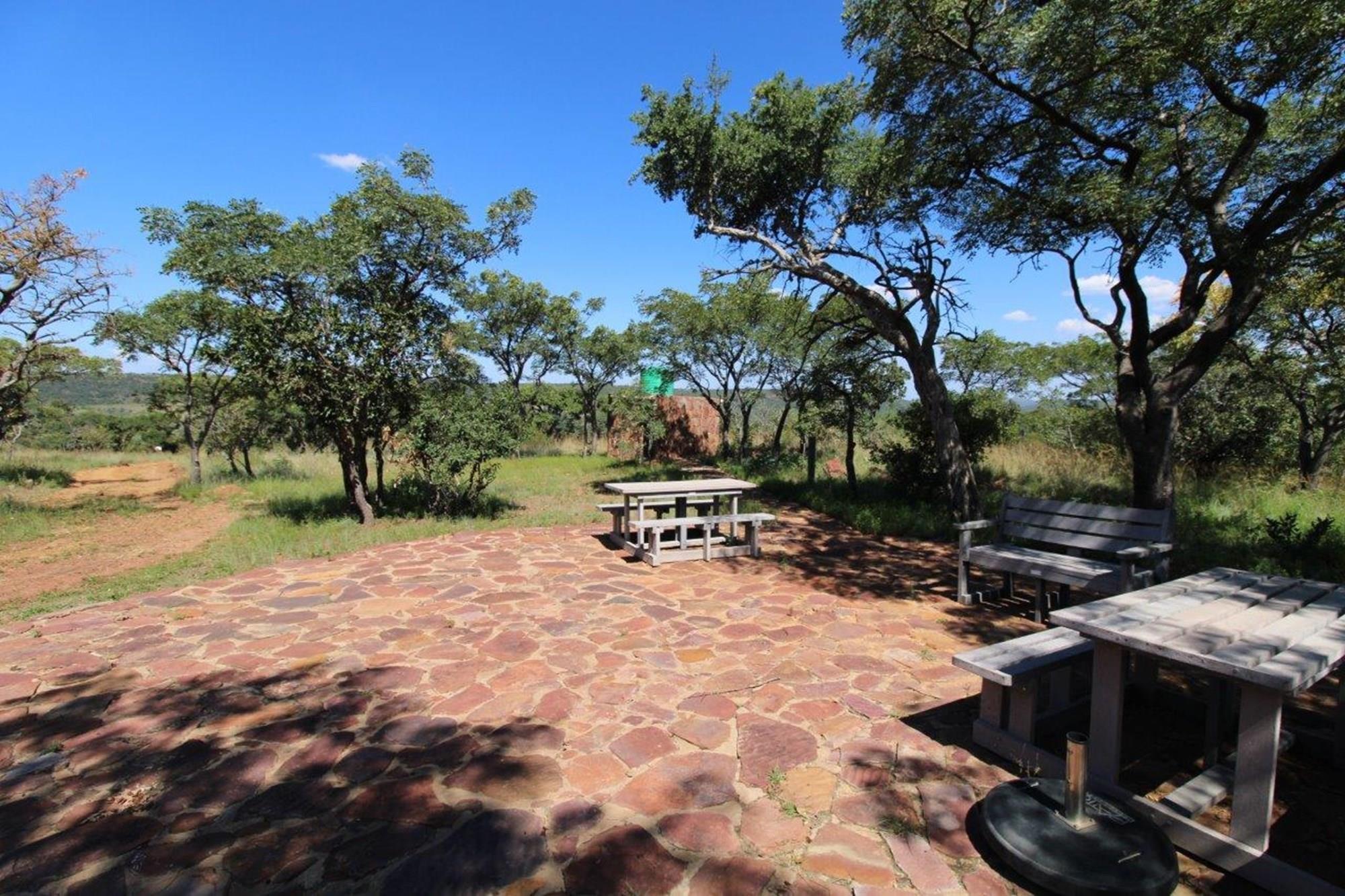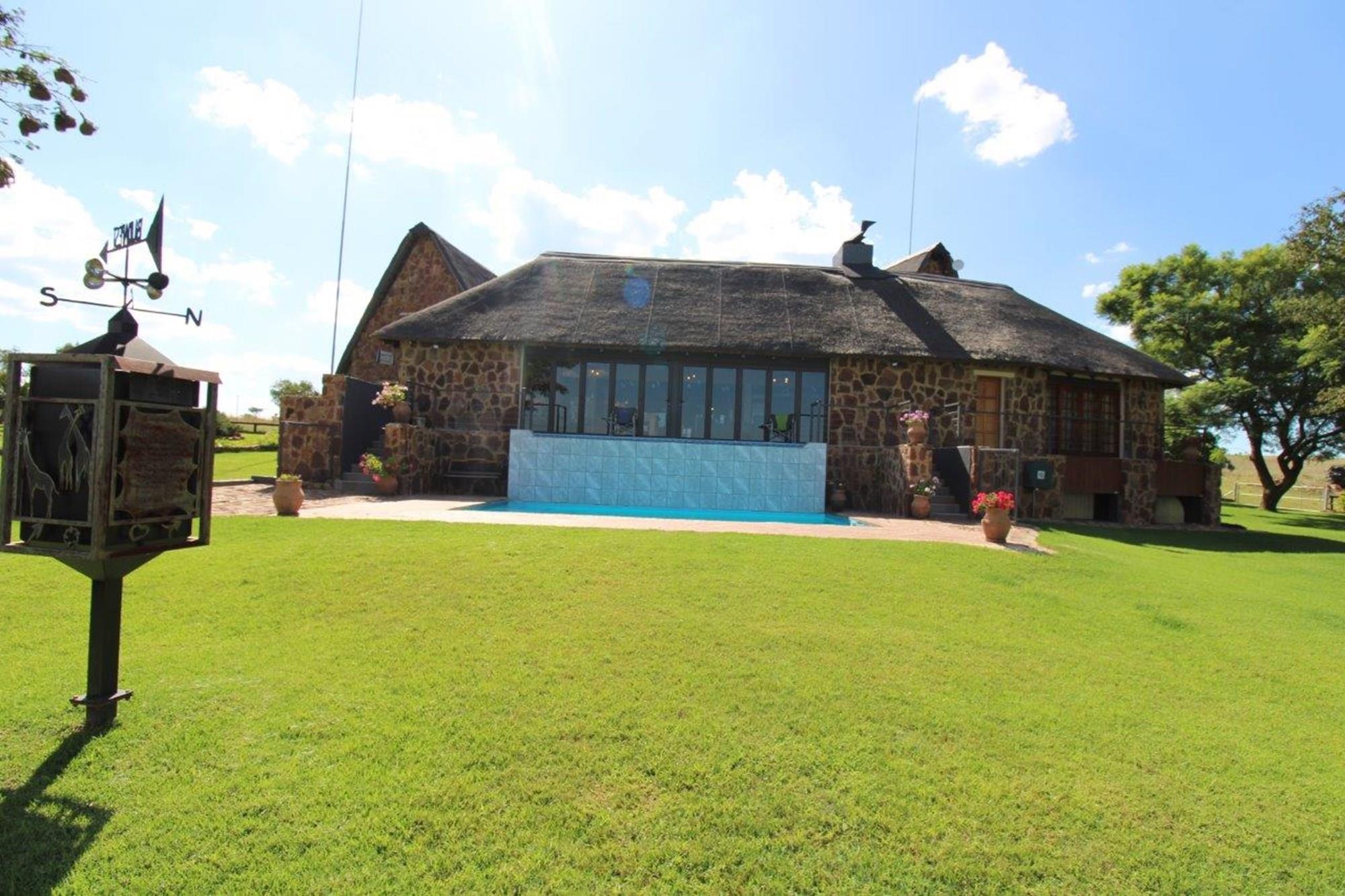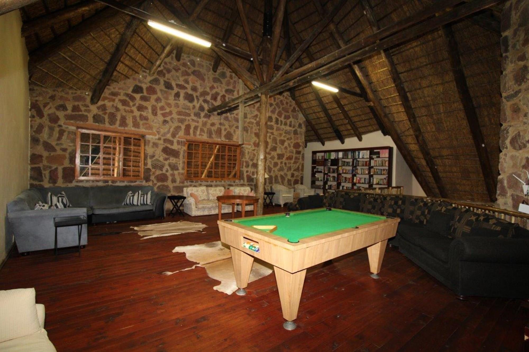 This property features a Main Lodge with four bedrooms and four bathrooms, as well as an open plan kitchen, dining room, and lounge which opens onto a large patio. There is also an additional loft lounge area, a conference facility for 20 people, a bar with a guest toilet, a swimming pool, a walk-in safe, and a well-manicured garden with automated irrigation. Very large boma braai area for functions and conferences overlooking the large earth dam. Excellent game viewing with giraffe, buffalo and other plains game drinking water at the dam. Guests may also utilise a private picnic and boma braai area situated on the mountain above the lodge with spectacular views. Internet installation included.