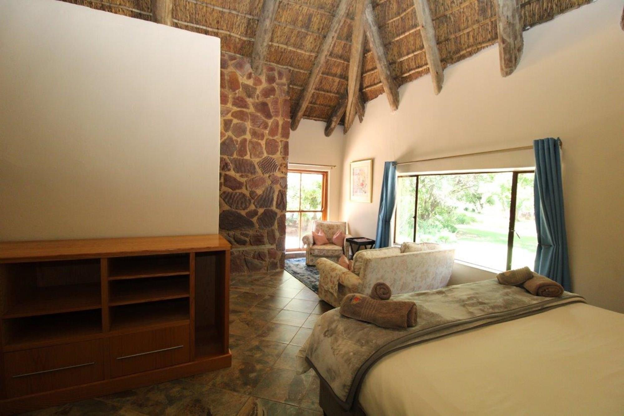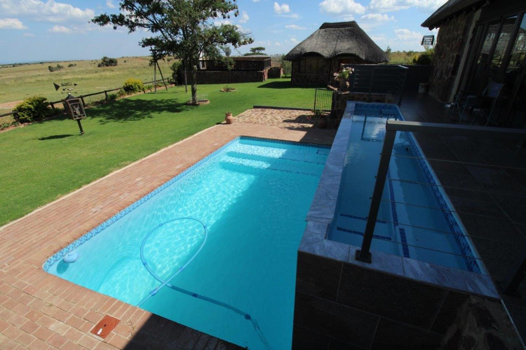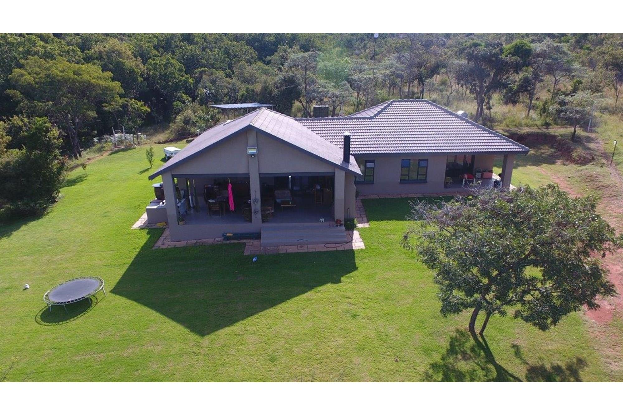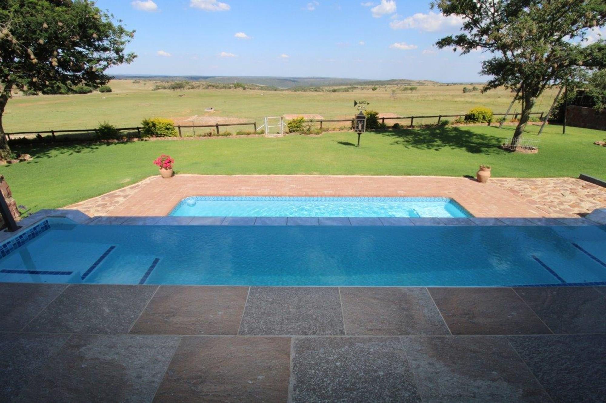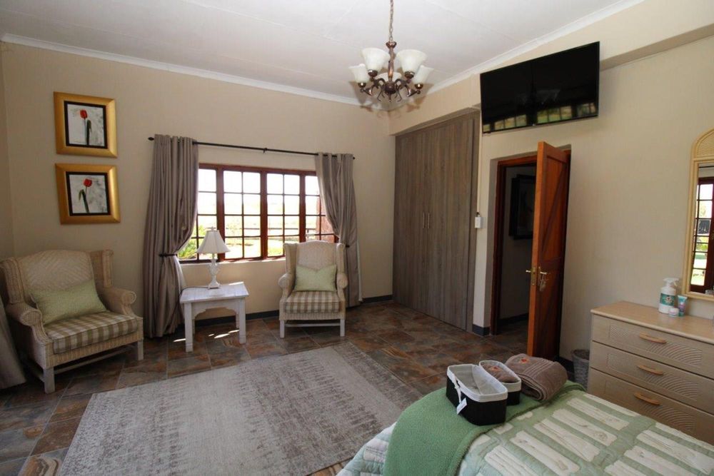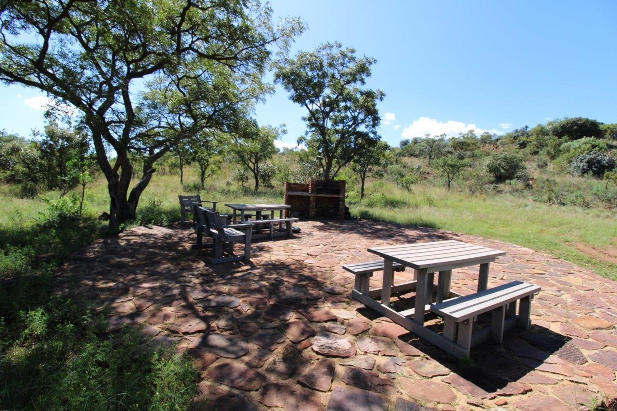 This property features a Main Lodge with four bedrooms and four bathrooms, as well as an open plan kitchen, dining room, and lounge which opens onto a large patio. There is also an additional loft lounge area, a conference facility for 20 people, a bar with a guest toilet, a swimming pool, a walk-in safe, and a well-manicured garden with automated irrigation. Very large boma braai area for functions and conferences overlooking the large earth dam. Excellent game viewing with giraffe, buffalo and other plains game drinking water at the dam. Guests may also utilise a private picnic and boma braai area situated on the mountain above the lodge with spectacular views. Internet installation included.