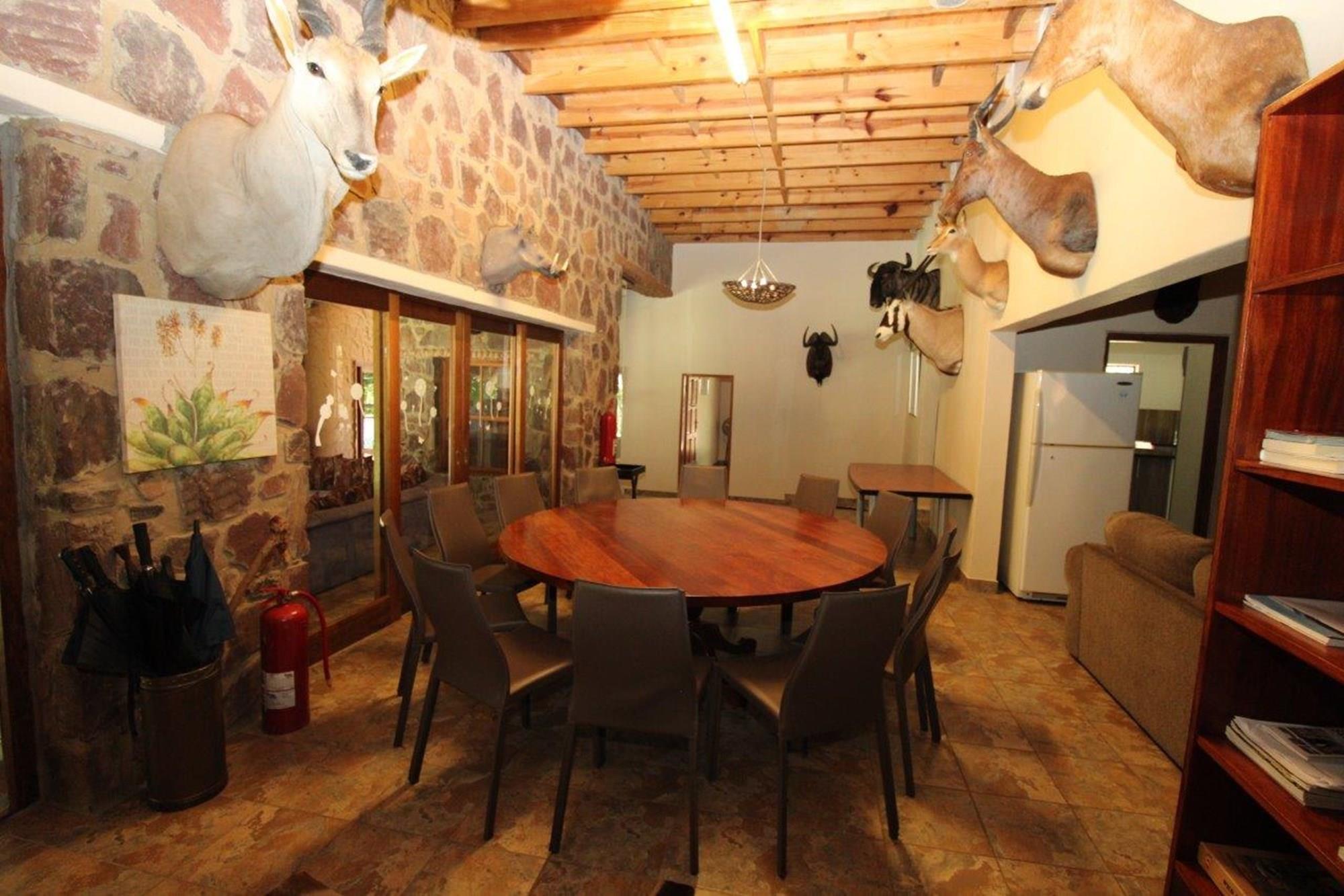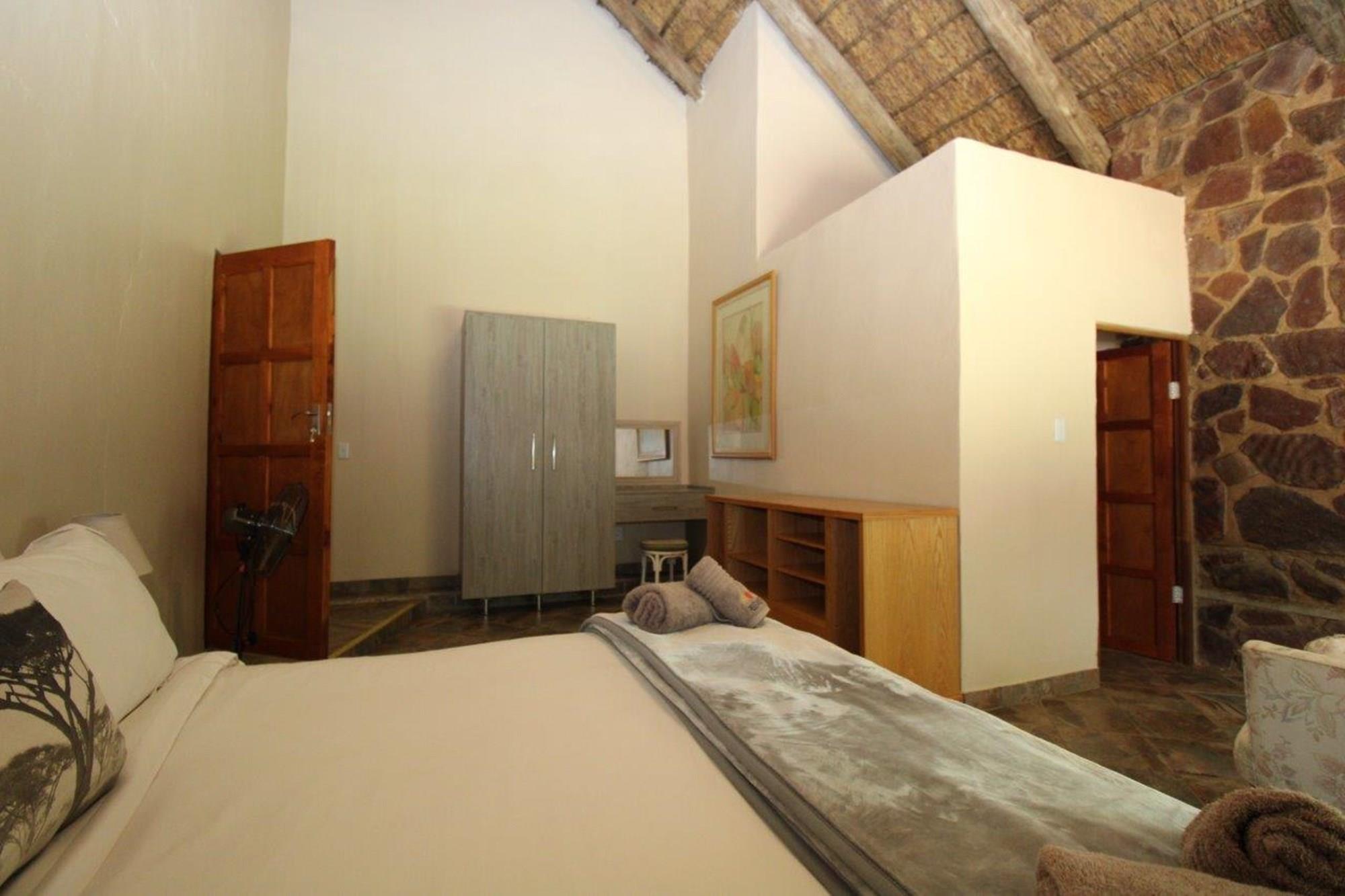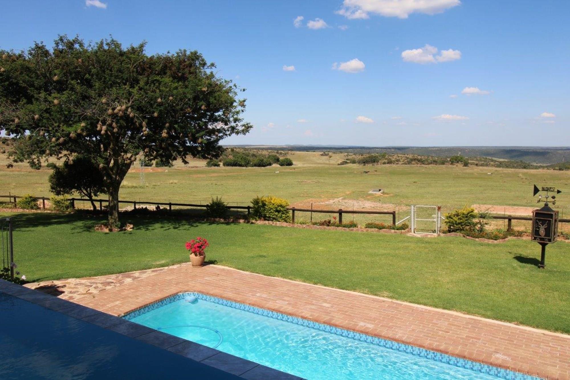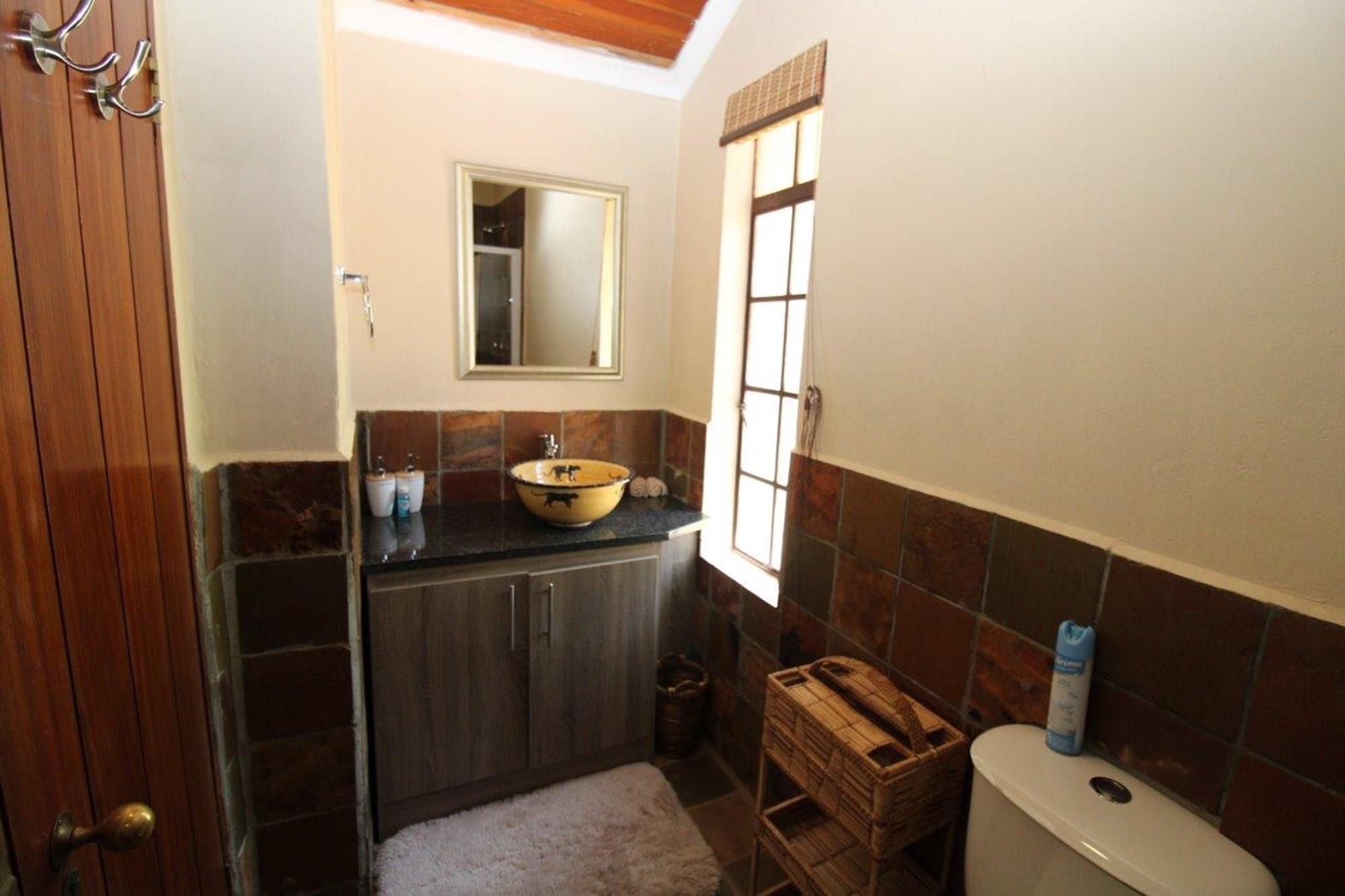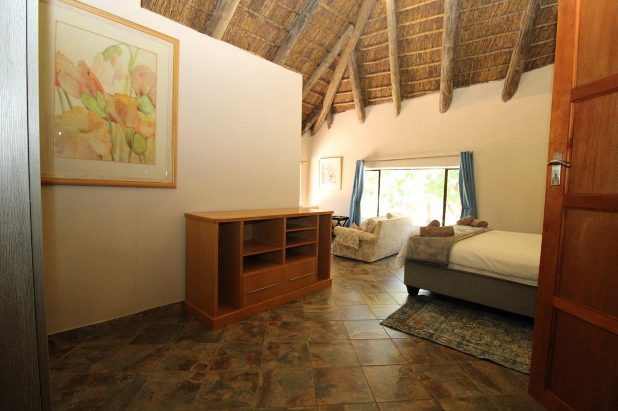 This property features a Main Lodge with four bedrooms and four bathrooms, as well as an open plan kitchen, dining room, and lounge which opens onto a large patio. There is also an additional loft lounge area, a conference facility for 20 people, a bar with a guest toilet, a swimming pool, a walk-in safe, and a well-manicured garden with automated irrigation. Very large boma braai area for functions and conferences overlooking the large earth dam. Excellent game viewing with giraffe, buffalo and other plains game drinking water at the dam. Guests may also utilise a private picnic and boma braai area situated on the mountain above the lodge with spectacular views. Internet installation included.