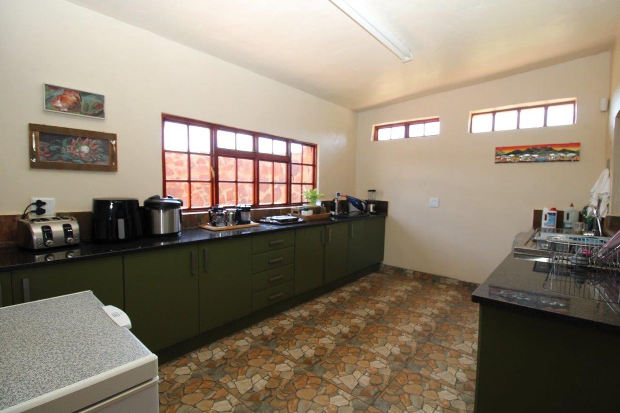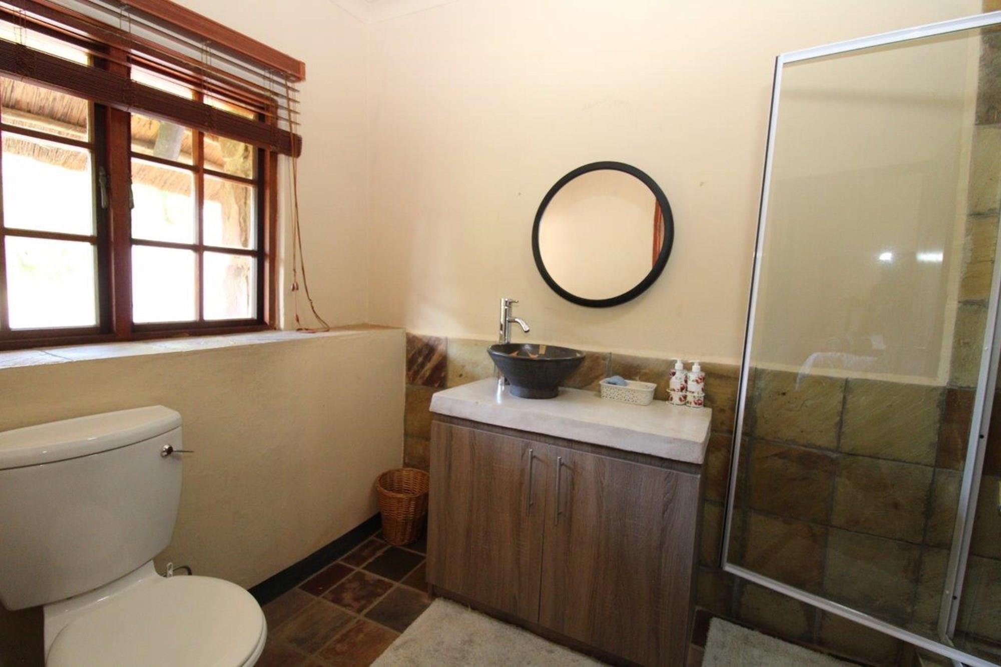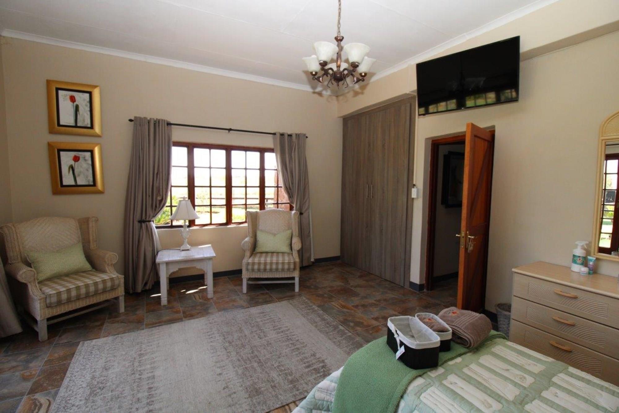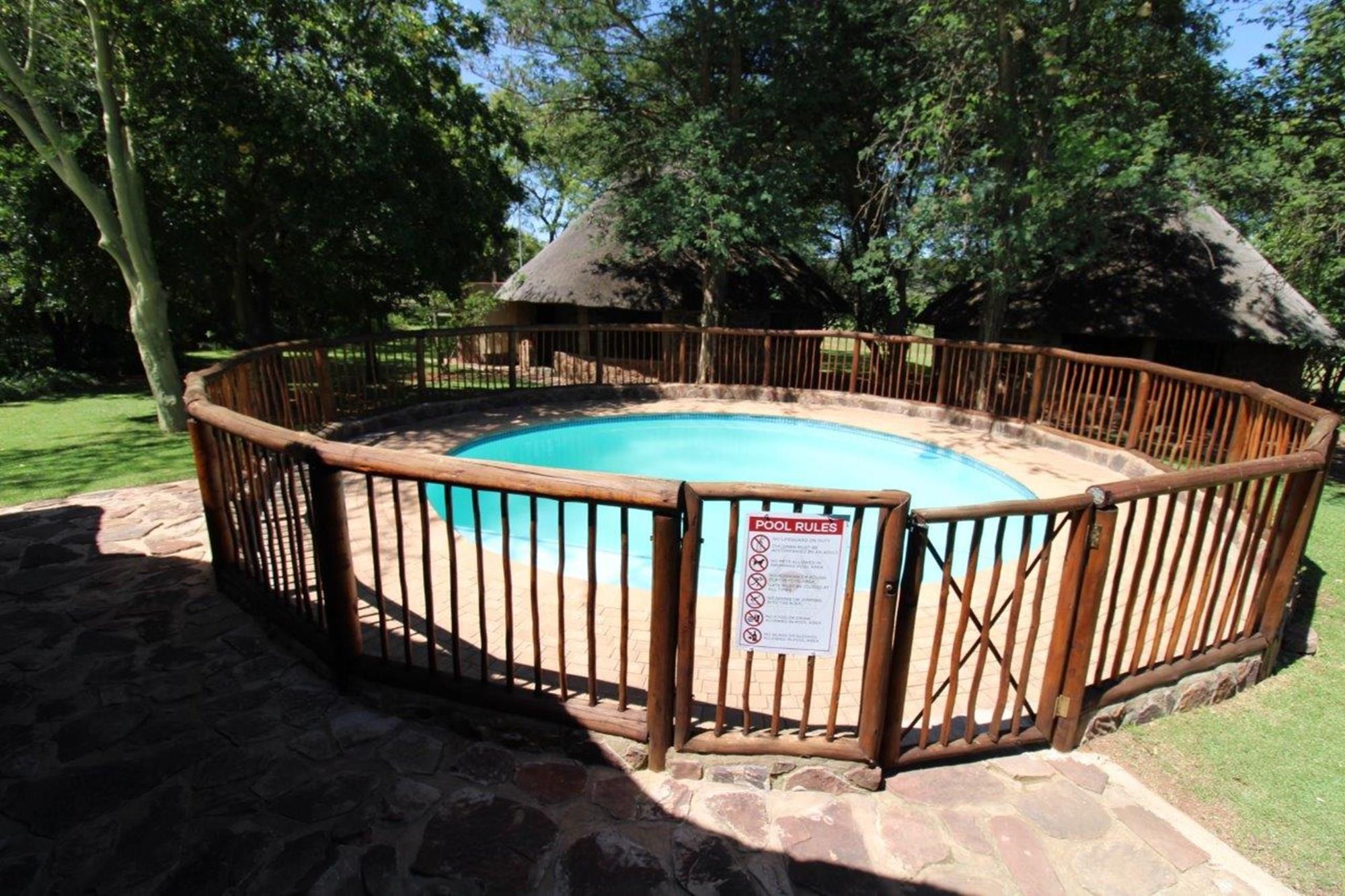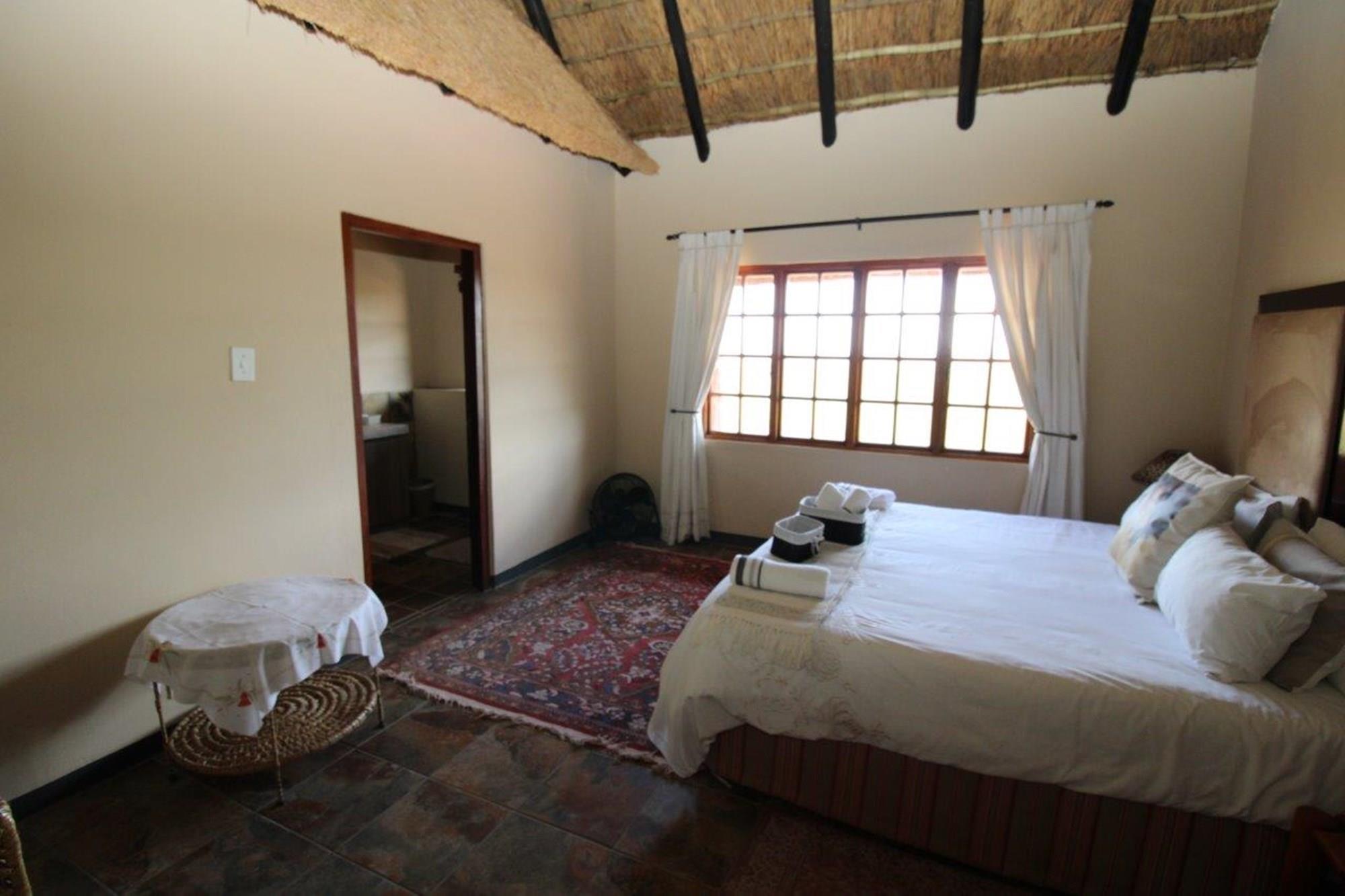 This property features a Main Lodge with four bedrooms and four bathrooms, as well as an open plan kitchen, dining room, and lounge which opens onto a large patio. There is also an additional loft lounge area, a conference facility for 20 people, a bar with a guest toilet, a swimming pool, a walk-in safe, and a well-manicured garden with automated irrigation. Very large boma braai area for functions and conferences overlooking the large earth dam. Excellent game viewing with giraffe, buffalo and other plains game drinking water at the dam. Guests may also utilise a private picnic and boma braai area situated on the mountain above the lodge with spectacular views. Internet installation included.