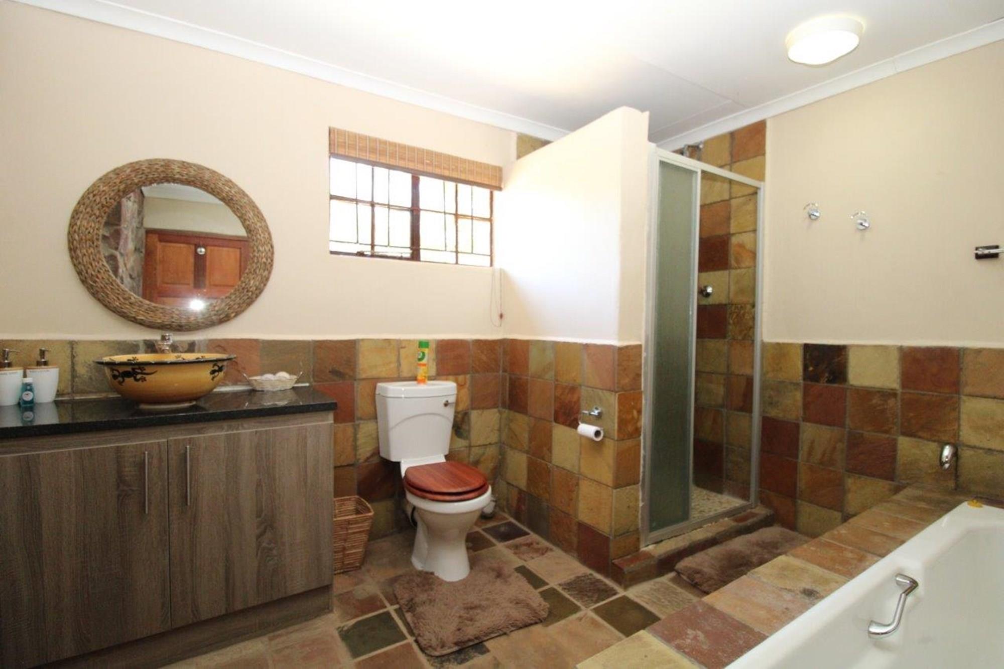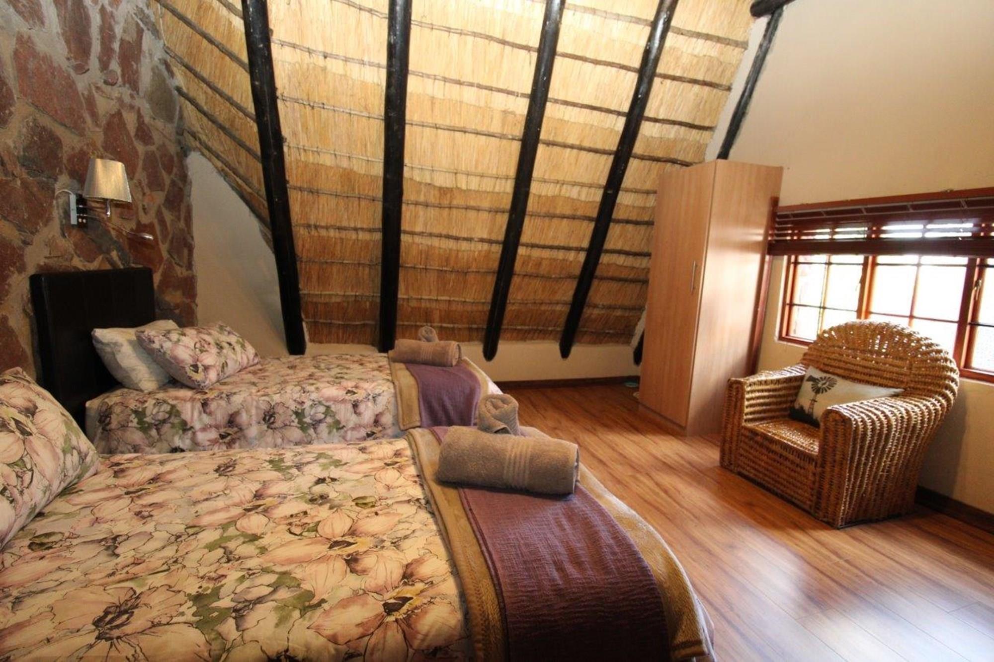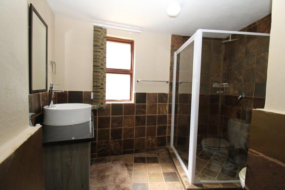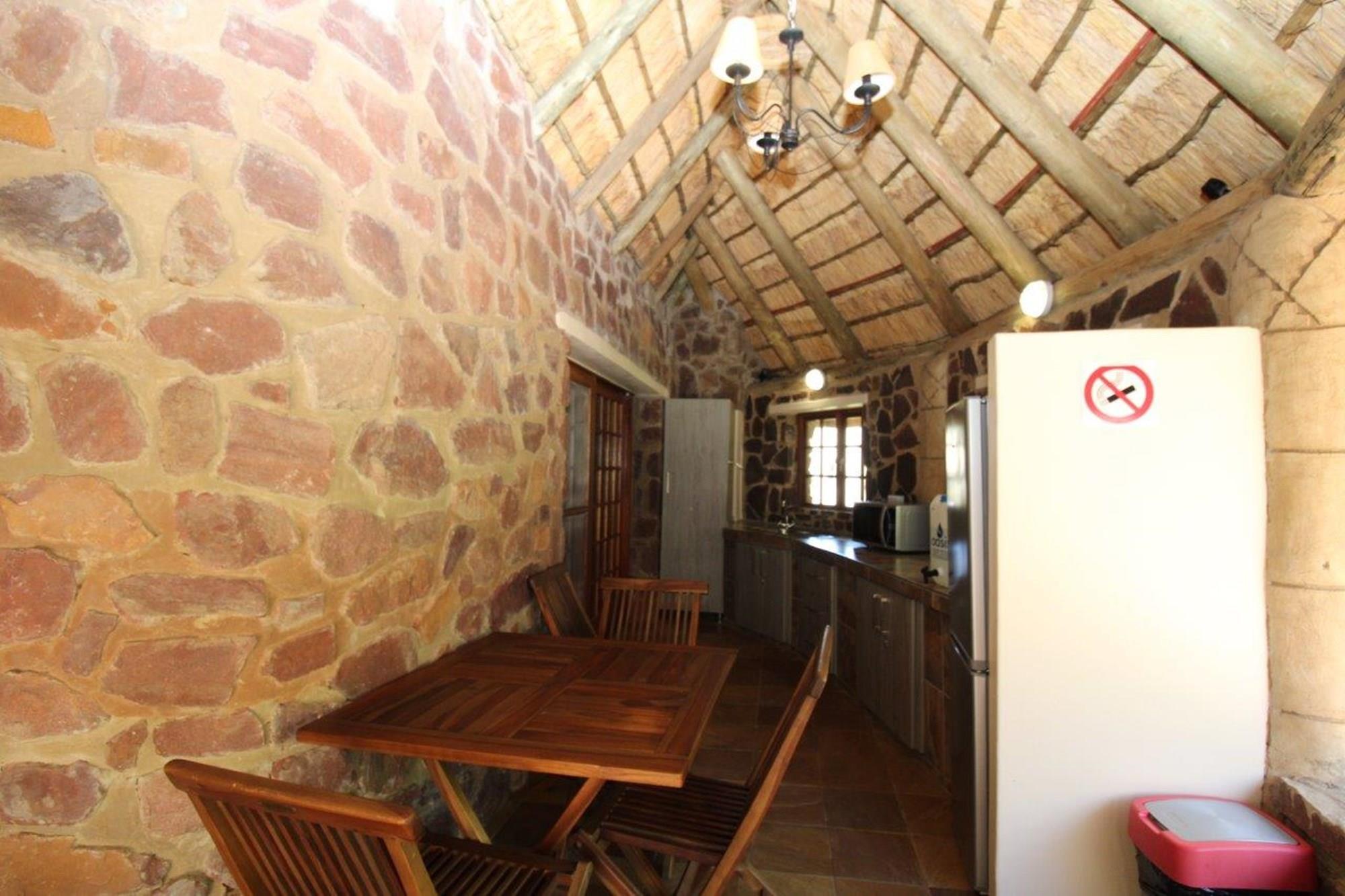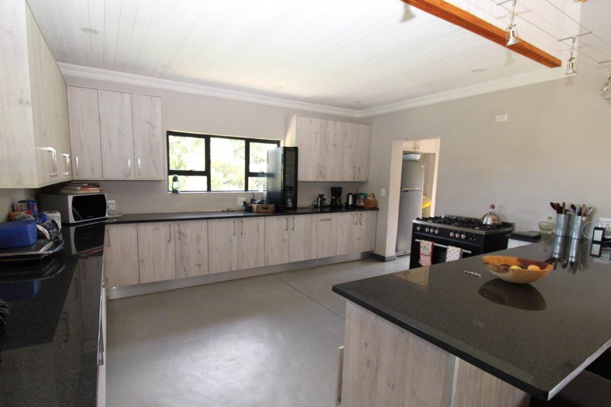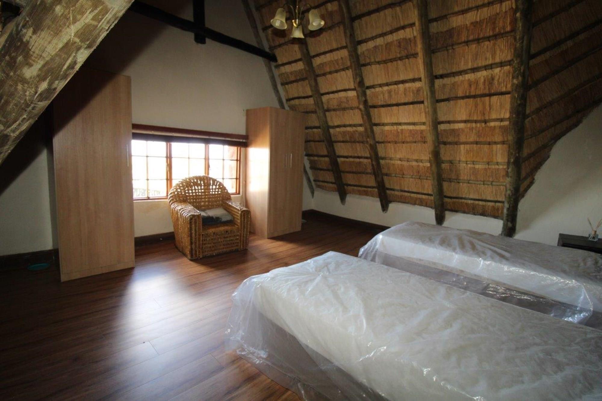 This property features a Main Lodge with four bedrooms and four bathrooms, as well as an open plan kitchen, dining room, and lounge which opens onto a large patio. There is also an additional loft lounge area, a conference facility for 20 people, a bar with a guest toilet, a swimming pool, a walk-in safe, and a well-manicured garden with automated irrigation. Very large boma braai area for functions and conferences overlooking the large earth dam. Excellent game viewing with giraffe, buffalo and other plains game drinking water at the dam. Guests may also utilise a private picnic and boma braai area situated on the mountain above the lodge with spectacular views. Internet installation included.