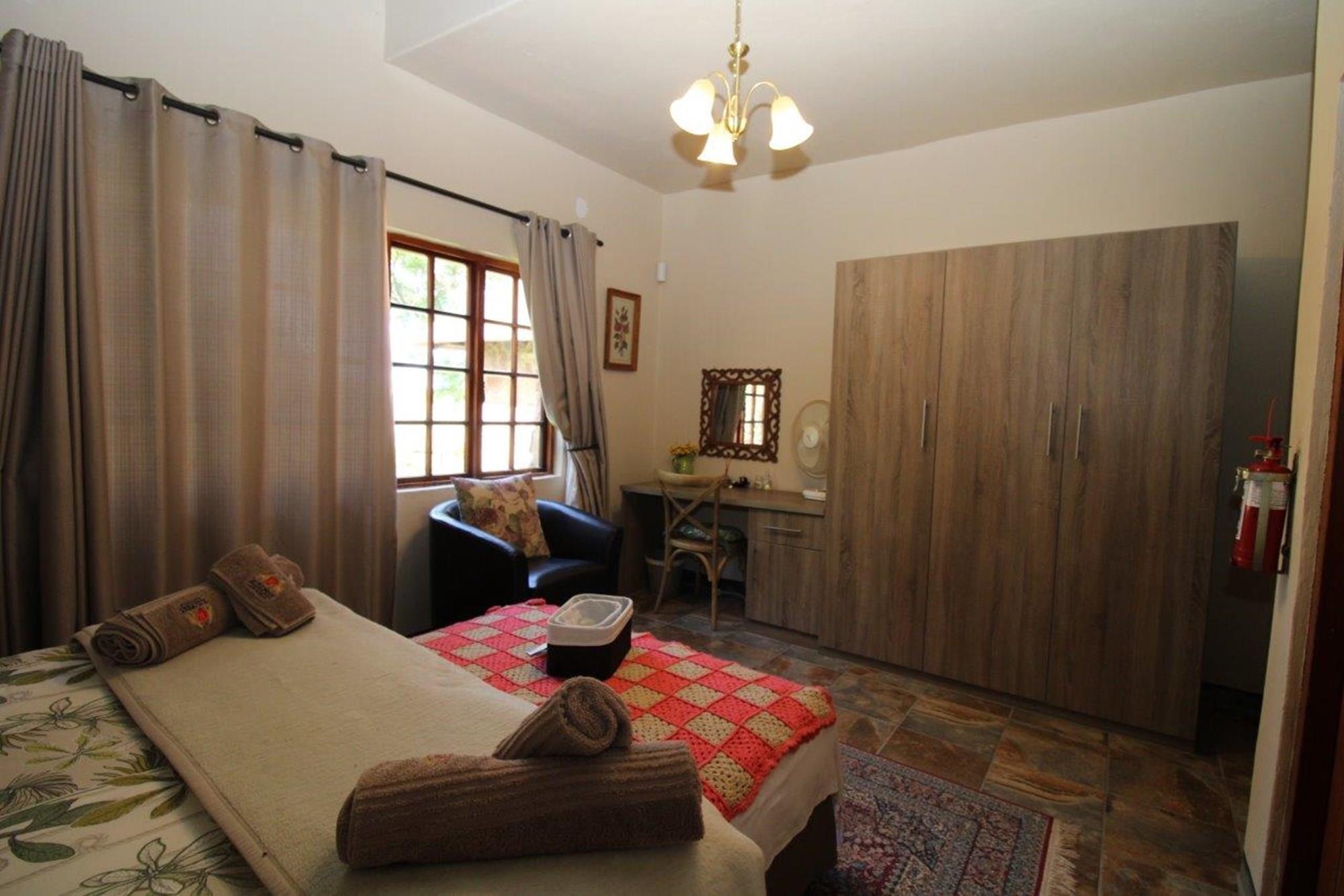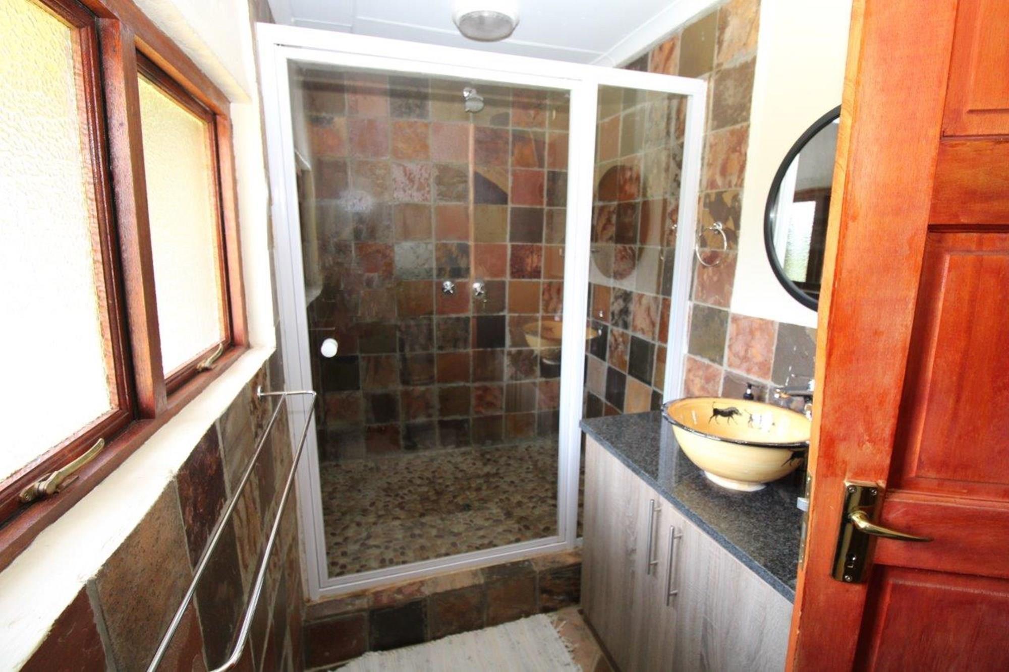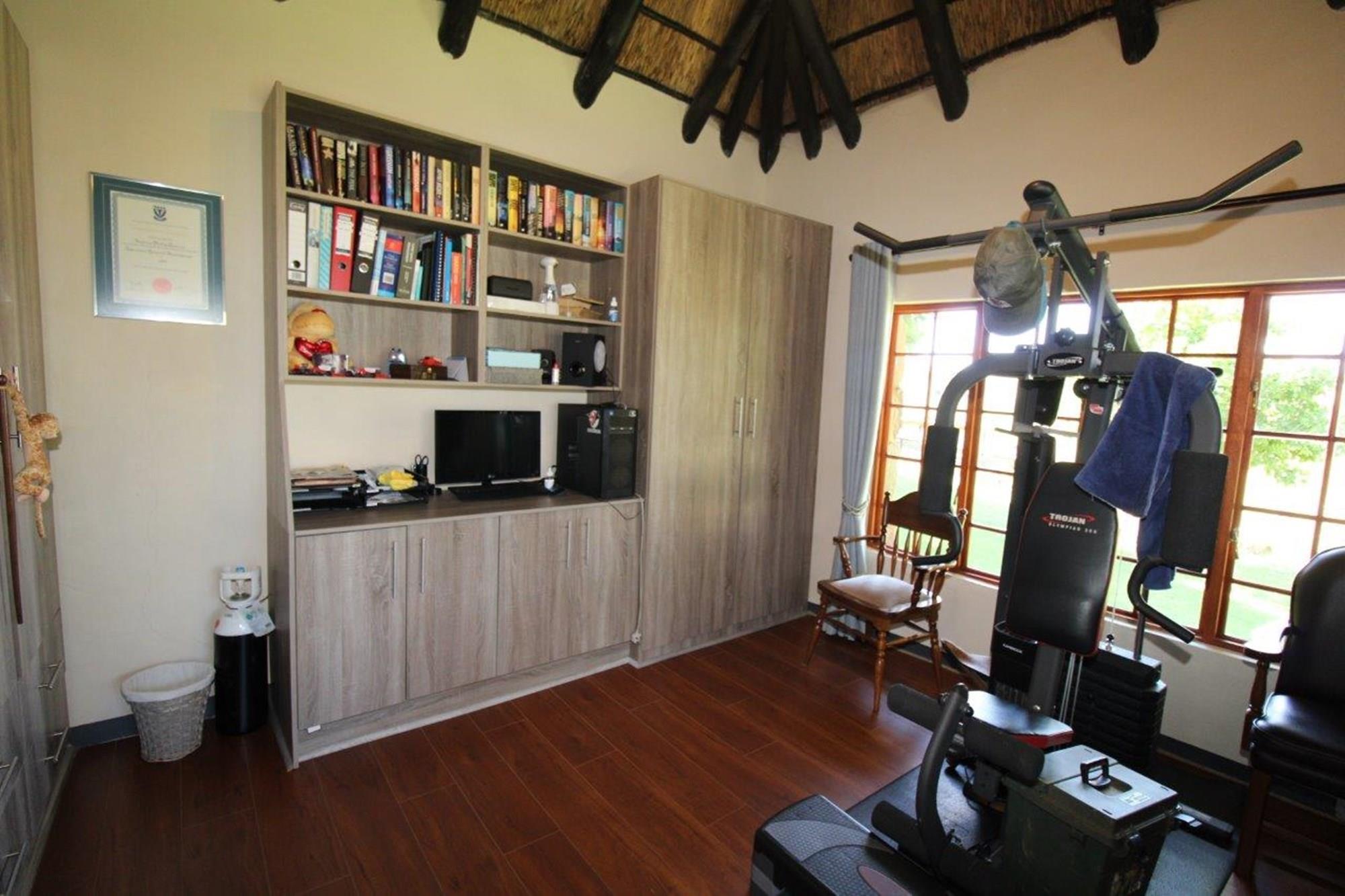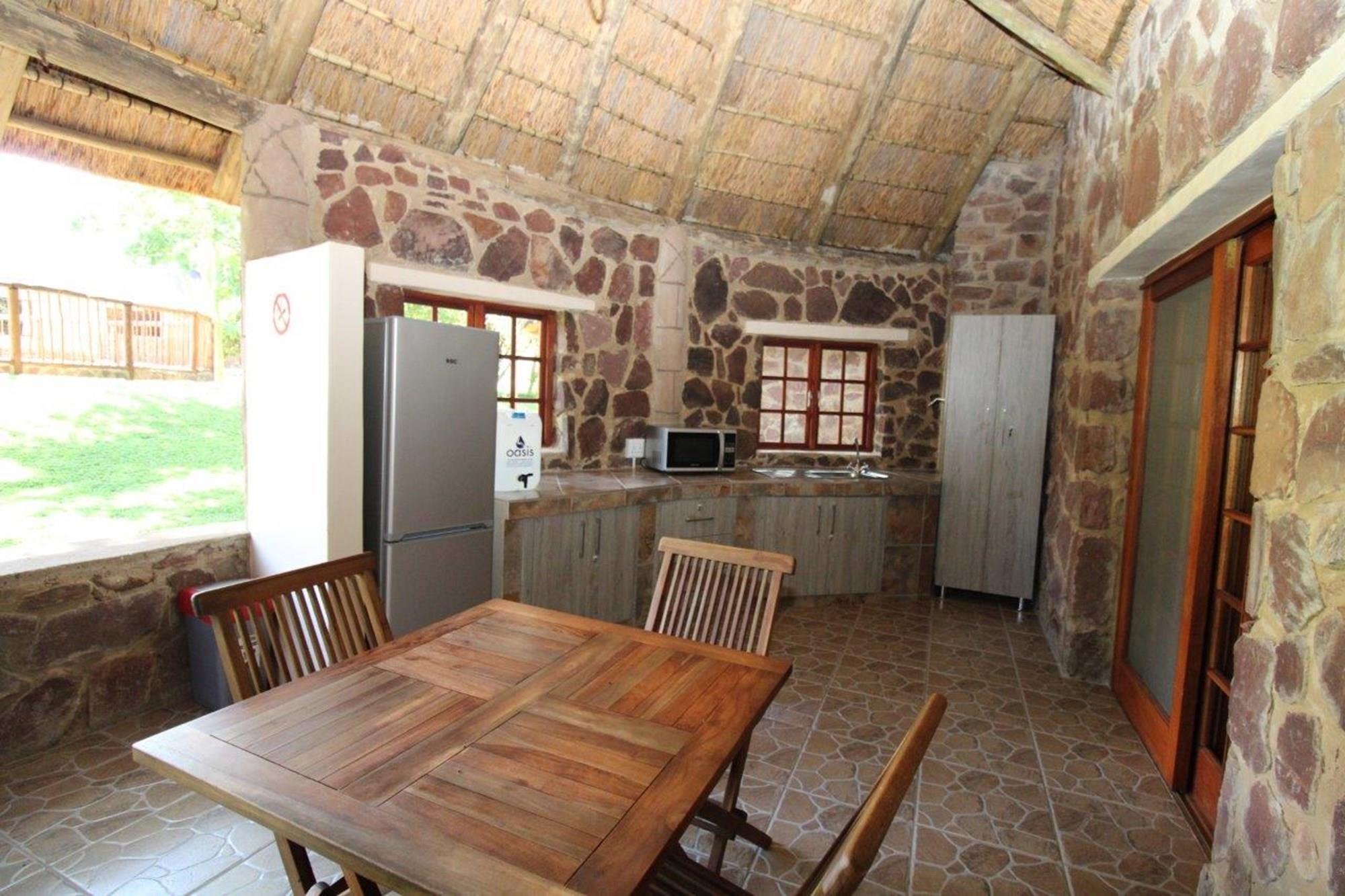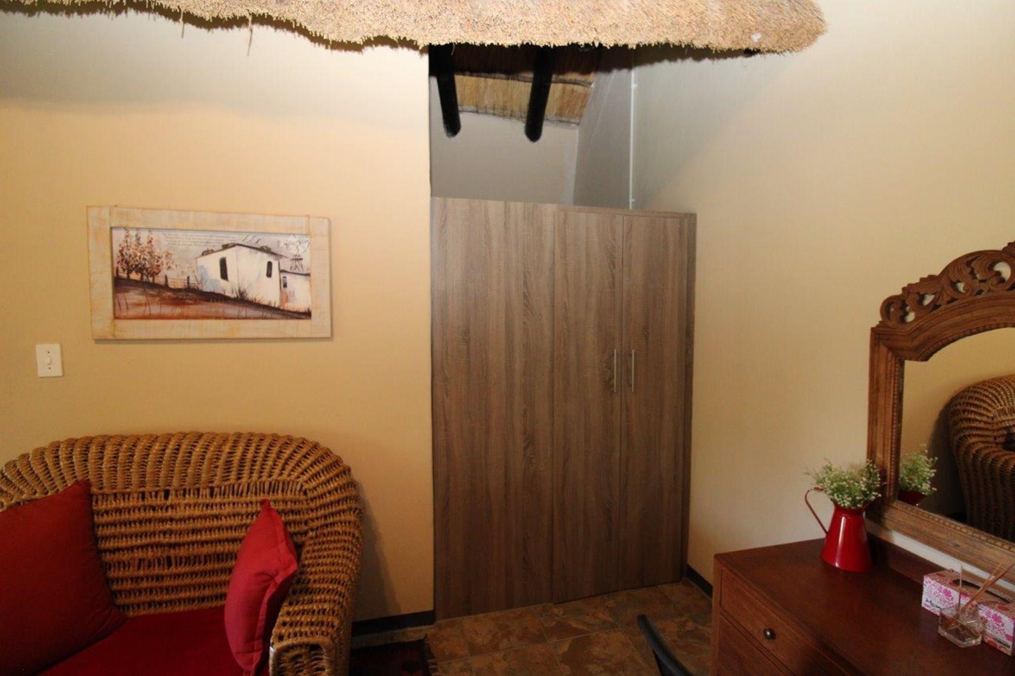 This property features a Main Lodge with four bedrooms and four bathrooms, as well as an open plan kitchen, dining room, and lounge which opens onto a large patio. There is also an additional loft lounge area, a conference facility for 20 people, a bar with a guest toilet, a swimming pool, a walk-in safe, and a well-manicured garden with automated irrigation. Very large boma braai area for functions and conferences overlooking the large earth dam. Excellent game viewing with giraffe, buffalo and other plains game drinking water at the dam. Guests may also utilise a private picnic and boma braai area situated on the mountain above the lodge with spectacular views. Internet installation included.