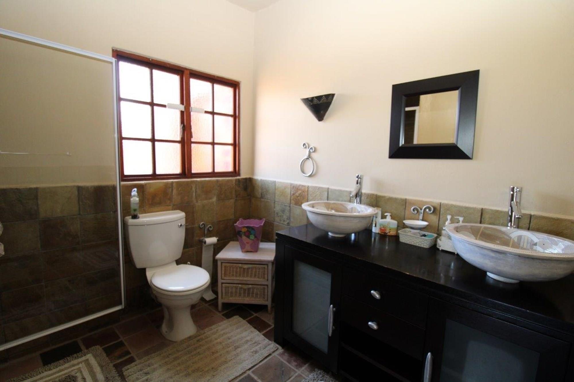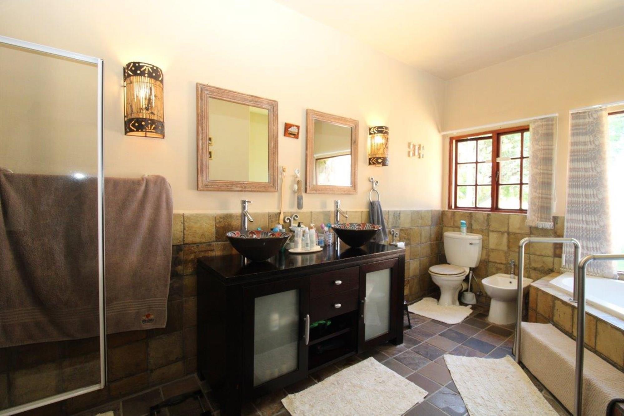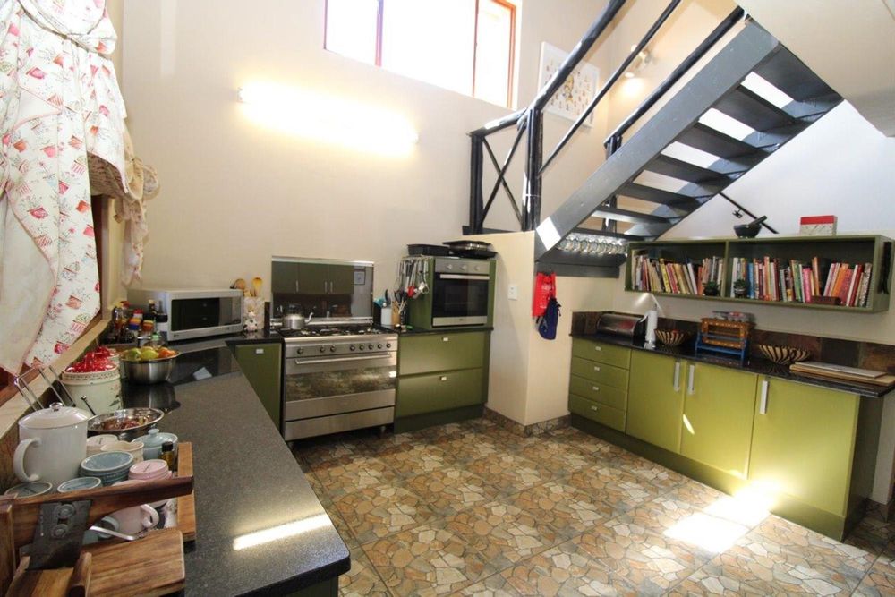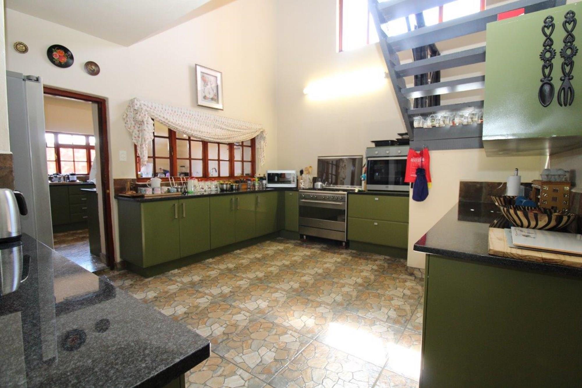 This Owner`s House is a dream come true! Situated on top of a mountain, it offers stunning 360 degree views of the savannah bushveld and remarkable game viewing. It features 8 bedrooms, 6 of which have en-suite bathrooms, three lounges, a dining room, and an open plan lounge that leads to a patio and heated infinity swimming pool. The well-equipped kitchen includes a scullery and pantry, and there is also a wine cellar. There are two built-in braais, five garages, a double carport, and a large private braai boma area. The garden is well-maintained with automated irrigation, and there is also staff accommodation with its own bathroom.