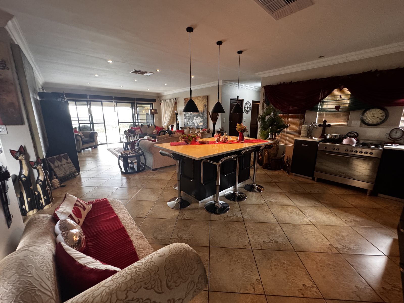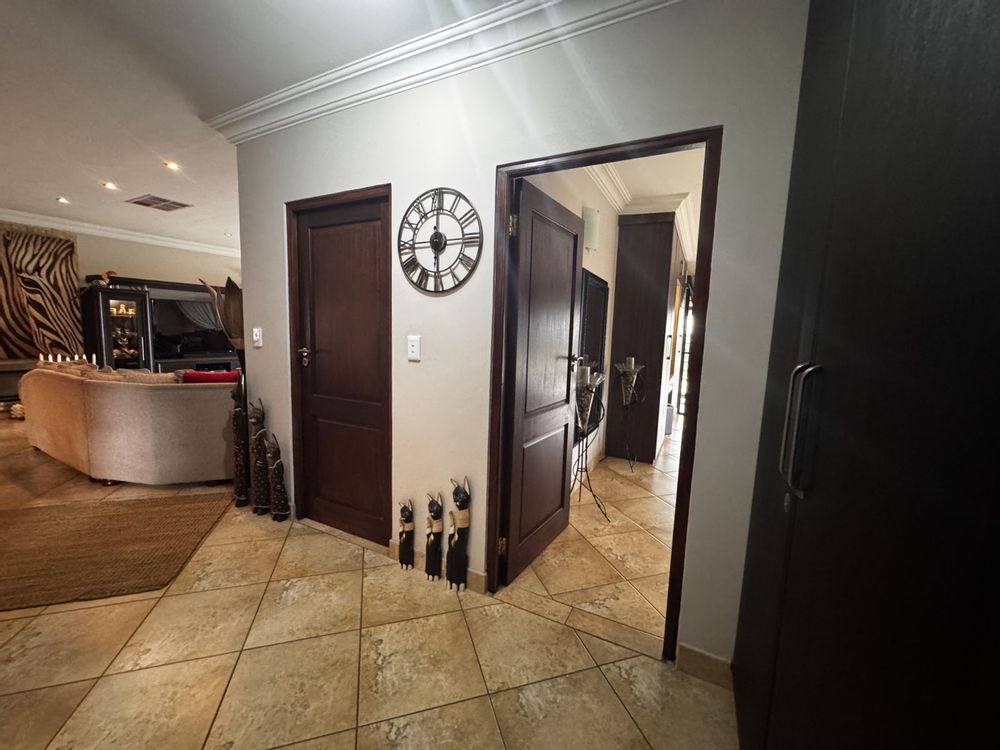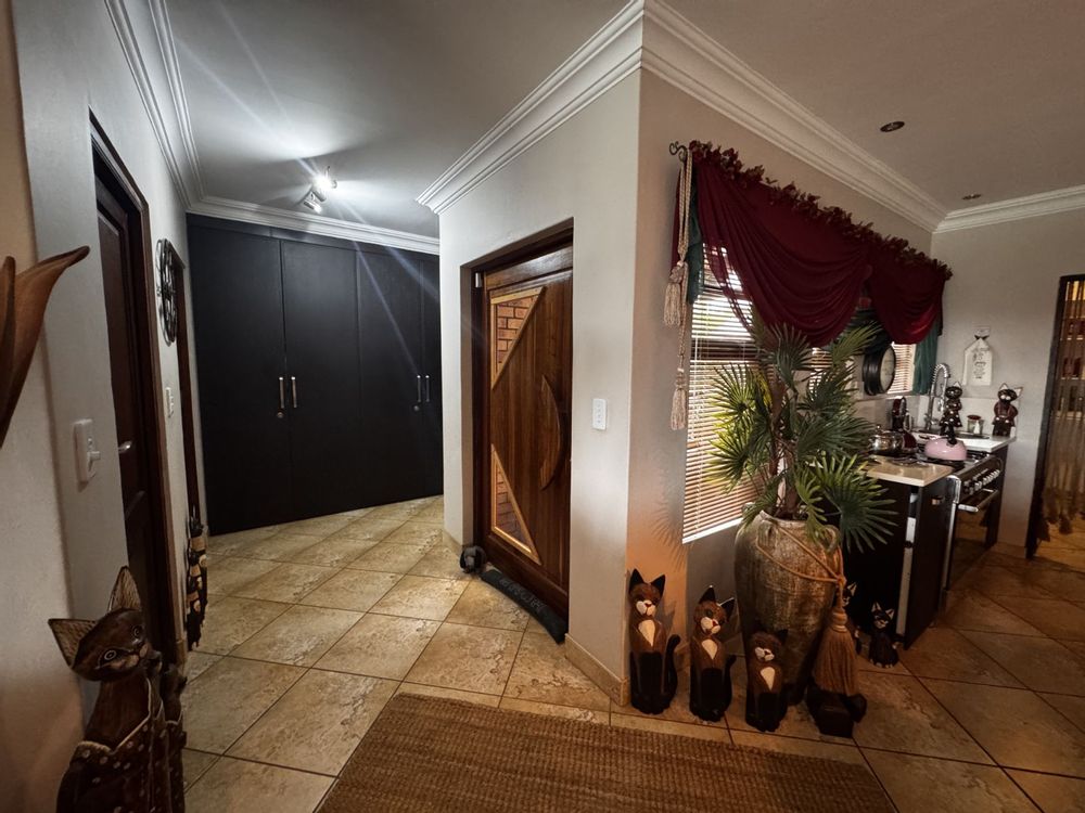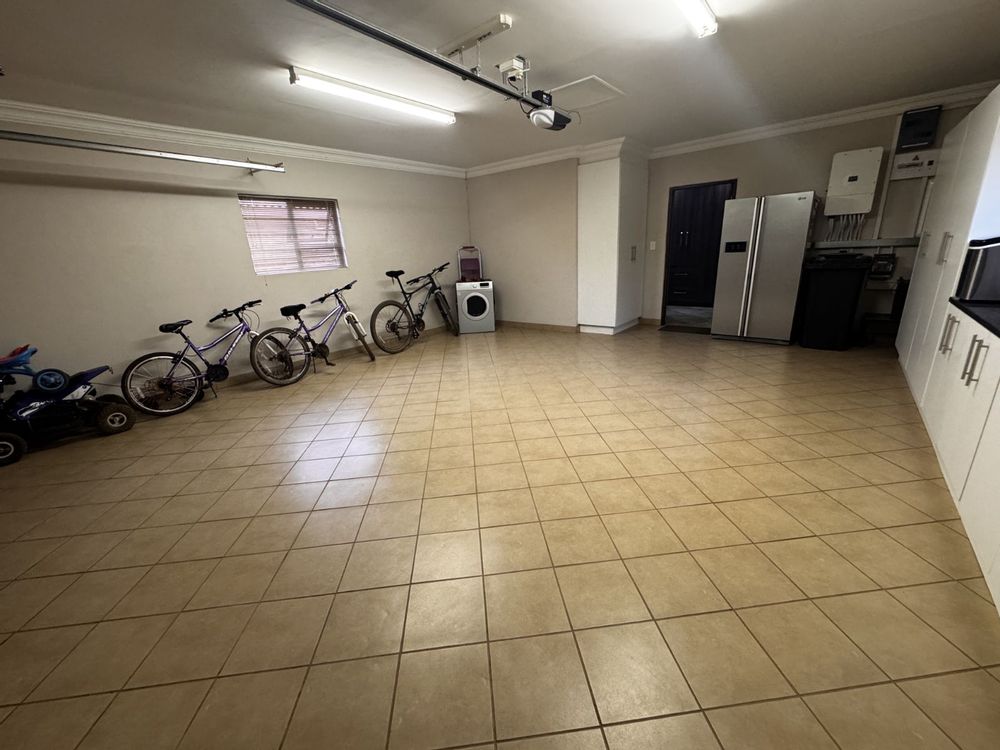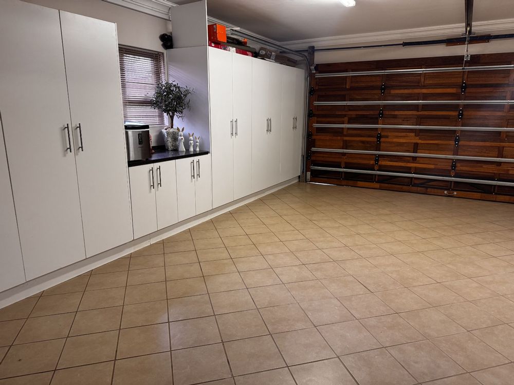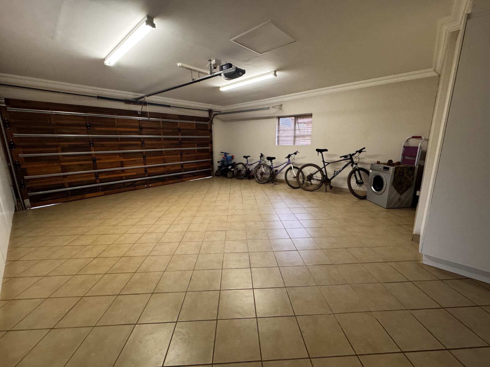 This beautiful home boasts a double carport with space for two vehicles, complemented by a solid structure supporting 12 solar panels. The home also features a double automated garage with built-in cupboard space, neatly tiled floors, and direct access to the house.