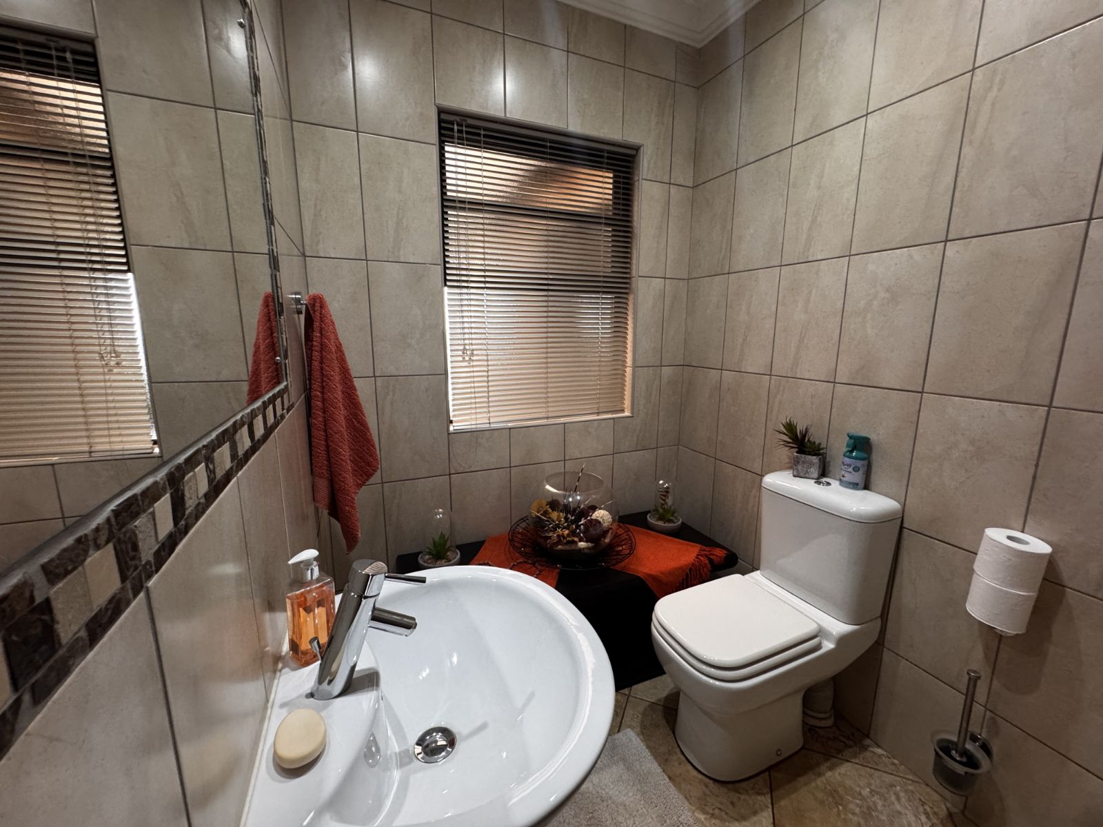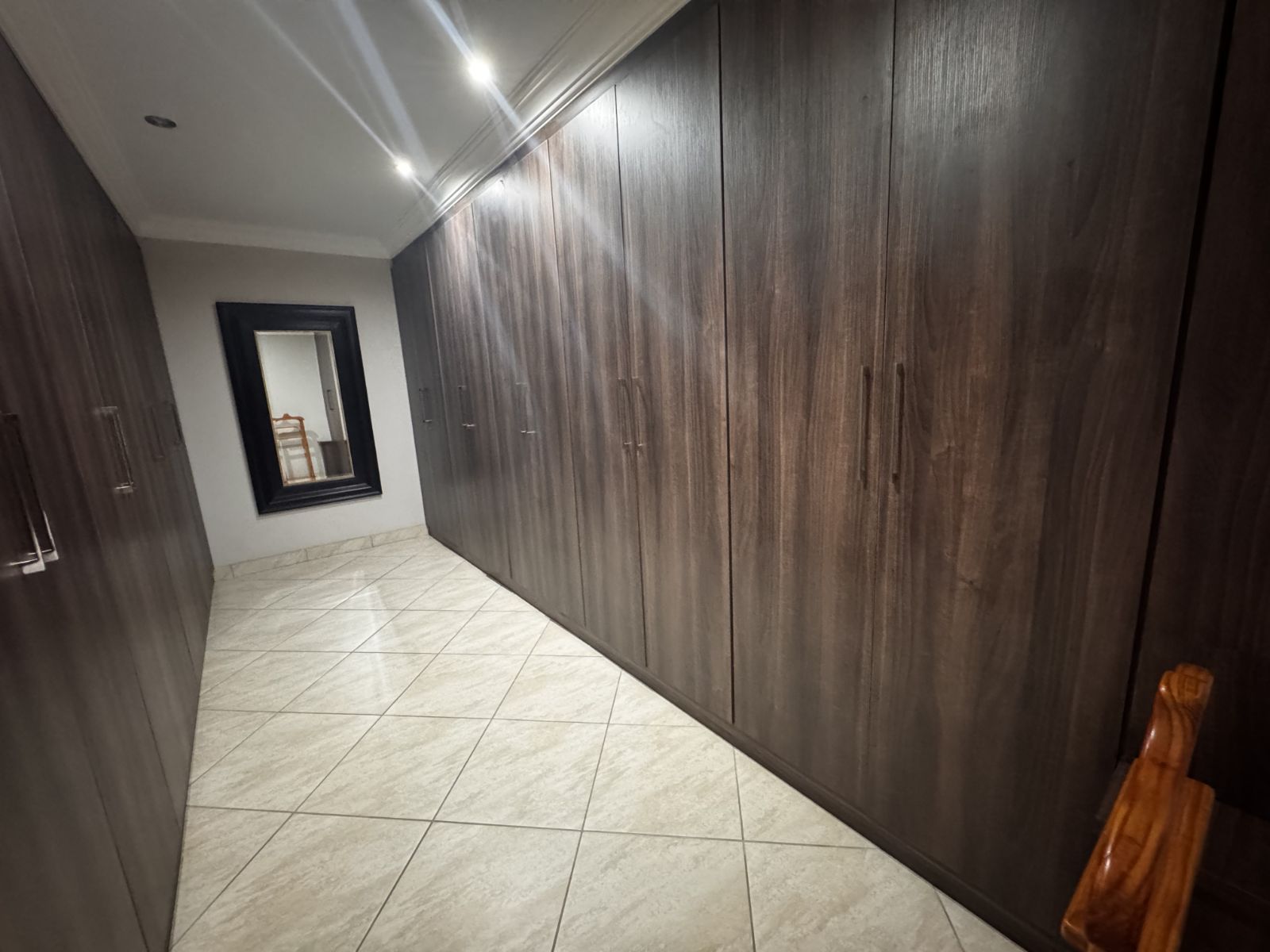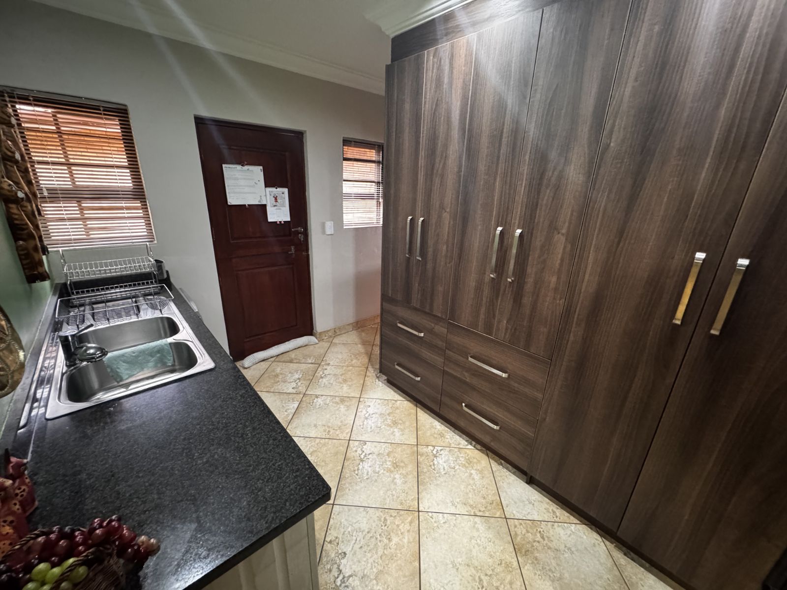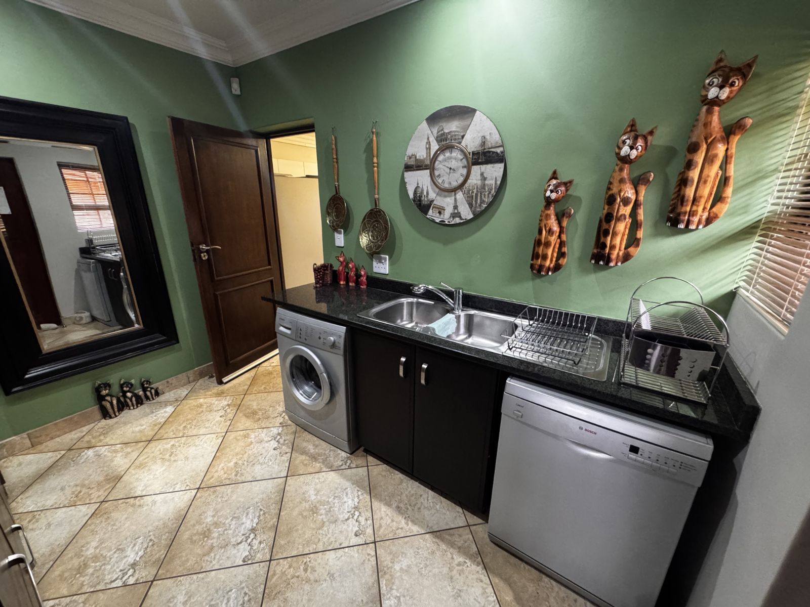 This beautiful home boasts a double carport with space for two vehicles, complemented by a solid structure supporting 12 solar panels. The home also features a double automated garage with built-in cupboard space, neatly tiled floors, and direct access to the house.