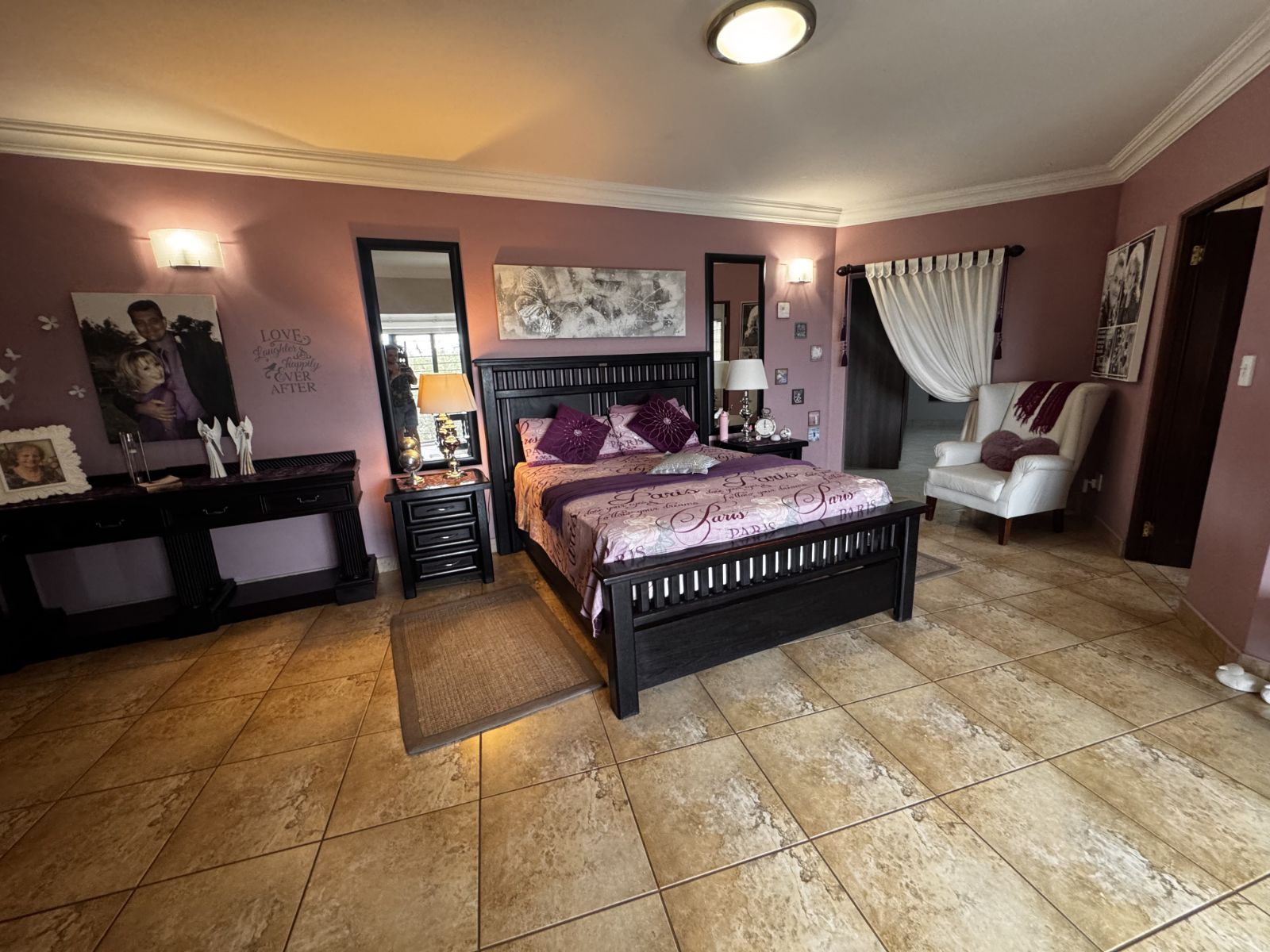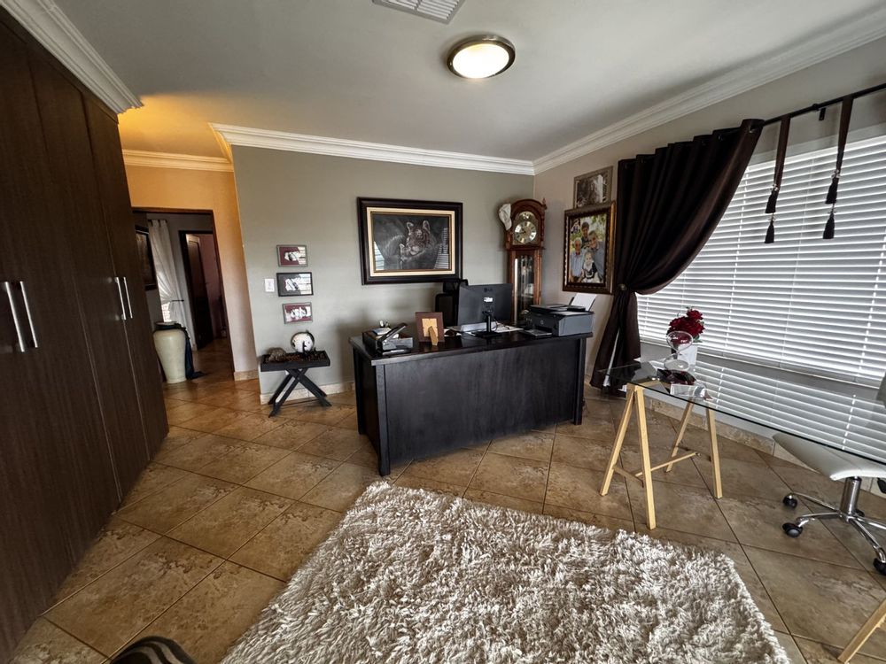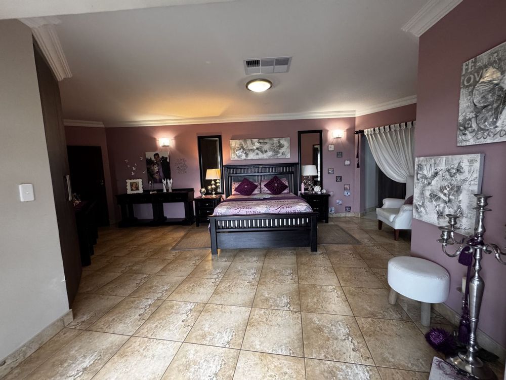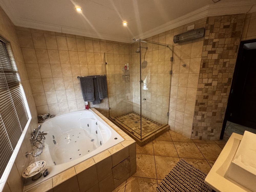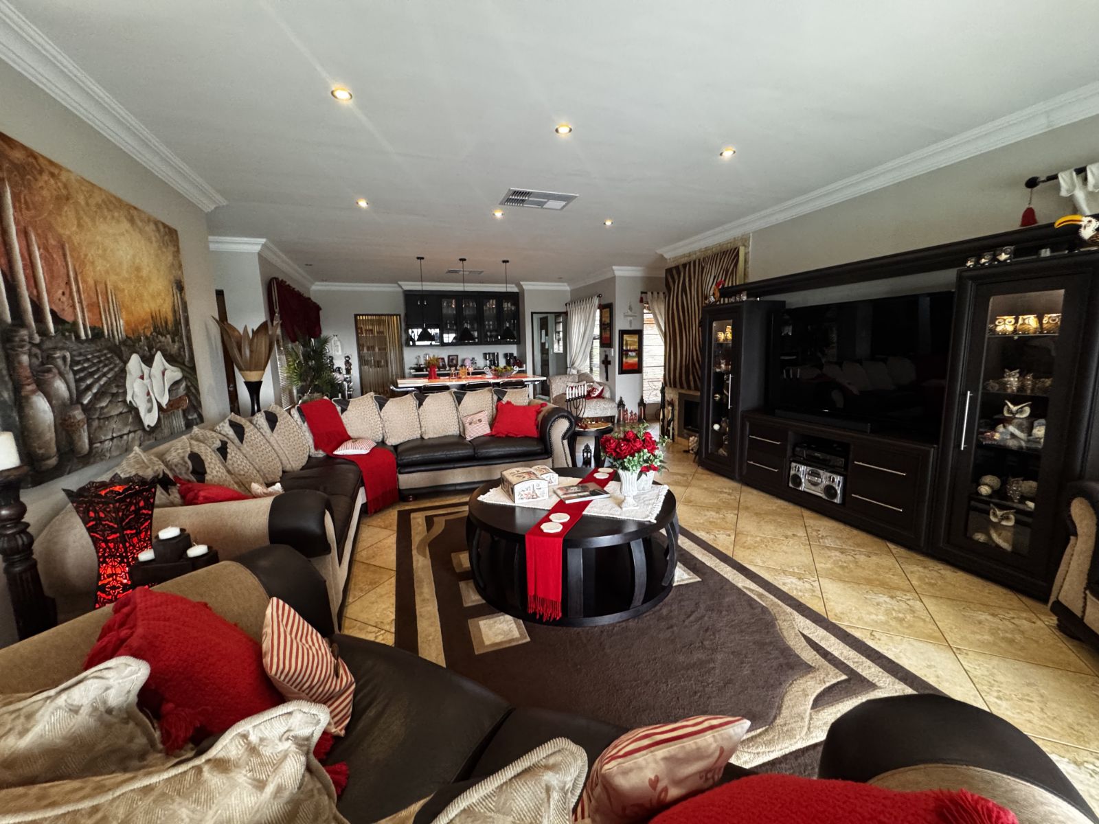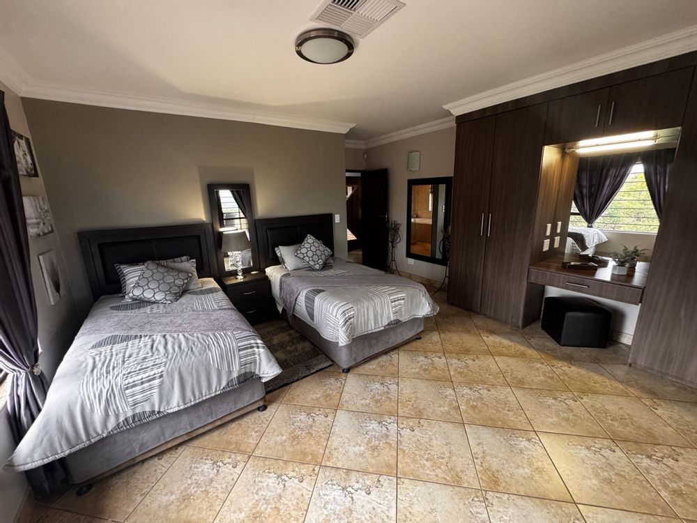 This beautiful home boasts a double carport with space for two vehicles, complemented by a solid structure supporting 12 solar panels. The home also features a double automated garage with built-in cupboard space, neatly tiled floors, and direct access to the house.