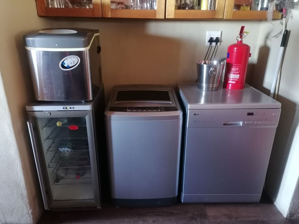 The heart of the home is an open-plan family room and dining area, flowing into a fully equipped gourmet kitchen with granite countertops and a high-end gas stove and oven. Enjoy self-sufficient living with gas geysers, a solar power system, and a backup generator for peace of mind.