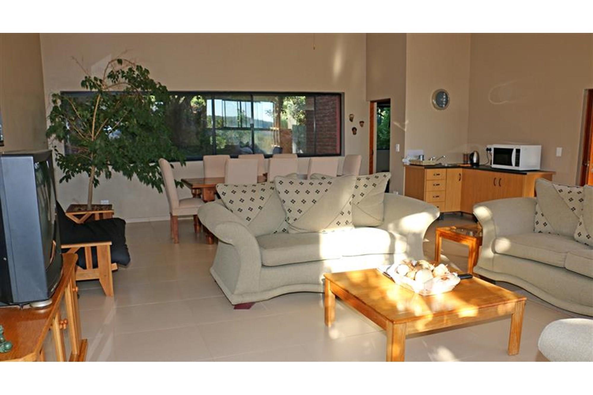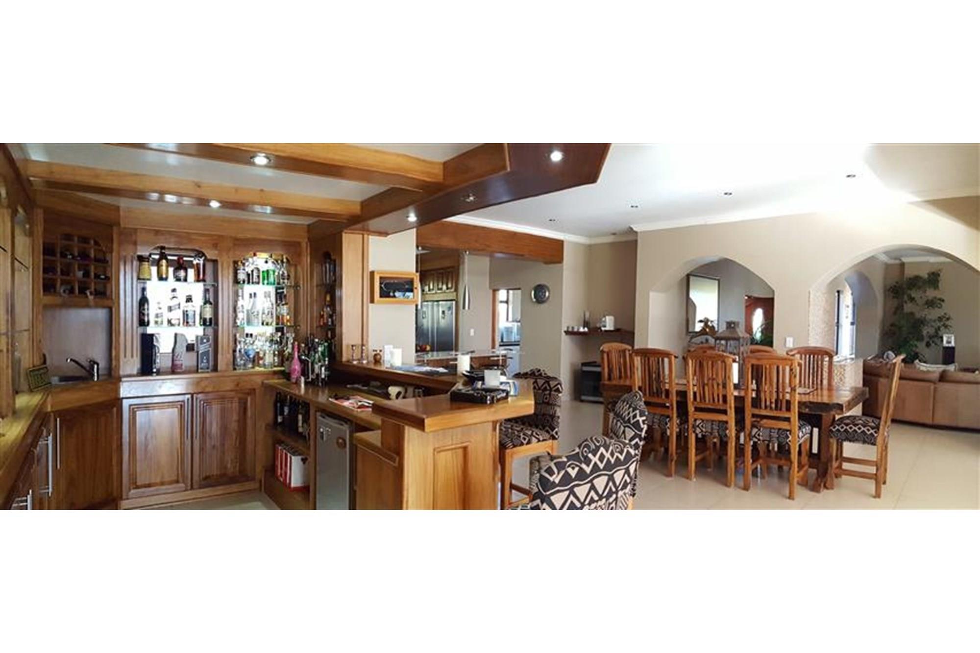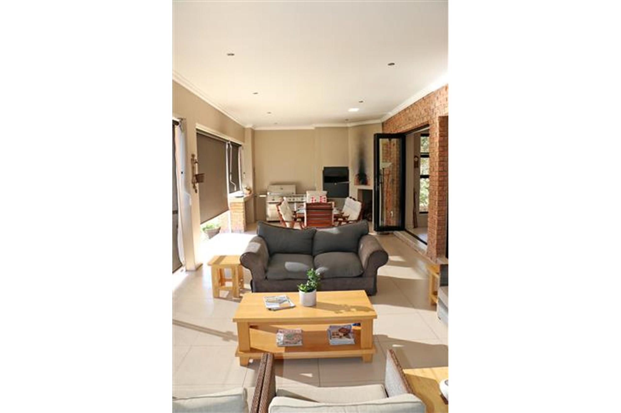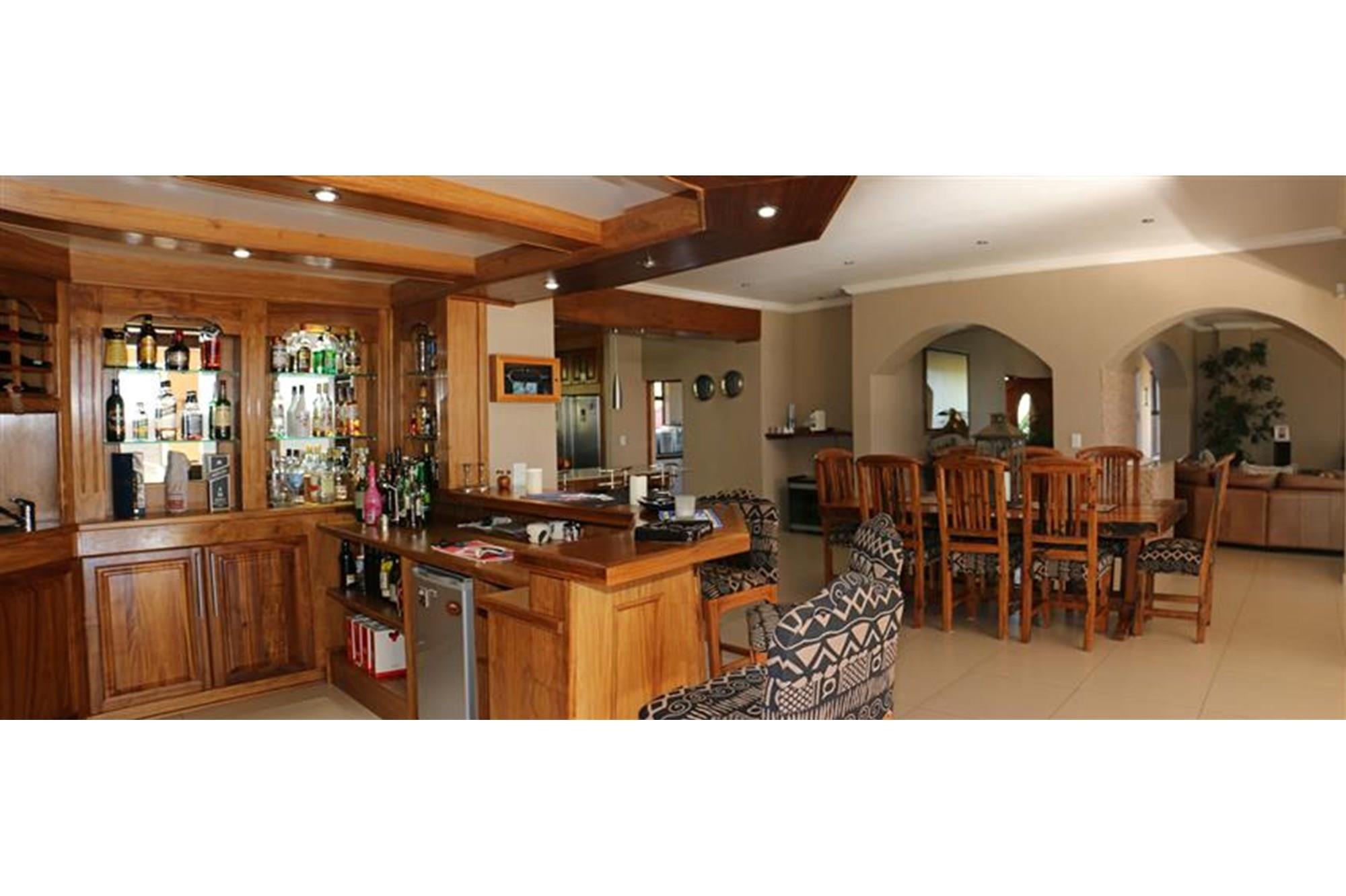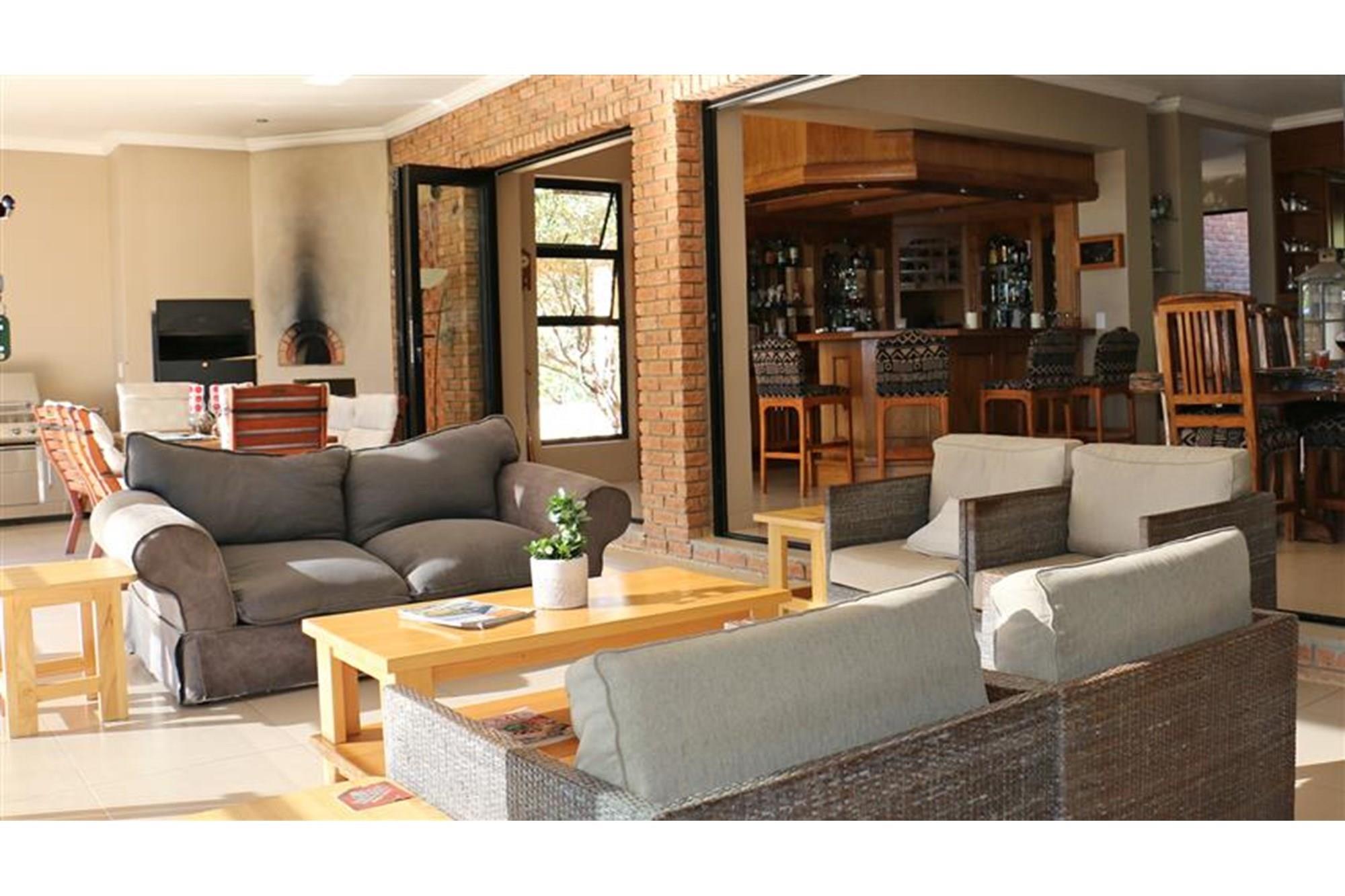 Main House:Step into an enormous open-plan lounge, dining room, solid kiaat bar, and a fully equipped kiaat kitchen. All these areas open through sliding and stacking doors onto a spacious patio, complete with a built-in braai, pizza oven, and a sparkling pool.