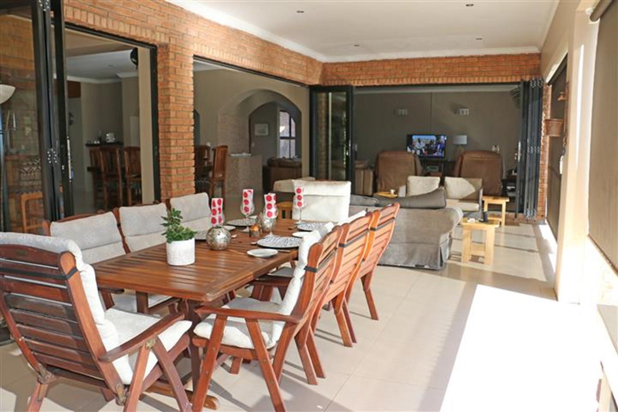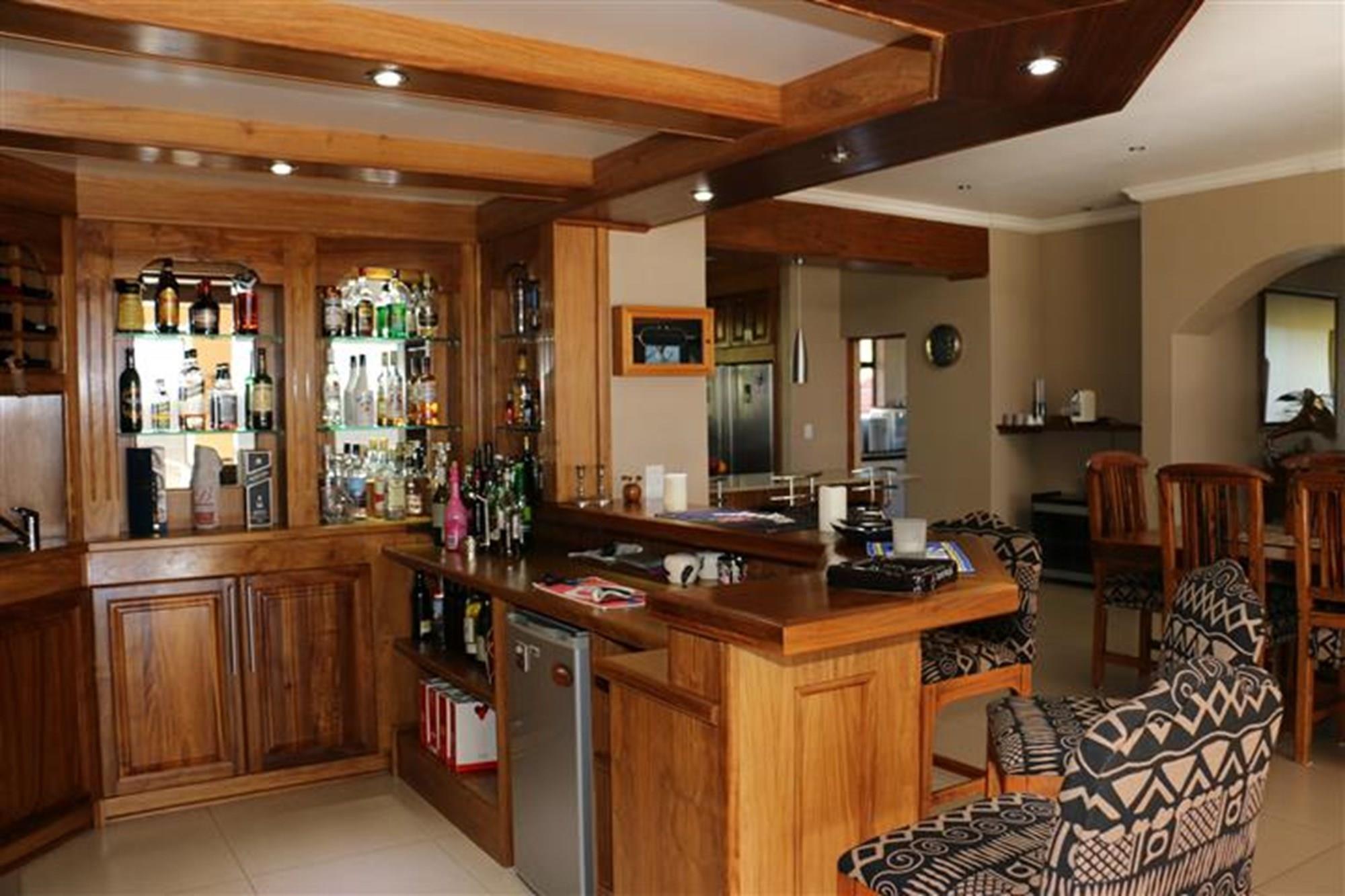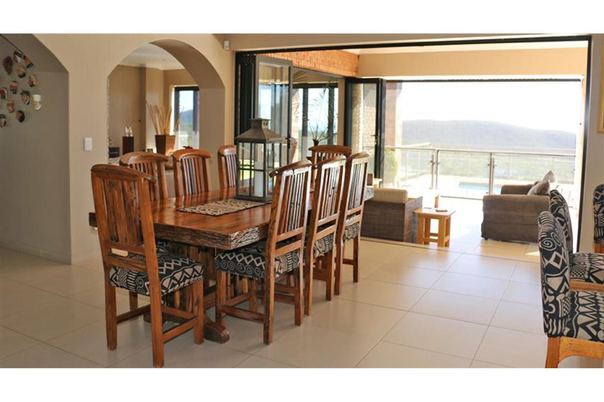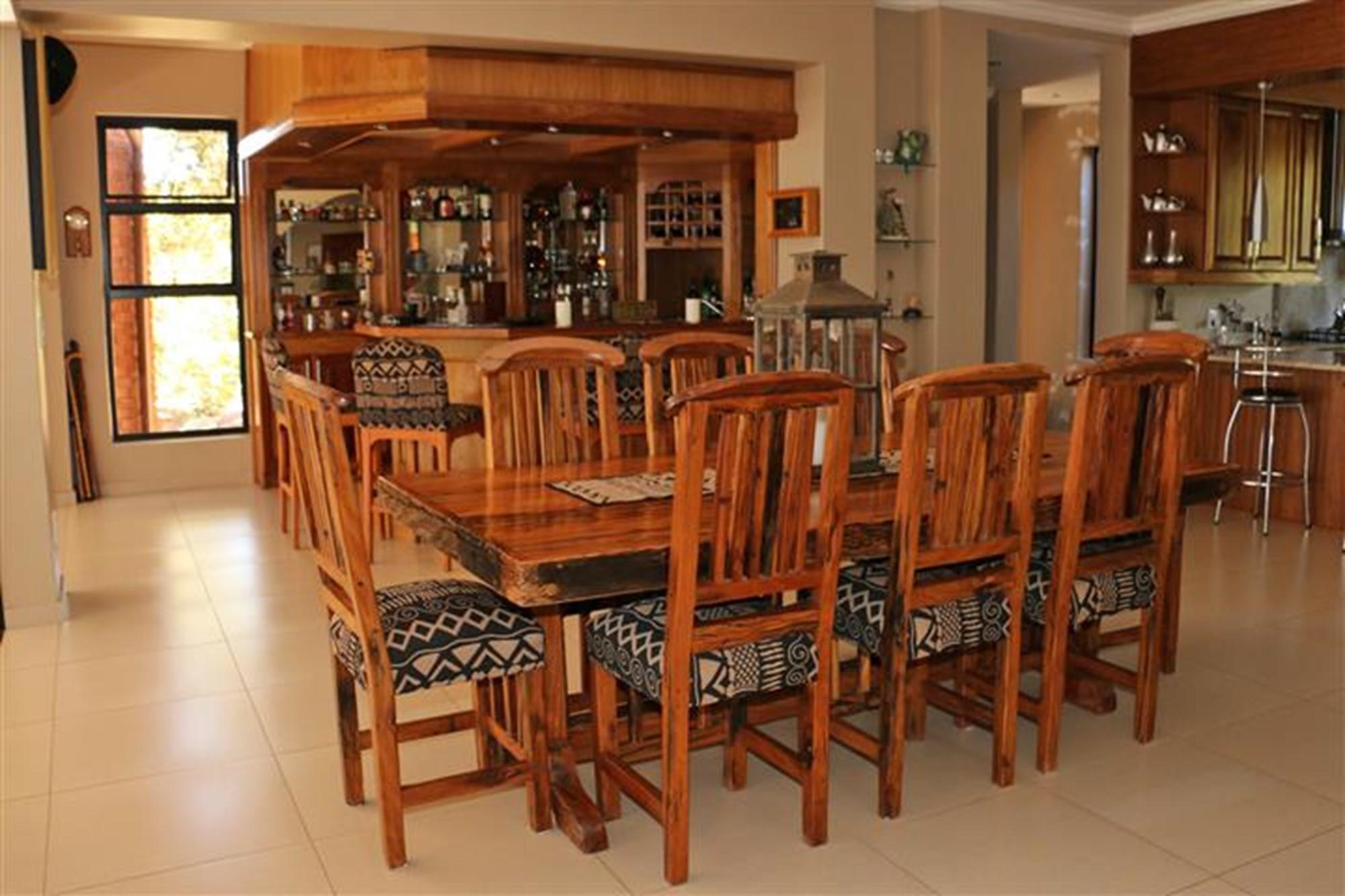 Main House:Step into an enormous open-plan lounge, dining room, solid kiaat bar, and a fully equipped kiaat kitchen. All these areas open through sliding and stacking doors onto a spacious patio, complete with a built-in braai, pizza oven, and a sparkling pool.