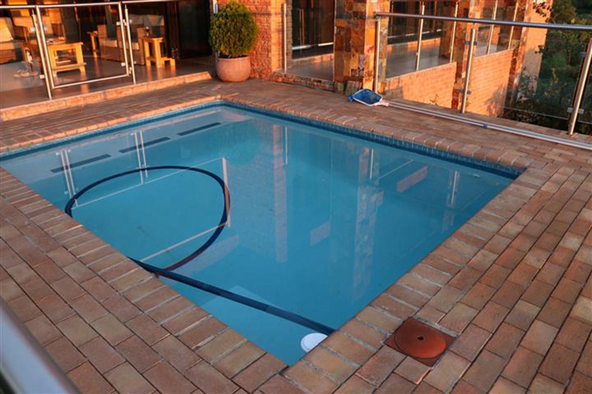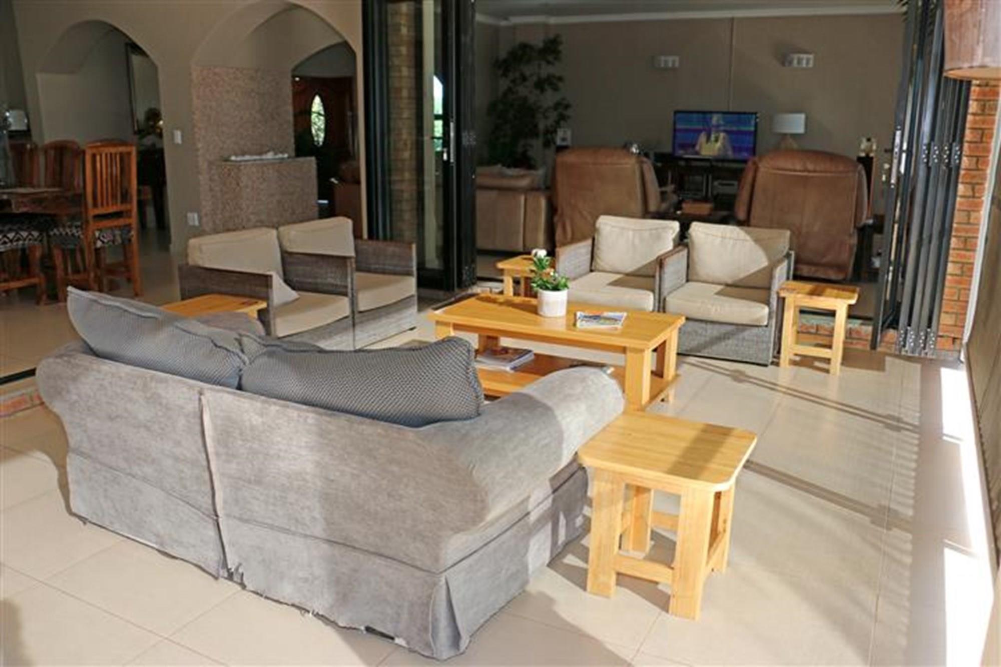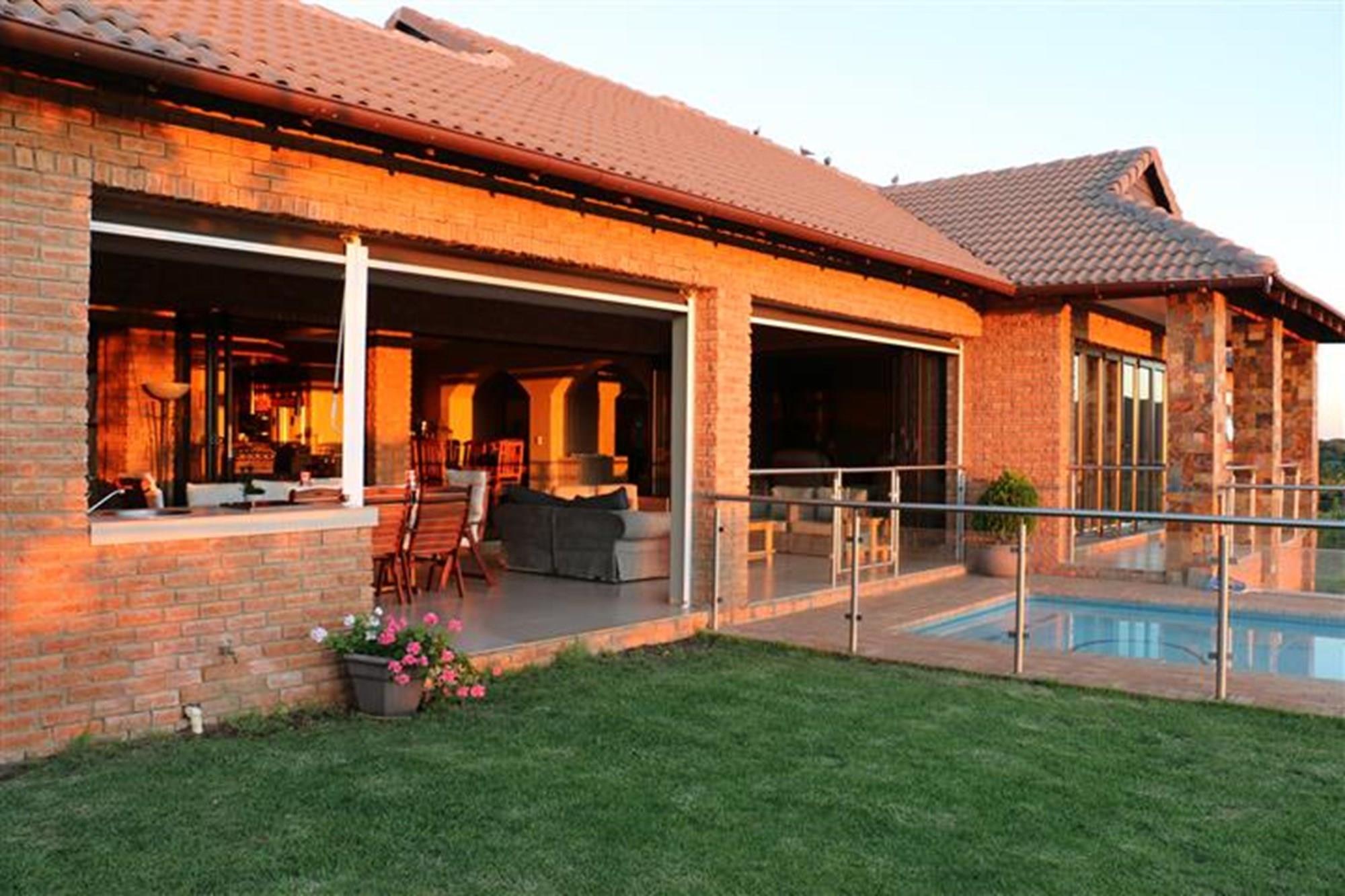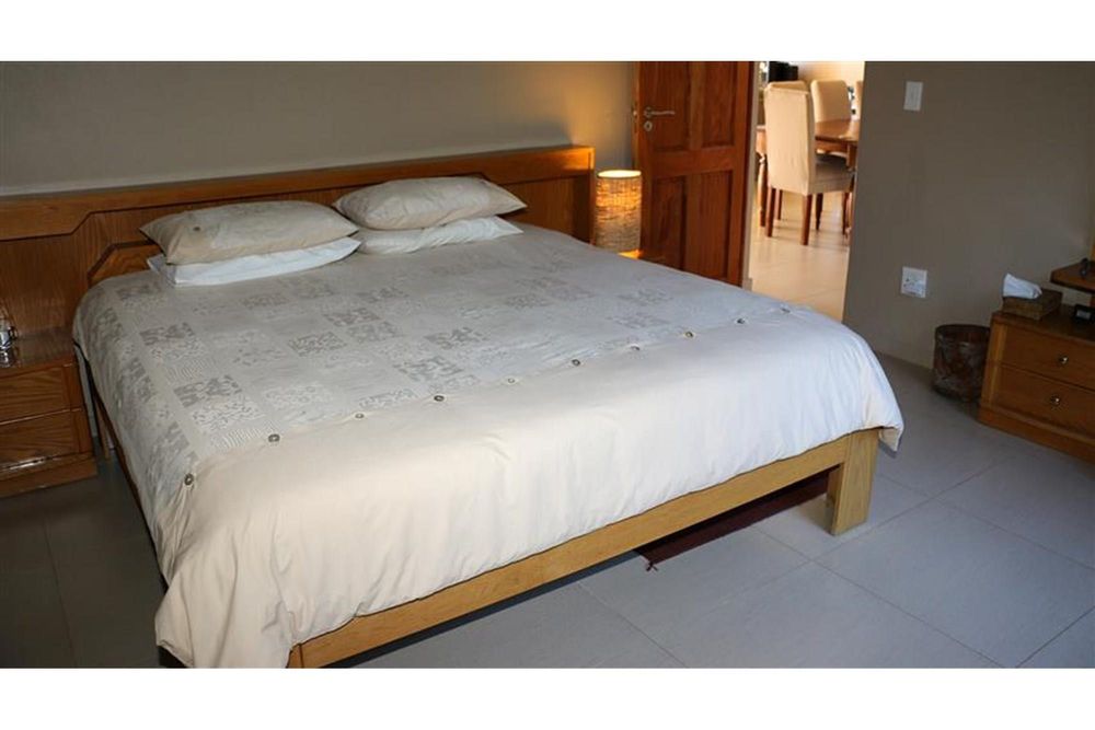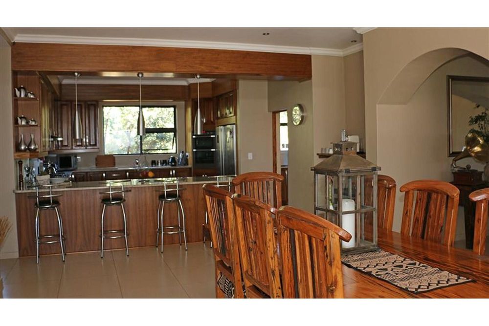 Main House:Step into an enormous open-plan lounge, dining room, solid kiaat bar, and a fully equipped kiaat kitchen. All these areas open through sliding and stacking doors onto a spacious patio, complete with a built-in braai, pizza oven, and a sparkling pool.