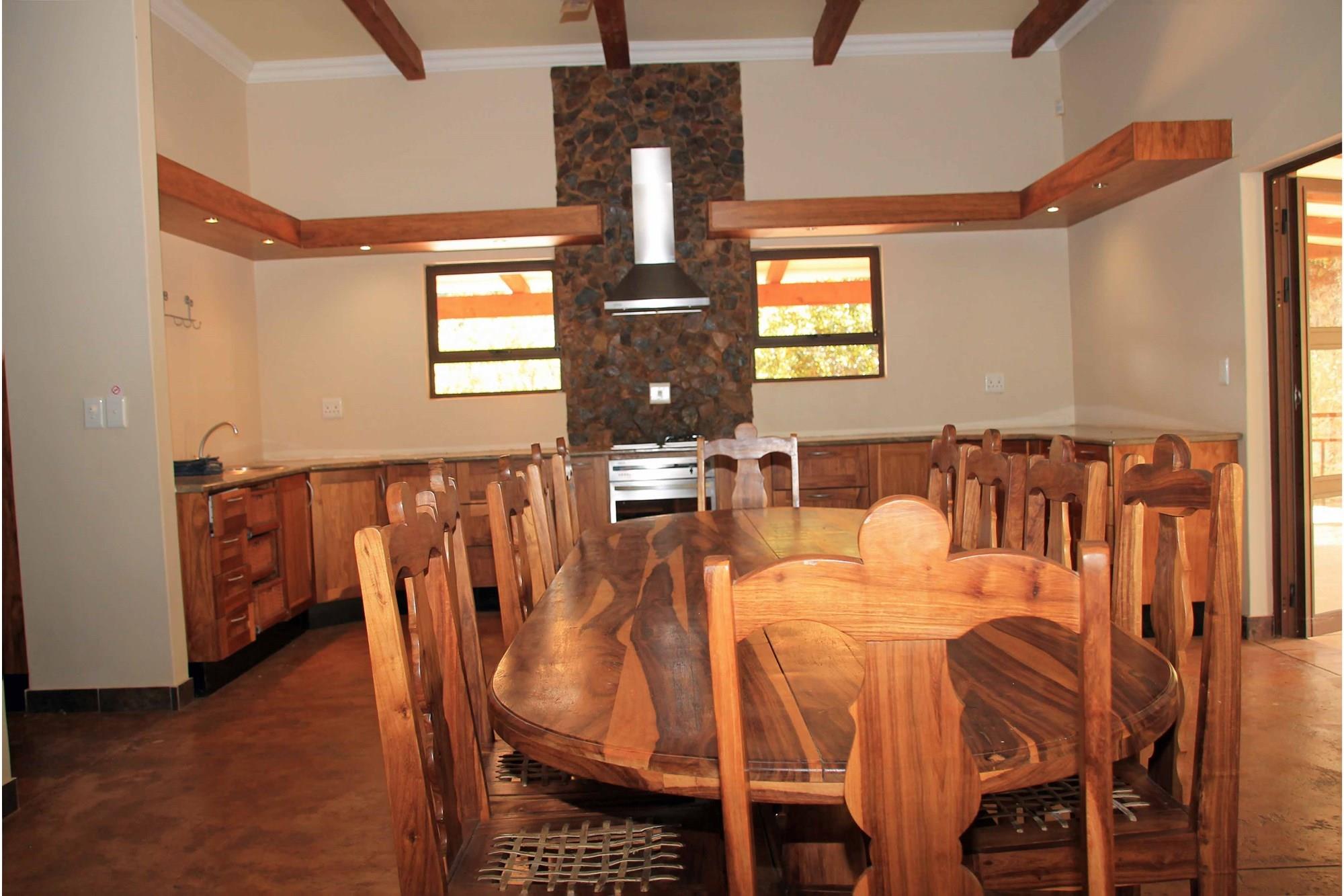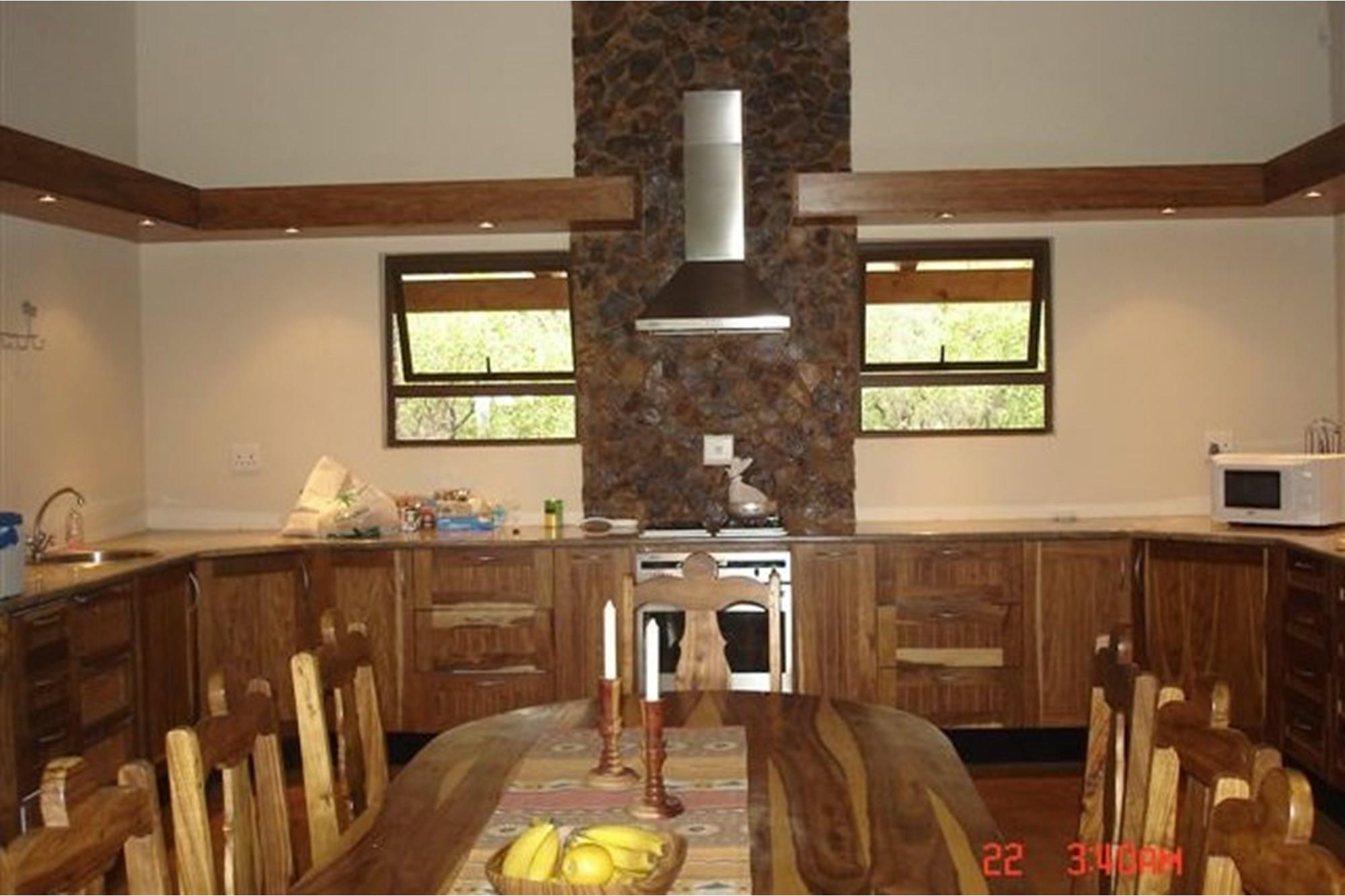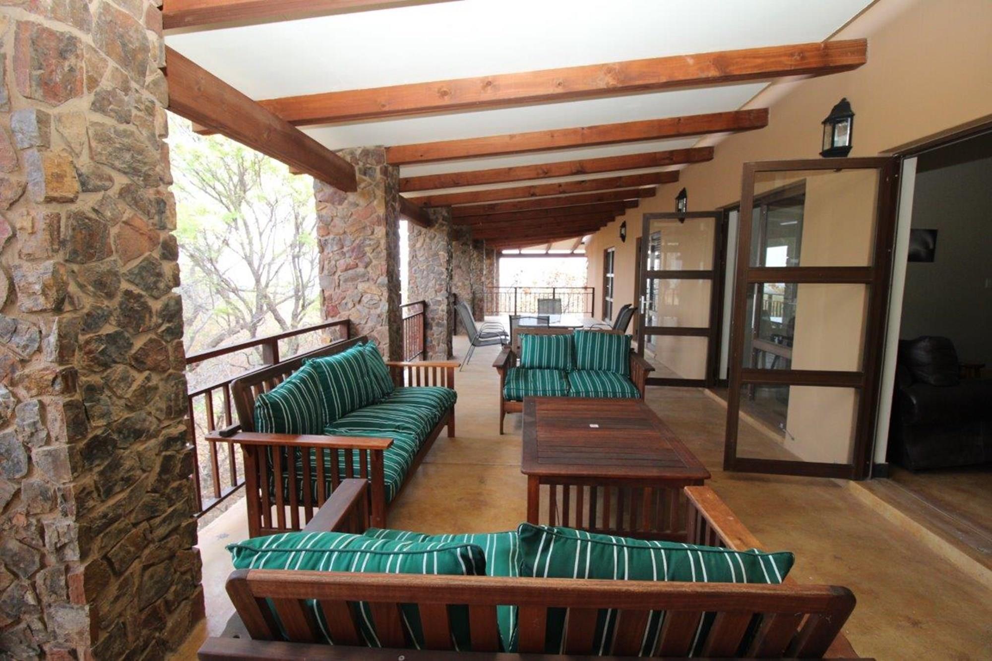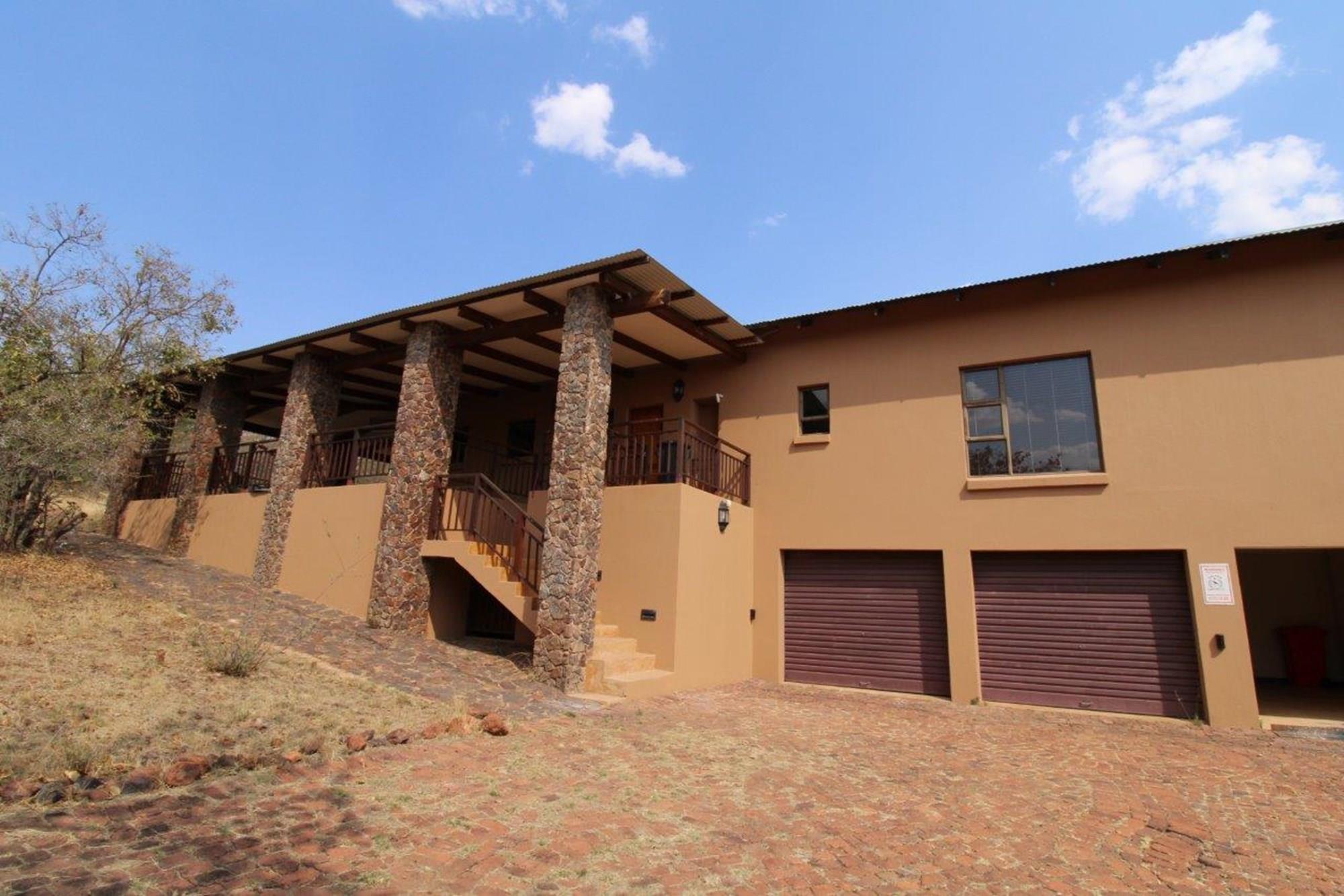 Thaba Moriri, near Bela Bela, South Africa - Double story 5 bedroom house in private game reserve with breathtaking views. 3 Bedrooms (two en-suite) in main house with lounge, dining room, kitchen, scullery and large pantry. Large patio flanking 3 sides of the house. Separate flat on the ground floor with kitchen, lounge/dining area, and two bedrooms. Boma Braai area with pool room and bar and multiple store rooms. Triple garage (two with roll down doors). Space in patio deck for sunken jacuzzi. The kitchen is equipped with a combination gas and electric stove. The passage to the laundry area has large space for two fridge/freezers. A beautiful fireplace in the lounge/open plan area creates a cozy and romantic atmosphere. The boma braai area is complemented with a built-in braai on the patio for the rainy days. The house has spectacular views of the foothills of the Waterberg.
