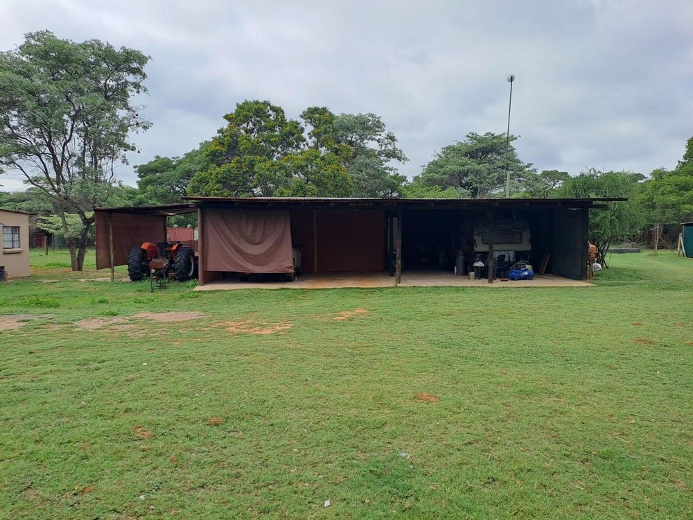 The property is well equipped with a four-vehicle carport and an extended roof section suitable for a tractor. Various outbuildings offer additional storage and workspace. There are goat kraals and covered structures, making the property suitable for small-scale livestock. The land is fully game fenced, and water is supplied by two boreholes and water reservoirs.