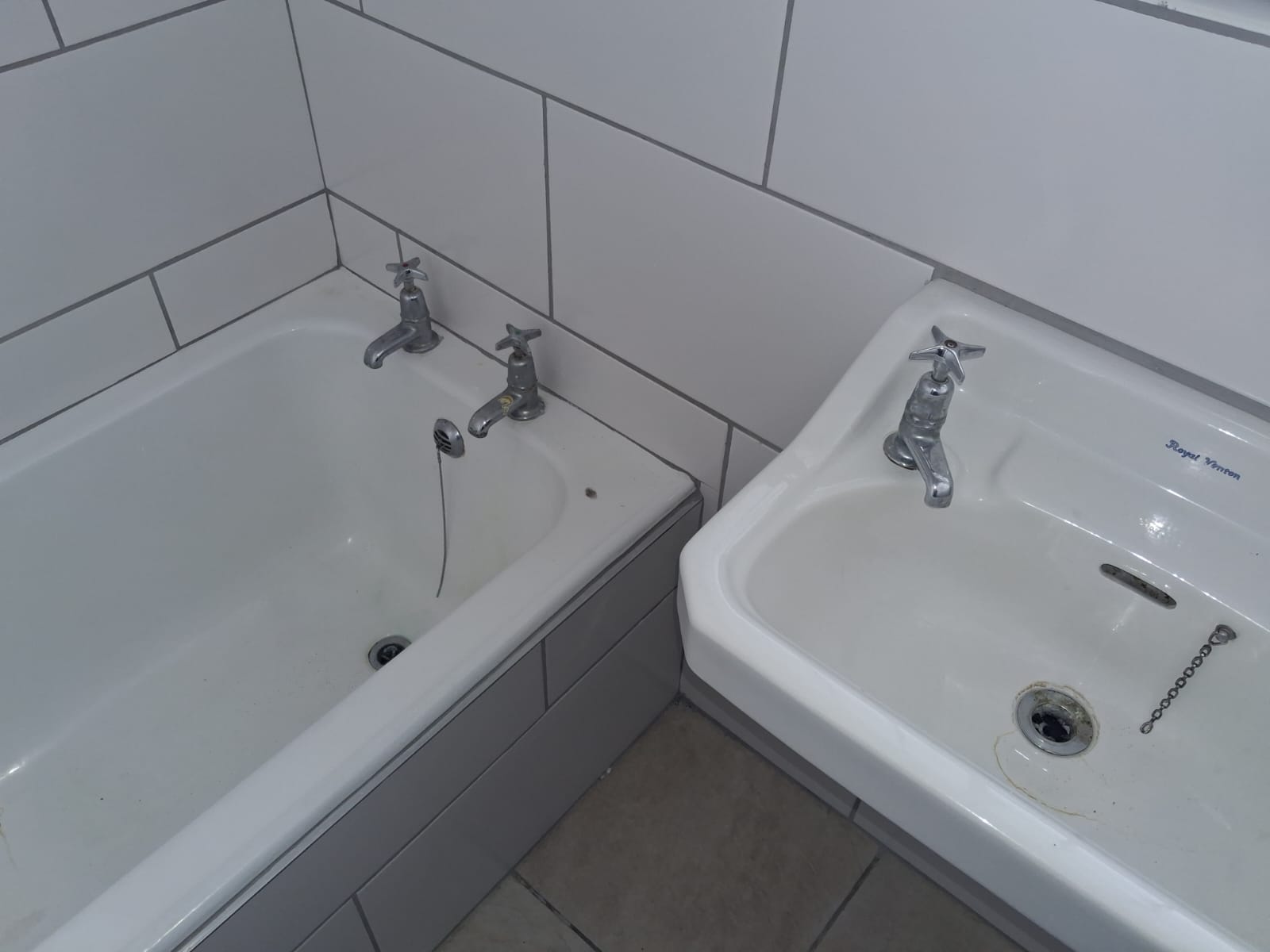 Bathroom: Vanity basin, bath with shower over bath, and a separate toilet.