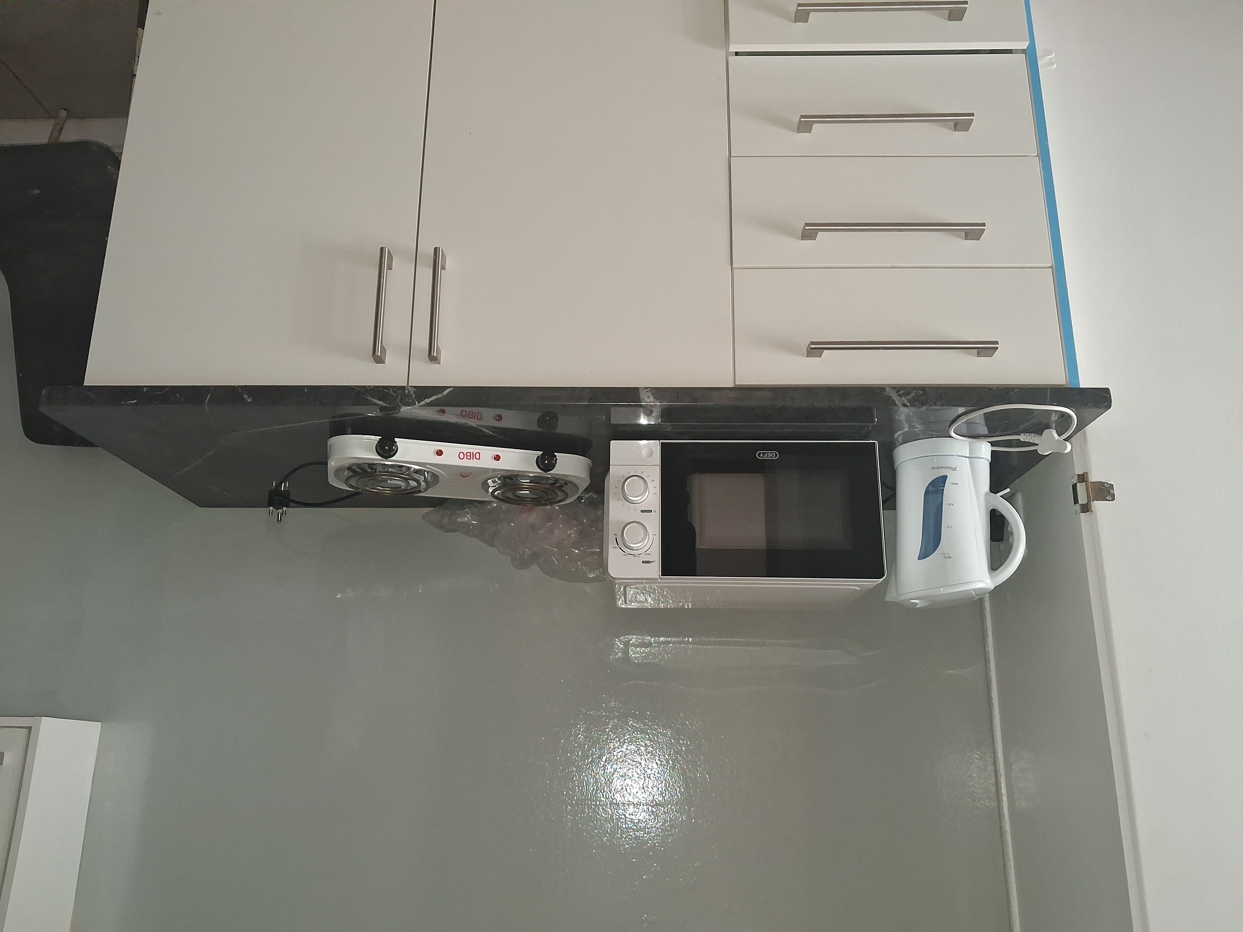 Kitchen: Melamine cupboards with Formica countertops, functional and neat.