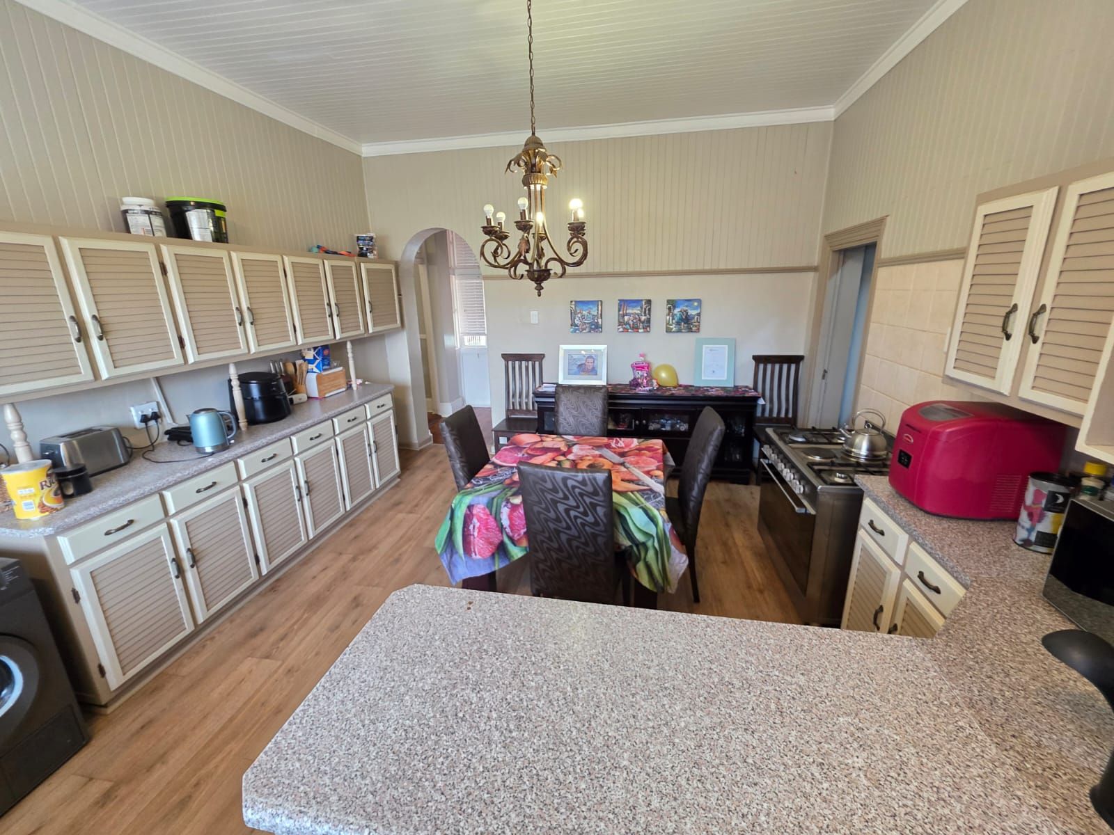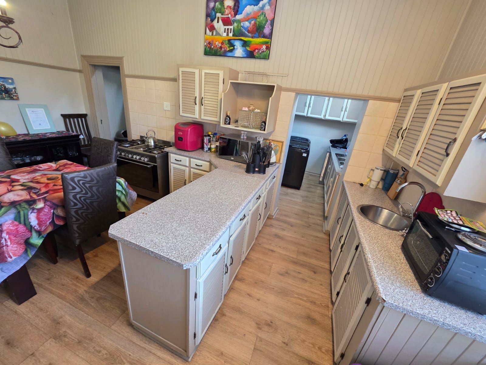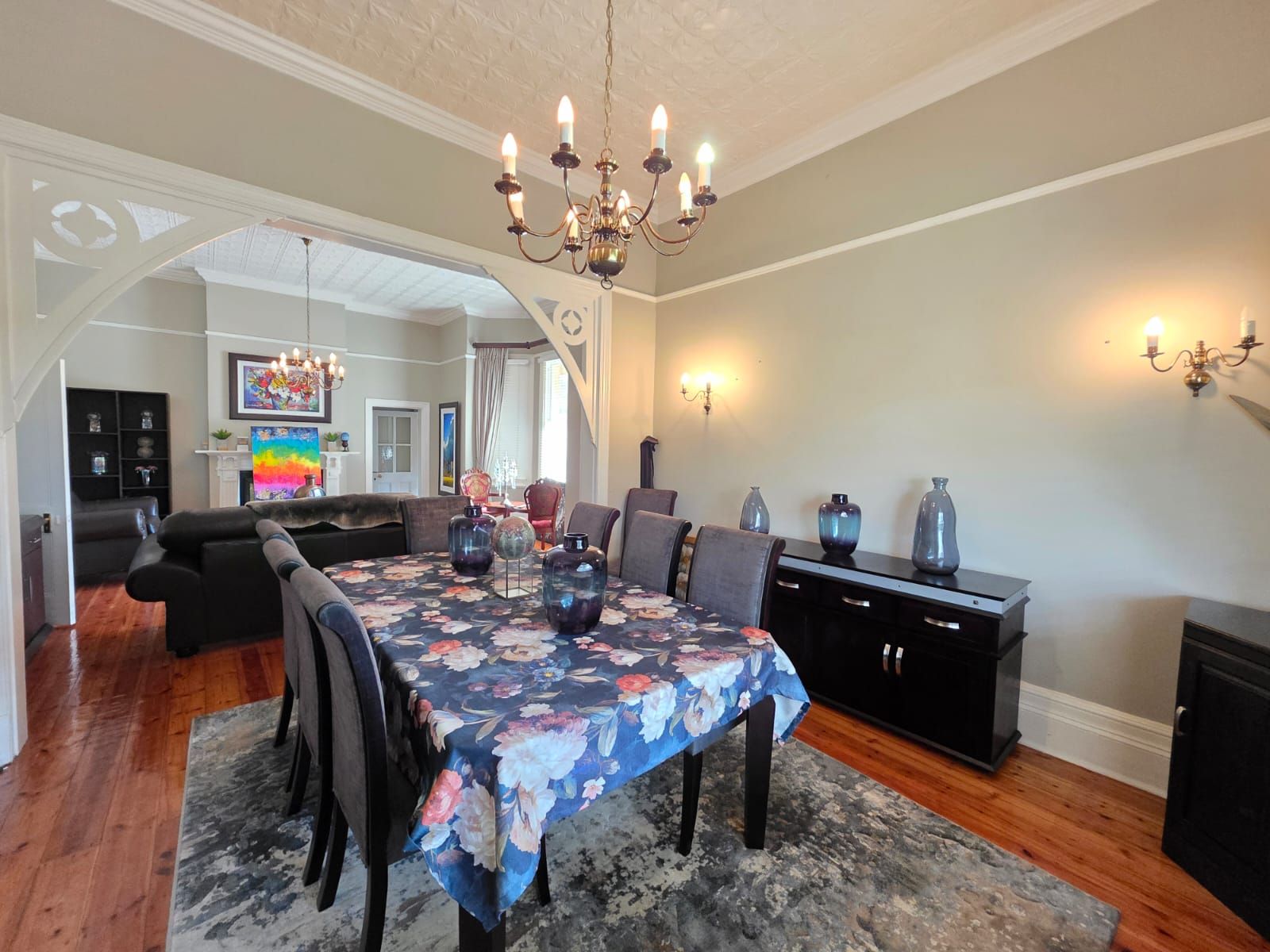 Additional highlights include a separate one-bedroom flat, outside toilet, three garages, and a workshop. Period features such as steel ceilings, beautiful wooden floors, and a cozy fireplace add character and warmth. A JoJo tank ensures water availability, while electric fencing and full perimeter fencing provide peace of mind.