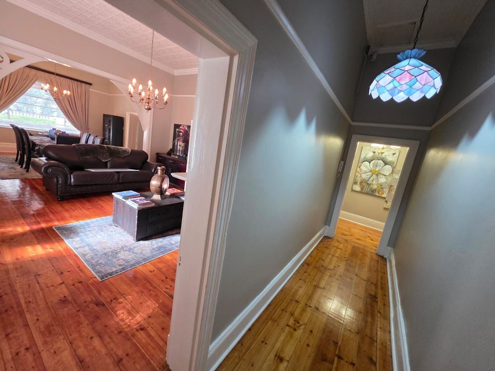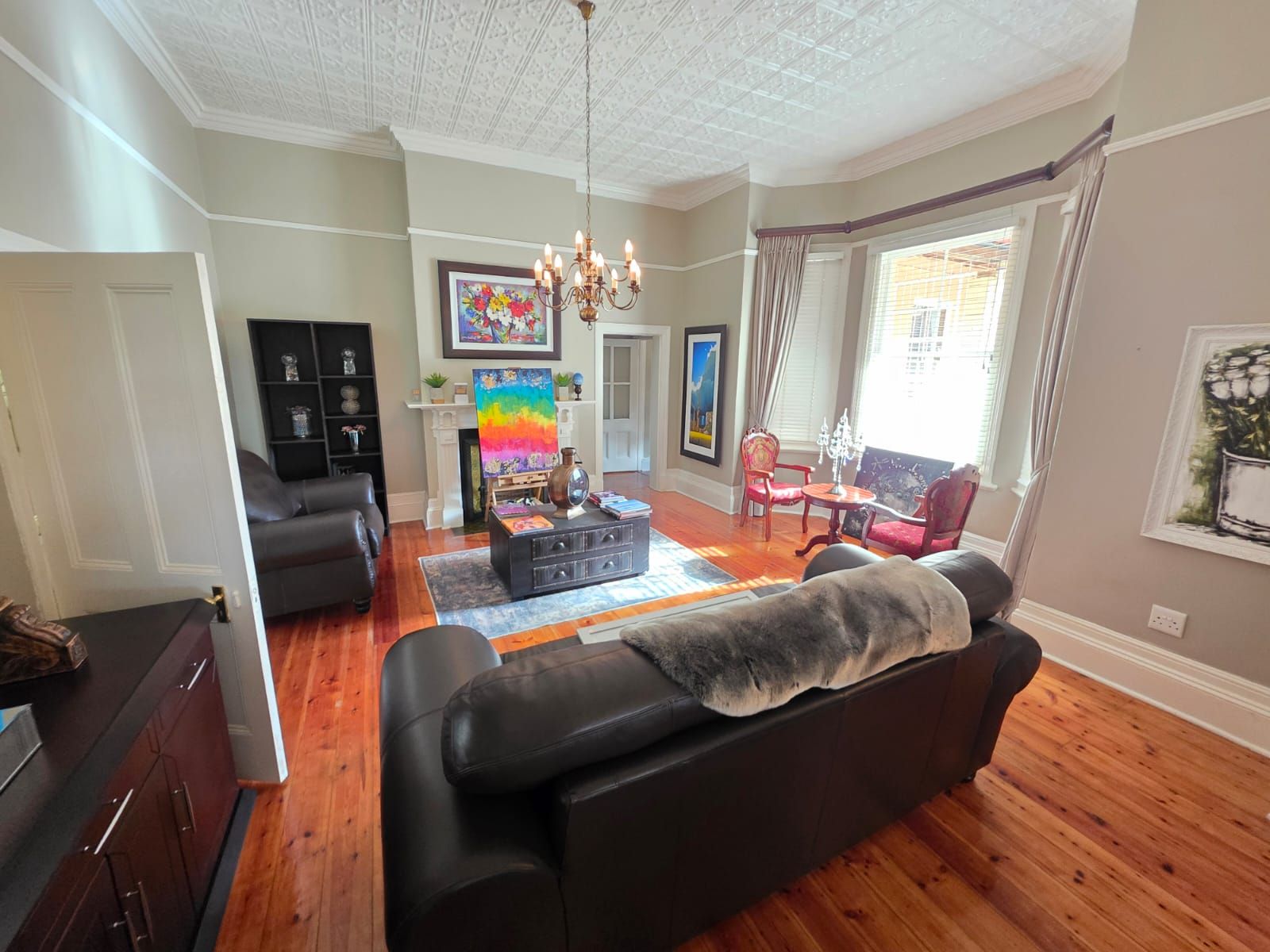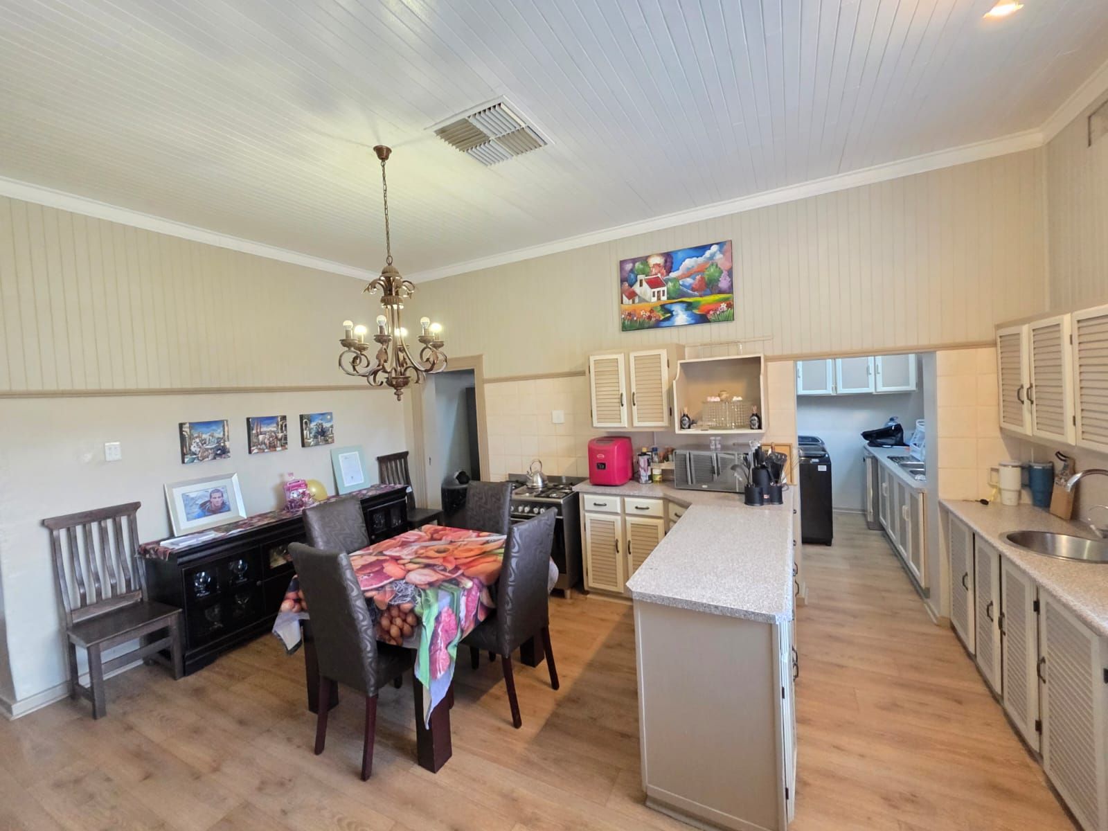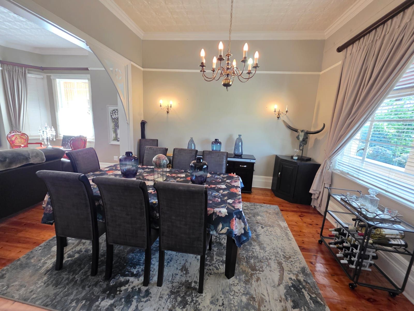 Additional highlights include a separate one-bedroom flat, outside toilet, three garages, and a workshop. Period features such as steel ceilings, beautiful wooden floors, and a cozy fireplace add character and warmth. A JoJo tank ensures water availability, while electric fencing and full perimeter fencing provide peace of mind.