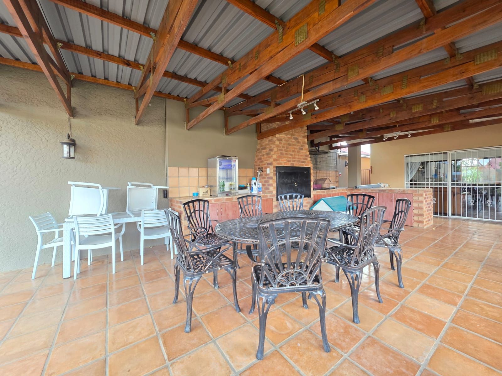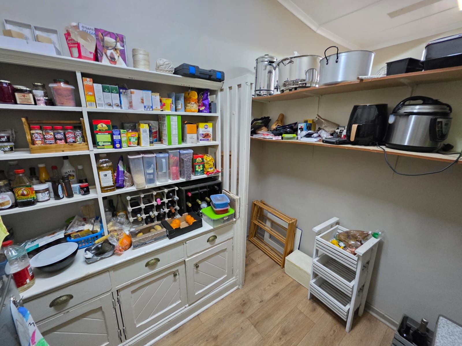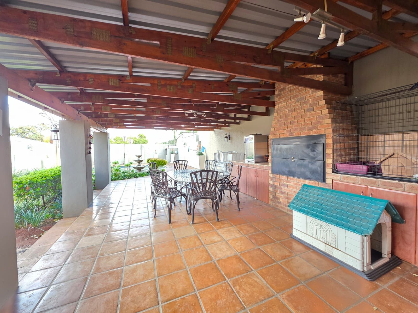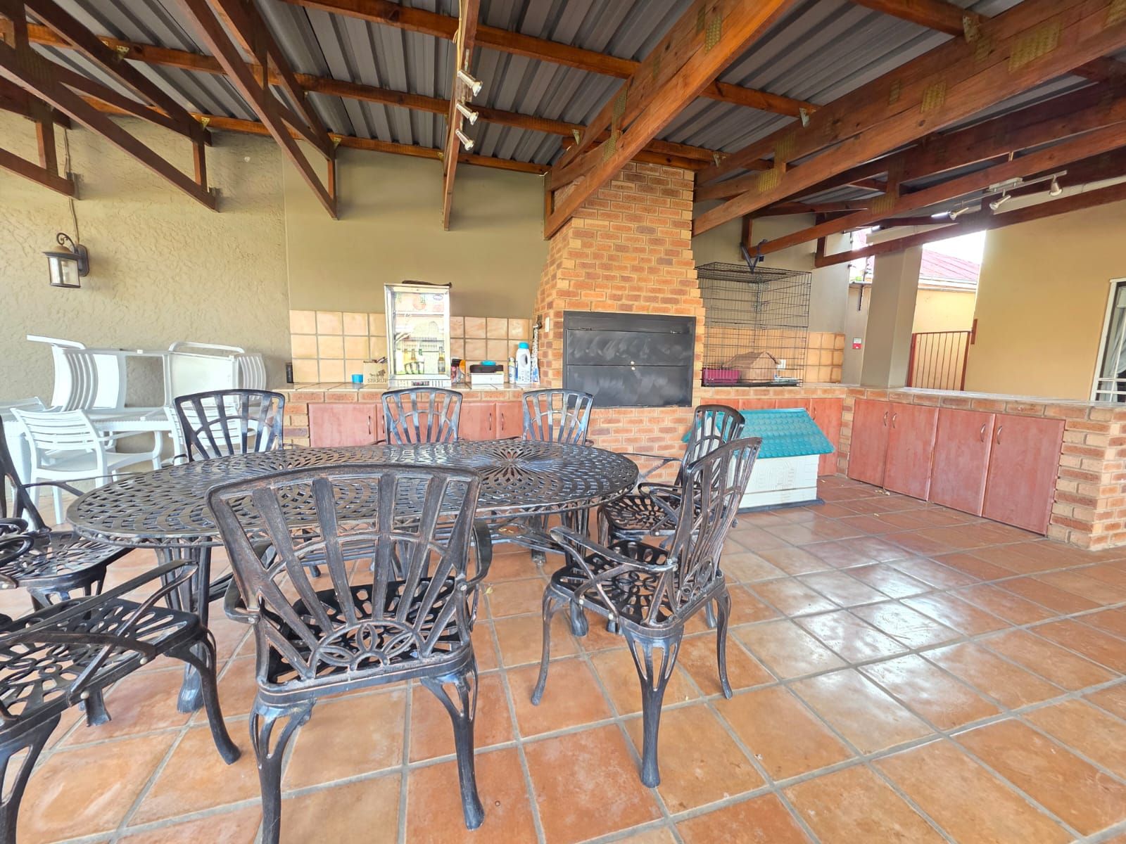 The kitchen is well-equipped with built-in cupboards, a walk-in pantry, scullery, and a dedicated ironing room with additional cupboard space. Entertain effortlessly with an undercover braai area that overlooks a sparkling pool and an immaculate garden.
