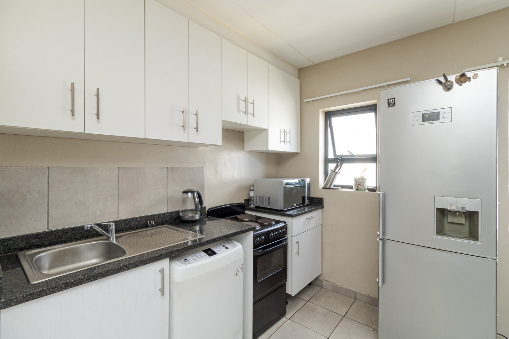 The bright, open-plan living area flows effortlessly into a well-appointed kitchen, complete with plenty of cupboard space. Meticulously maintained, this apartment offers a pristine and welcoming environment, perfect for those seeking a serene yet central place to call home.