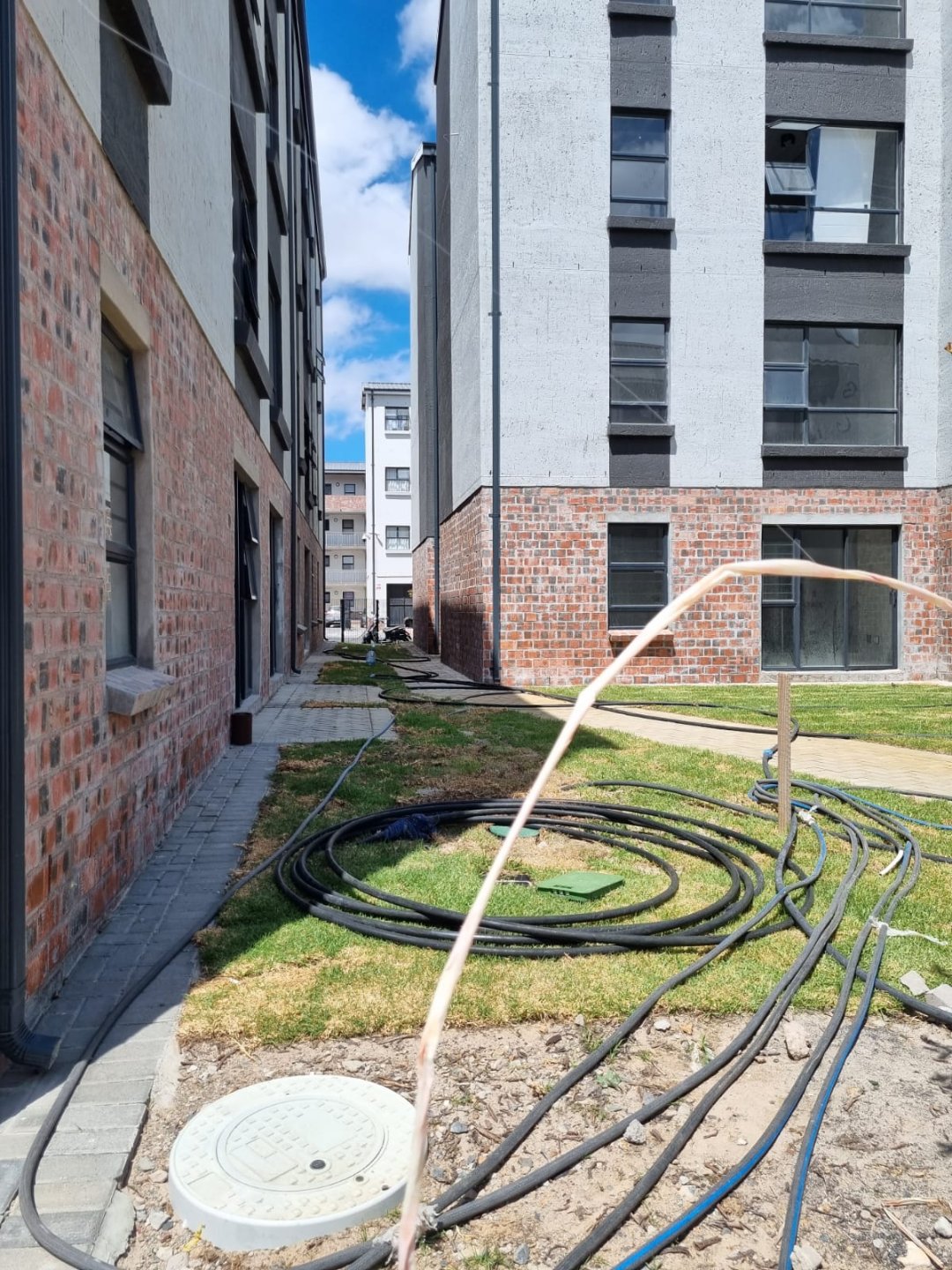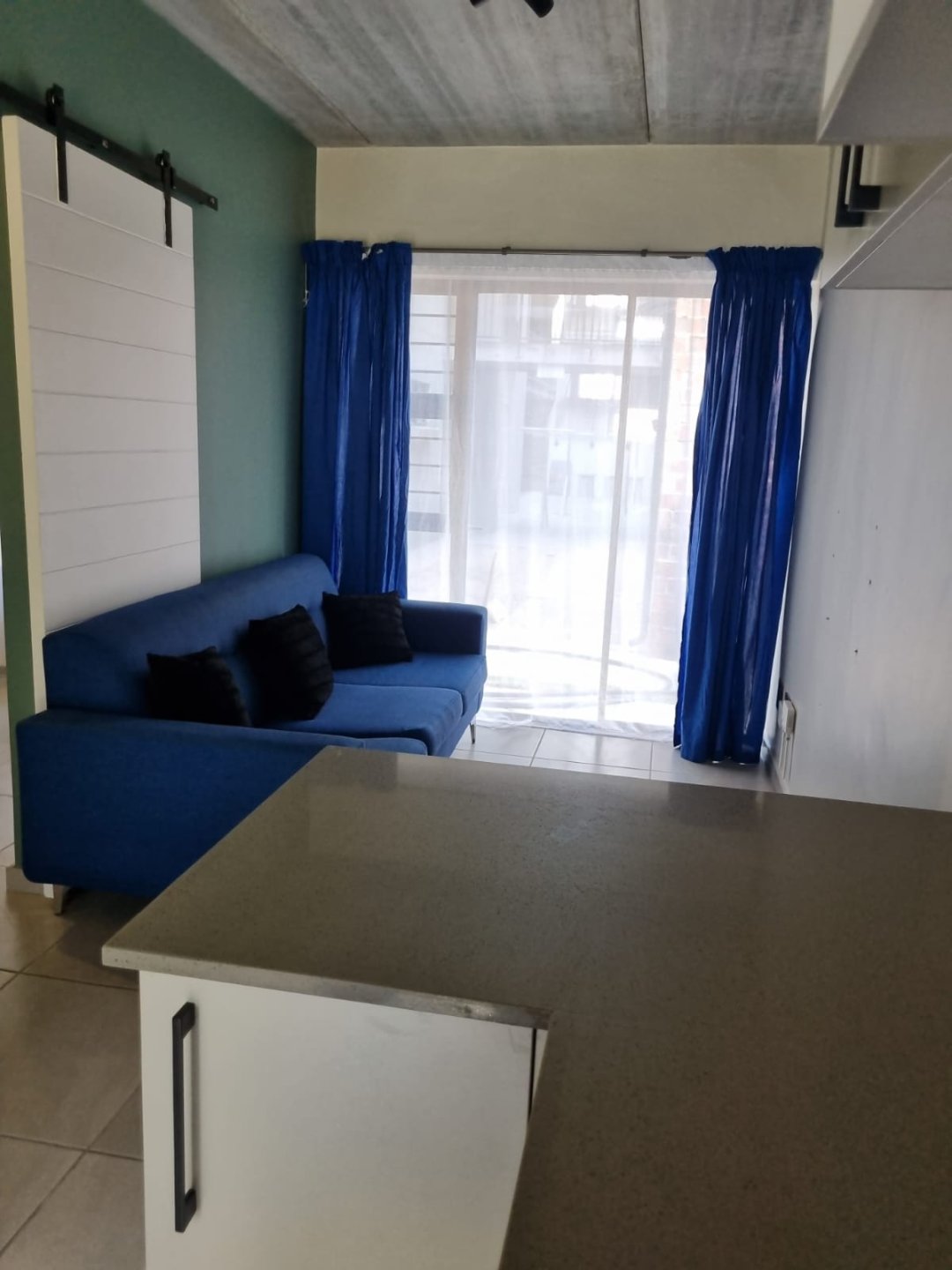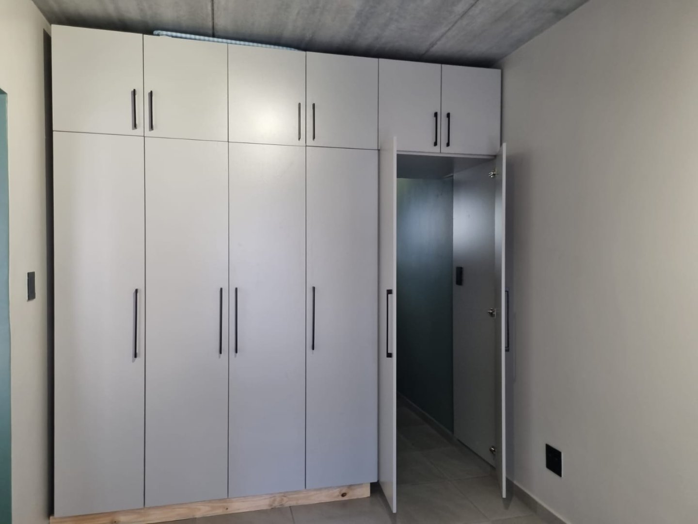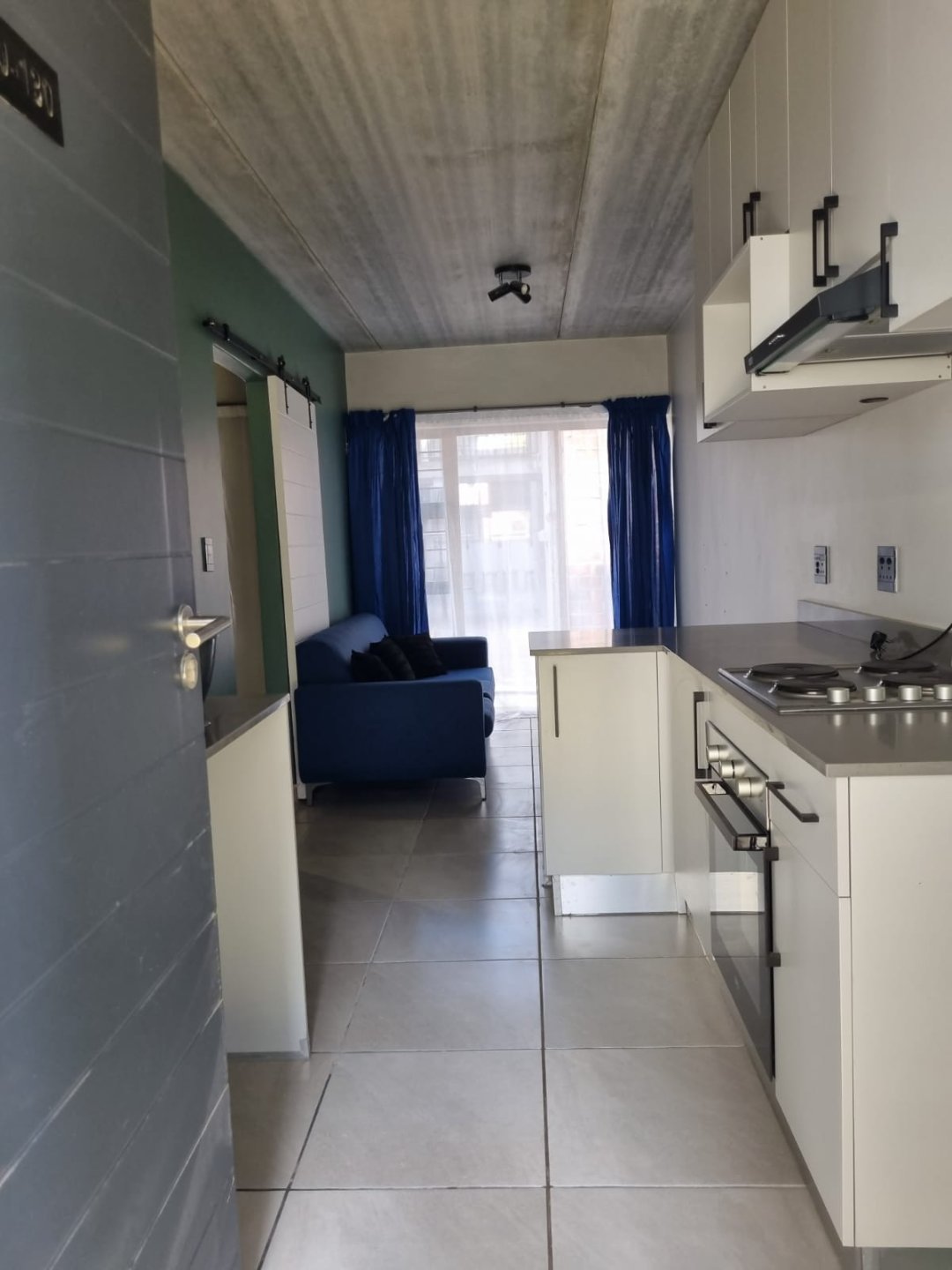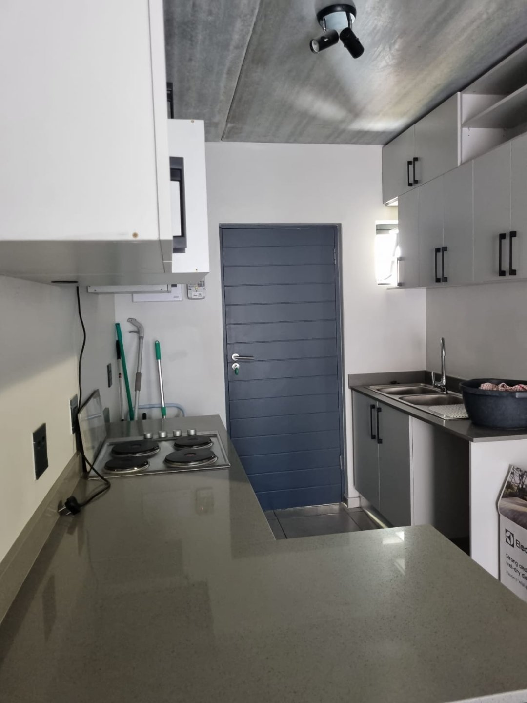 Open plan kitchen with built in stove and oven, built in cupboards and plumbing point for 1 appliance.